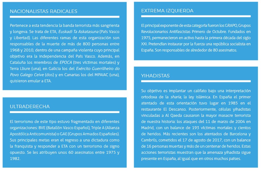 Entre los grupos que se denominan de inspiración "nacionalista radical" se señala a ETA (País Vasco y Navarra), EPOCA y Terra Lliure (Cataluña), MPAIAC (Canarias) y al Exército Guerrilheiro do Povo Galego Ceive (Galicia). Entre los grupos de extrema izquierda a los GRAPO. En ningún caso se menciona que los grupos terroristas de inspiración nacionalista tienen también una fuerte ideología de extrema izquierda.