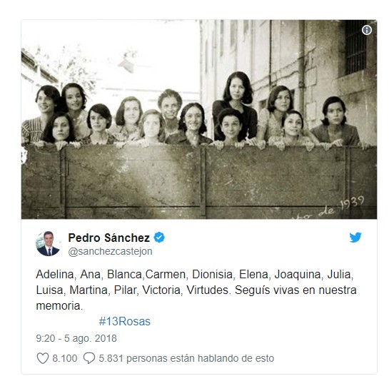 El presidente del Gobierno quiso recordar a las Trece Rosas en el aniversario de su fusilamiento con un tuit pero, en lugar de adjuntar una fotografía de las homenajeadas, Pedro Sánchez subió una imagen de la película Trece Rosas de Emilio Martínez-Lázaro, estrenada en 2007. Le llovieron las críticas en la red social.