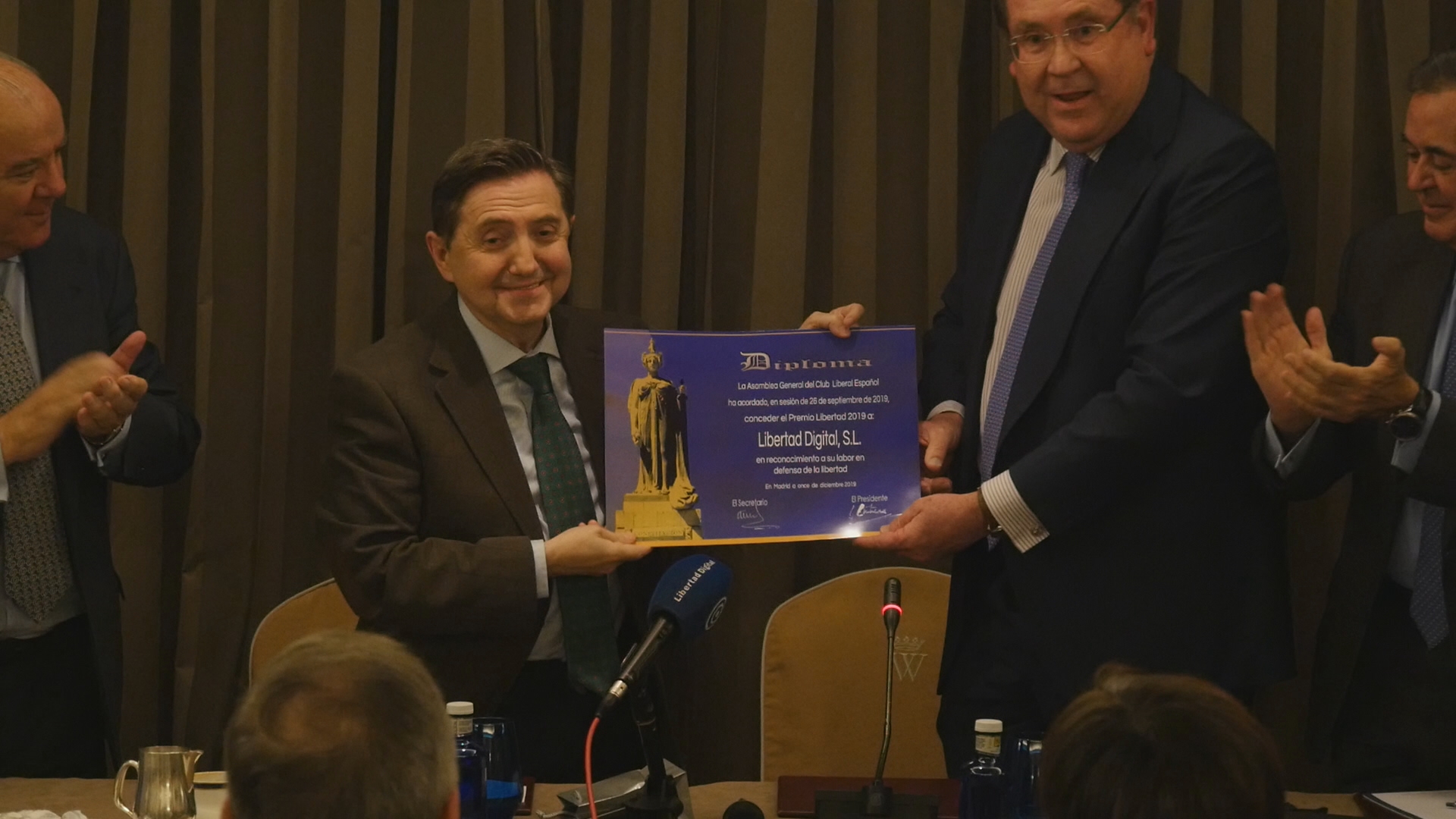 El presidente de LD, Federico Jiménez Losantos, recogió este miércoles en el Hotel Wellington de Madrid el Premio Libertad 2019, concedido por el Club Liberal Español a Libertad Digital por, según el presidente de la entidad, Fernando Entrena, "defender la libertad" de una forma constante y desde la independencia: "Para los que creemos en la libertad, Federico es un estímulo y nos da un balón de oxígeno". Tras recoger el diploma, el director de Es la mañana de Federico de esRadio pronunció un discurso en el que se remontó a los orígenes del "régimen liberal democrático" español, hasta llegar a "la cuestión de fondo" del presente: "Los liberales tenemos que prepararnos para la resistencia. Todo pinta muy mal y no hay oposición".