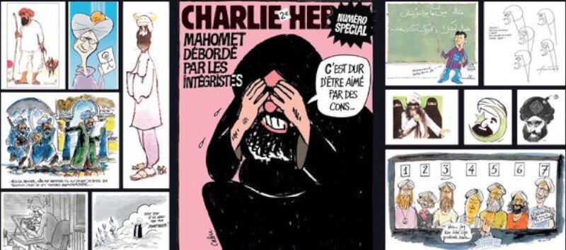 Se trata de una serie de doce dibujos que fueron retomados en 2006 por Charlie Hebdo tras su publicación en septiembre de 2005 en el diario danés Jyllands-Posten. En ellos aparece una caricatura del profeta llorando de rodillas y con el mensaje "Es duro ser amado por idiotas". Una ilustración de Cabu, asesinado en el atentado del 7 de enero de 2015. "Todo para esto", lleva en portada este número especial de los juicios, con un montaje que incluye todos los dibujos de aquella polémica edición.