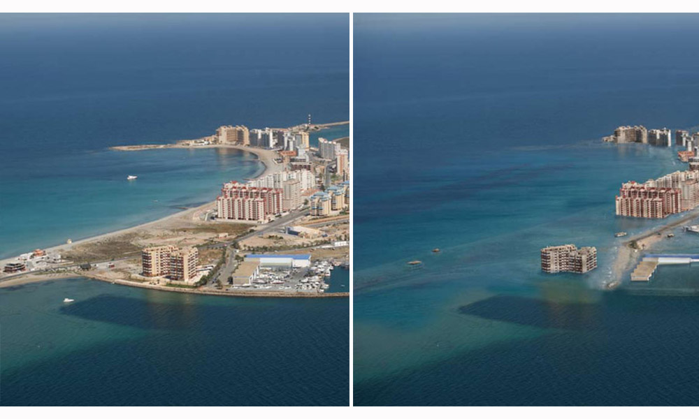 Greenpeace presentaba unos campos de naranjos en Valencia convertidos en secarrales; las Tablas de Daimiel, secas; los bosques del Parque Natural de los Alcornocales, quemados; el Ebro reducido a un arroyo a su paso por Zaragoza; el glaciar del Monte Perdido, fundido; la fauna de las islas Cíes, arrasada; Navacerrada transformada en un solárium; y los edificios de la Manga del Mar Menor, bajo un mar desbordado.