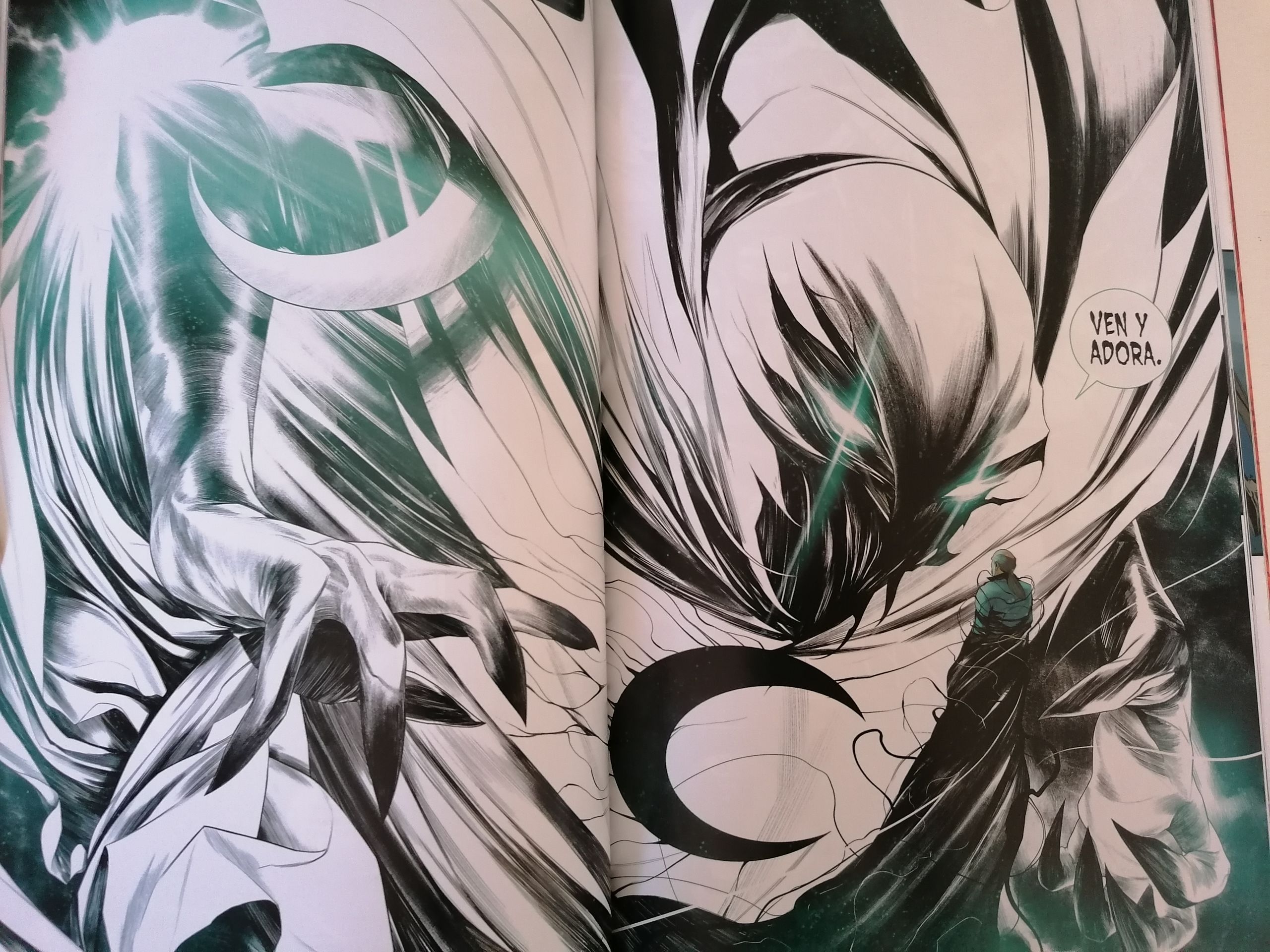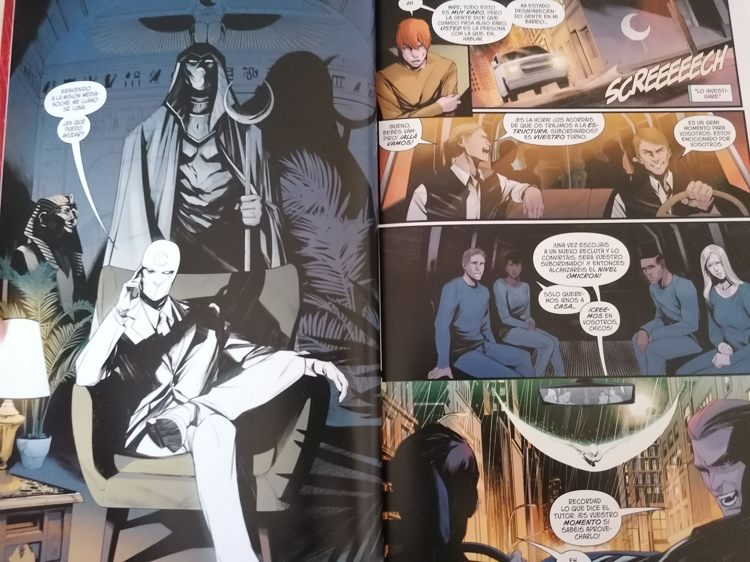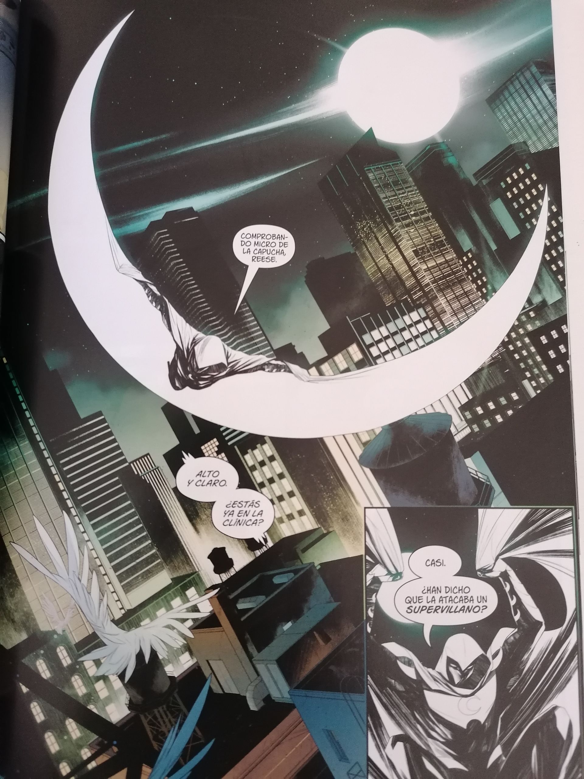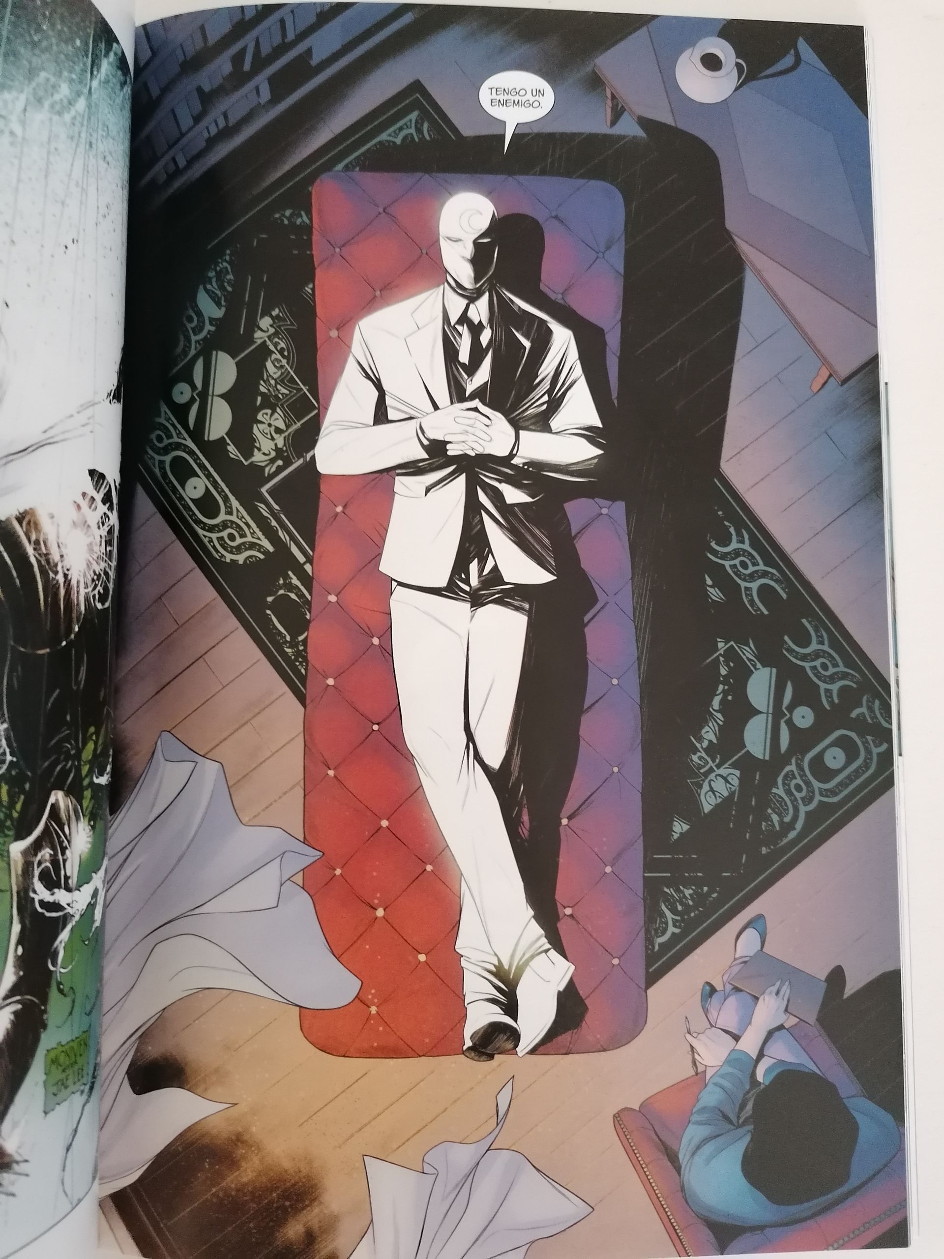 En mi opinión es un buen comienzo para este cómic. Rápido te metes de lleno en la historia y además le añade ciertos elementos que se agradecen en una lectura. Para aquellas personas que no conozcan al Caballero Luna y vean similitudes con Batman por su aspecto... tienen razón. Se parecen. Siempre se ha dicho. Pero hay diferencias notables. Por ejemplo el sentido del humor, más evidente en la luna que en el murciélago. Y como no, que uno tiene una personalidad traumatizada, pero el otro tiene hasta cinco personas dentro de su cabeza. Aquí encontramos de lleno los problemas mentales de Marc Spector. No lo esconden sino que los analizan. Le dan visibilidad. Los exploran. Y sí, es parte del encanto del personaje y del cómic. Sus charlas sobre su trastorno de identidad disociativo (TID) con su psicóloga son oro puro y aunque ciertas cosas necesitan un conocimiento previo de la historia y del personaje, no son estrictamente necesarias.