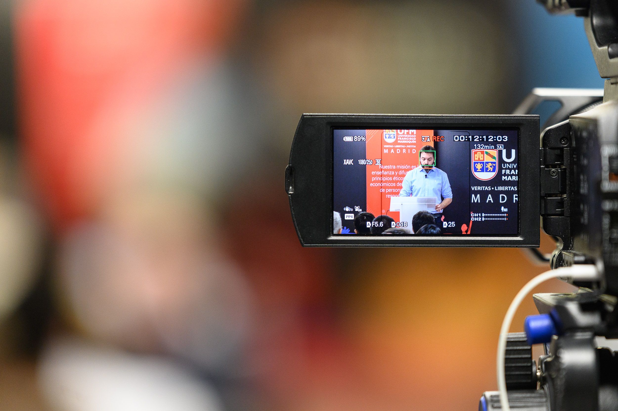 Un momento de la conferencia de Juan Rallo, a través de la pantalla de una cámara de vídeo.