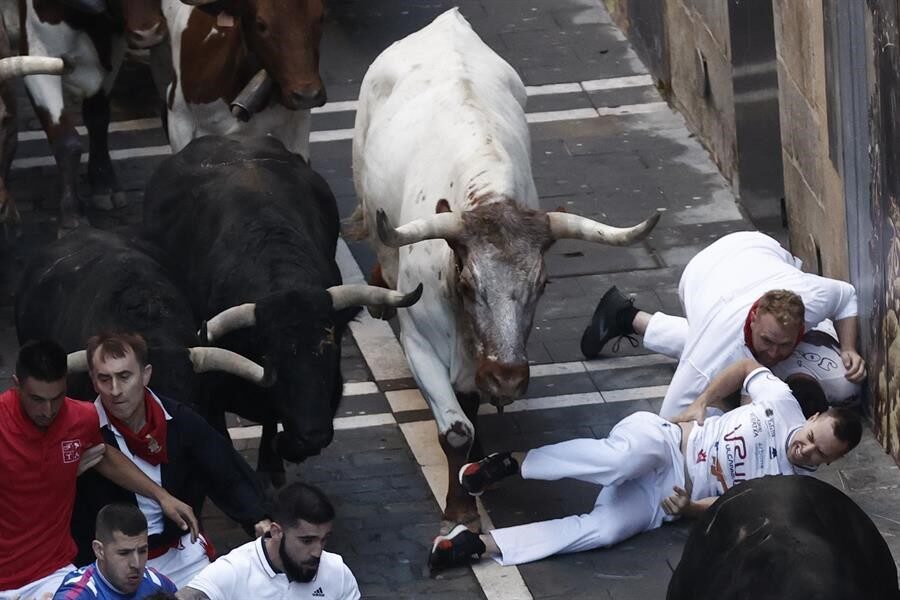 Al llegar a la curva con la Estafeta un corredor se ha caído delante de la manada, que ha pasado por encima pero sin entretenerse con él, acercándose a la parte izquierda que la torada ha barrido durante unos metros con varios mozos caídos en la calzada, donde uno de los animales se ha separado para hacer el resto del recorrido ya a distancia de sus hermanos.