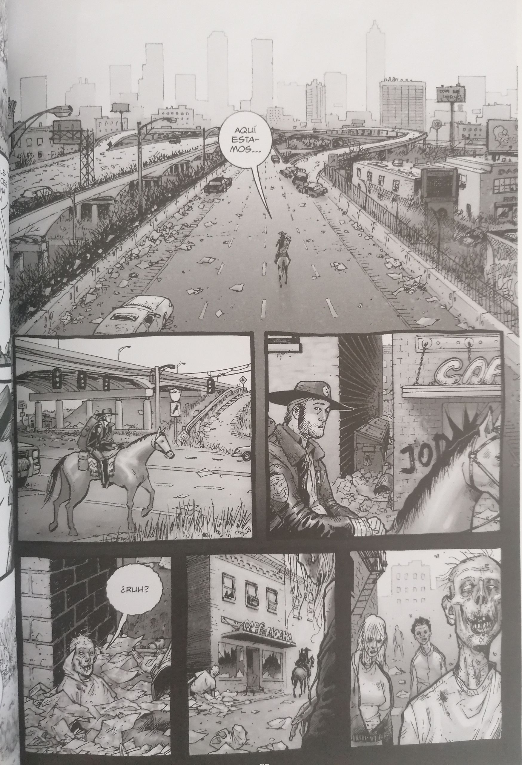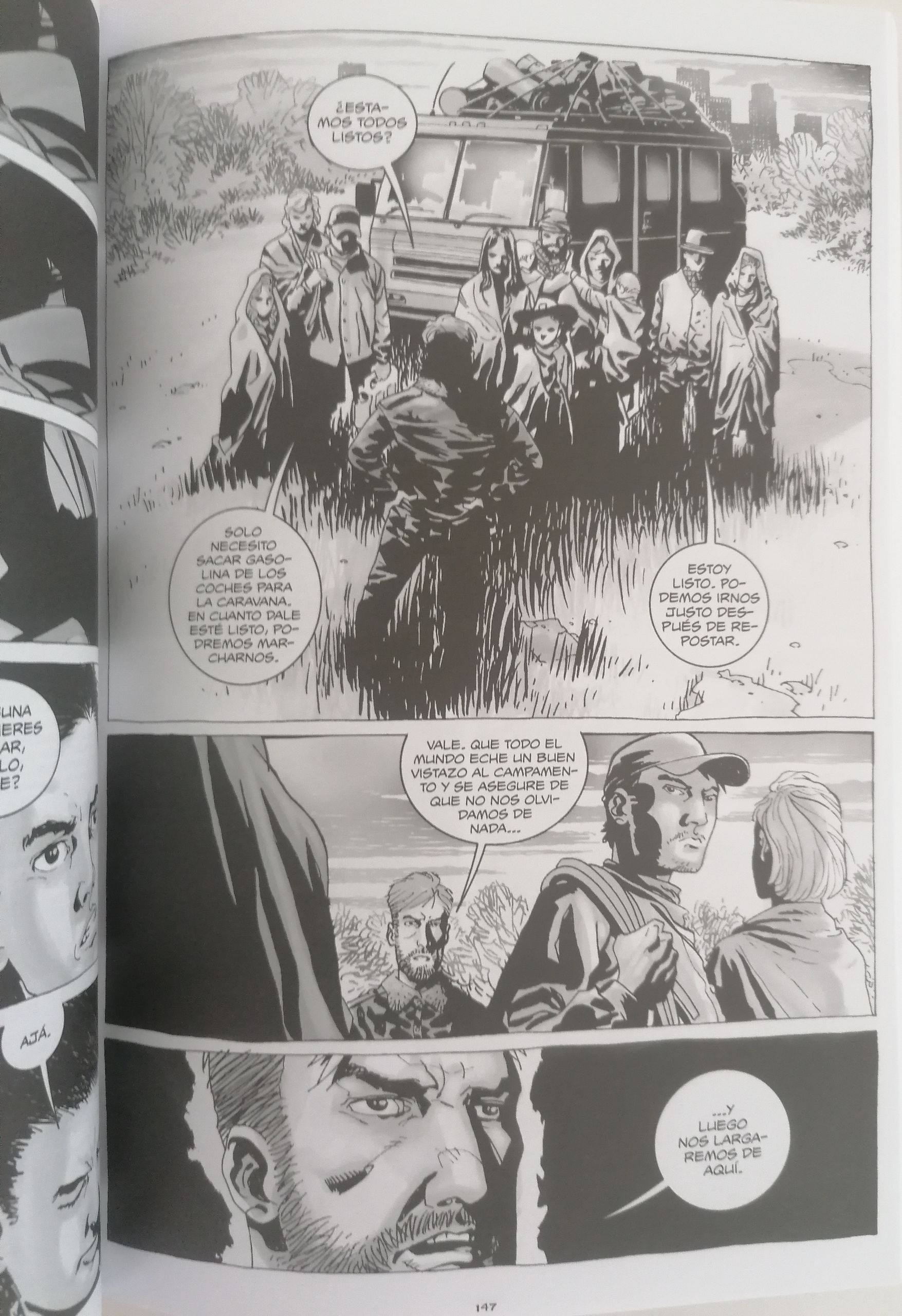 En cuanto al dibujo, poco más que decir salvo que estamos ante una obra maestra. En este volumen tenemos a Charlie Adlard y Tony Moore dejando patente que otro de los puntos fuertes de The Walking Dead es precisamente el impacto visual que provoca en el lector. Los escenarios, de todo tipo, son espectaculares y absorbentes. Los personajes y su expresividad en momentos de pánico y alegría son ejemplares. Y el uso del blanco y negro original, aunque haya ediciones en color, es un acierto de principio a fin. Para gustos, los colores, nunca mejor dicho, pero creo que el dramatismo, el terror, la tensión y la fuerza de la narración quedan perfectamente recogidos con ese juego de sombras y luces que el blanco y negro otorga a los que lo eligen. Si me pedís opinión porque no sabéis si esta obra es mejor leerla en blanco y negro o en color... pues no hay color, nunca mejor dicho.