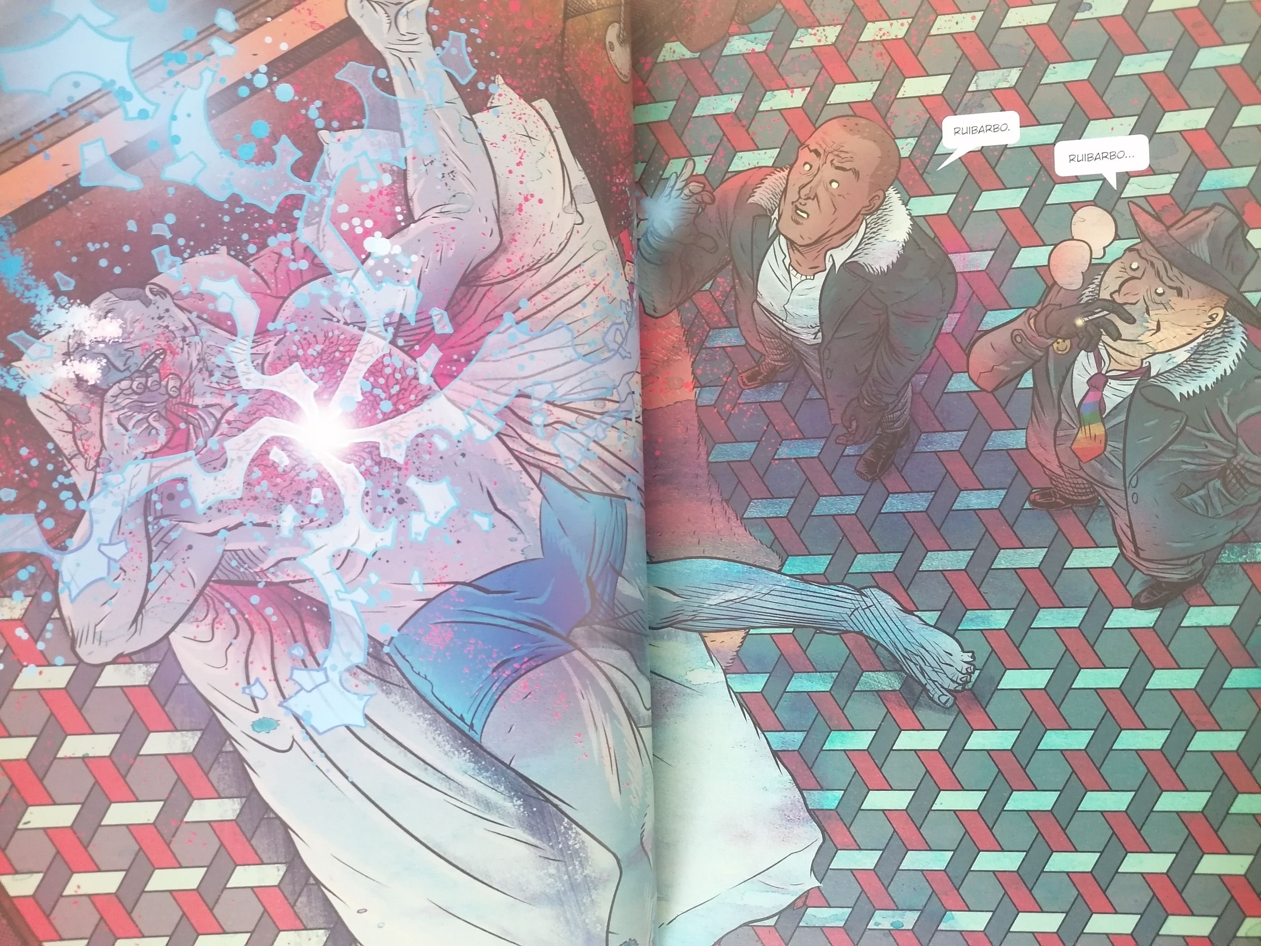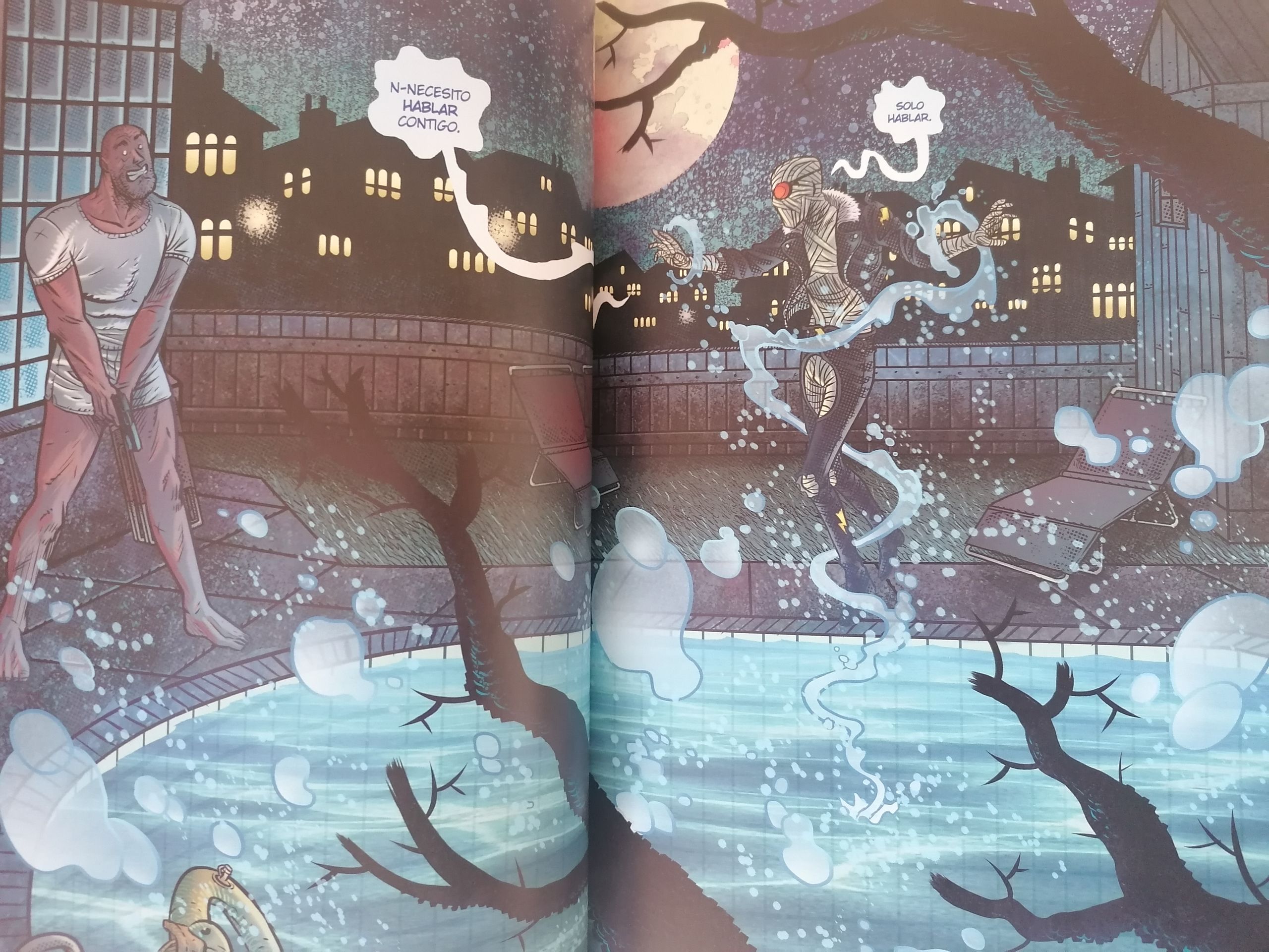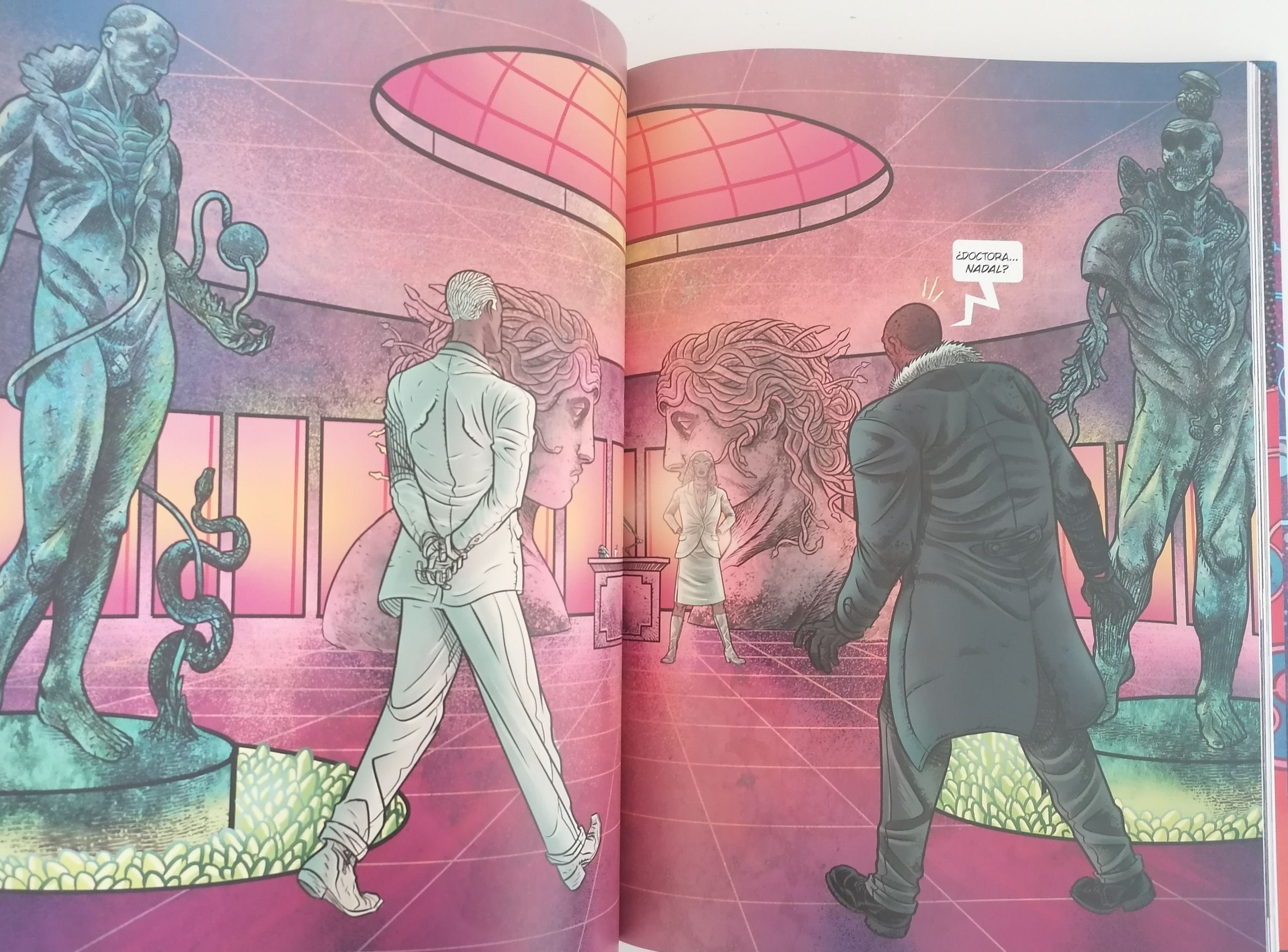 Como digo, este tipo de obras son ejercicios que, más allá de la historia en sí, sumergen al lector en un universo en el que la ciencia ficción desborda los límites de la realidad de manera contundente. No se queda a medias. Aquí no podrás tomar un bocado de este género, cerrar el cómic y hacer otra cosa. Aquí tienes que comerte el pastel cósmico entero y ojo, ni mucho menos empalaga. Tanto en dibujo como en color, en este Cosmic Detective no es que haya alguna que otra Splash Page que te deje con la boca abierta sino que las hay continuamente en un formato visual de viñetas que oscilan entre composiciones enormes y otras gigantes. De hecho, su velocidad de lectura es rápida, llegando incluso a pasar por partes del cómic en las que no se dice ni una sola palabra. Bueno, miento, no es una lectura rápida si, como recomiendo, te detienes a apreciar todo el carrusel de elementos que componen cada viñeta. Eso lo logra David y desde aquí le doy mi enhorabuena por un magnífico trabajo.