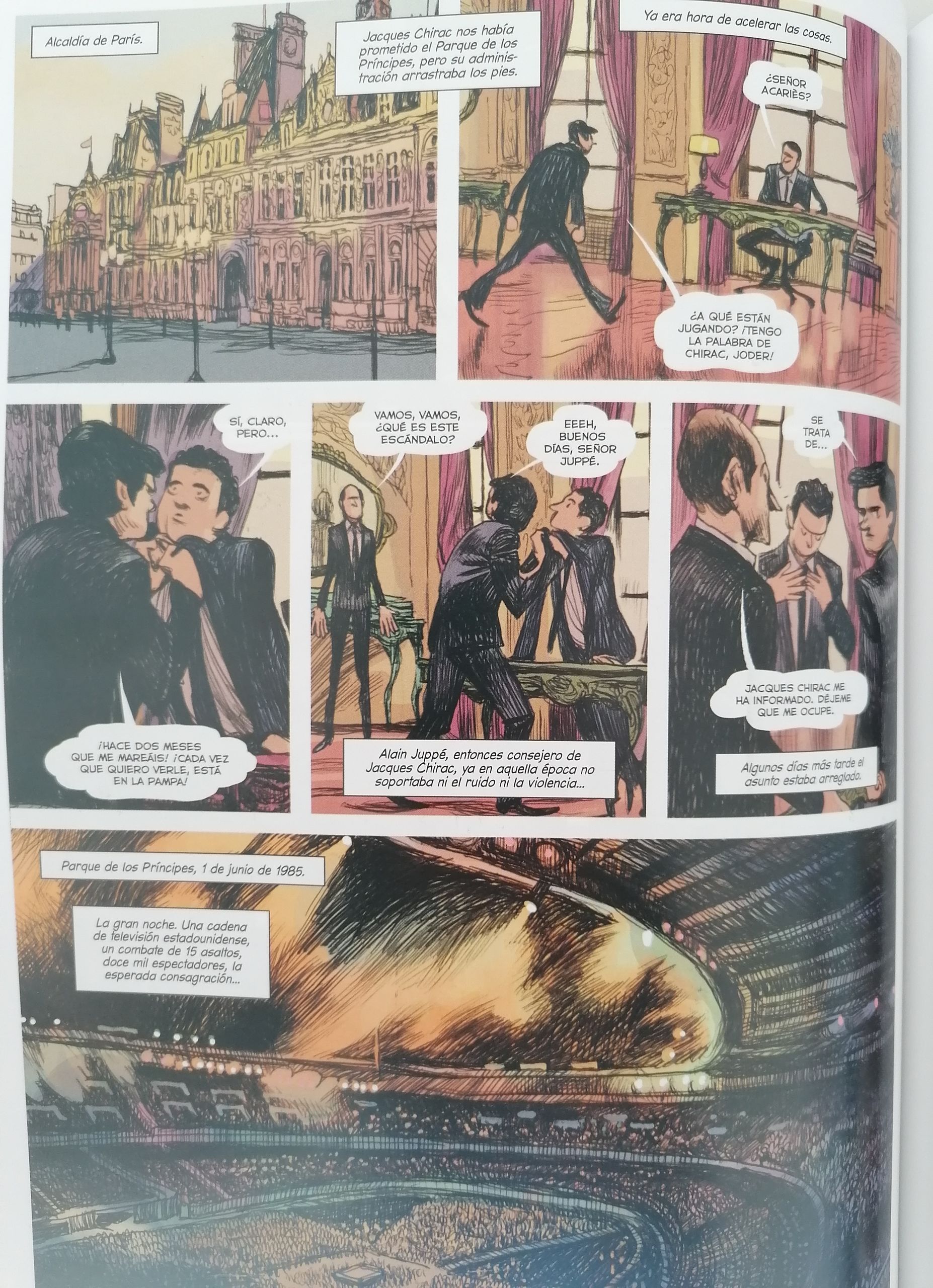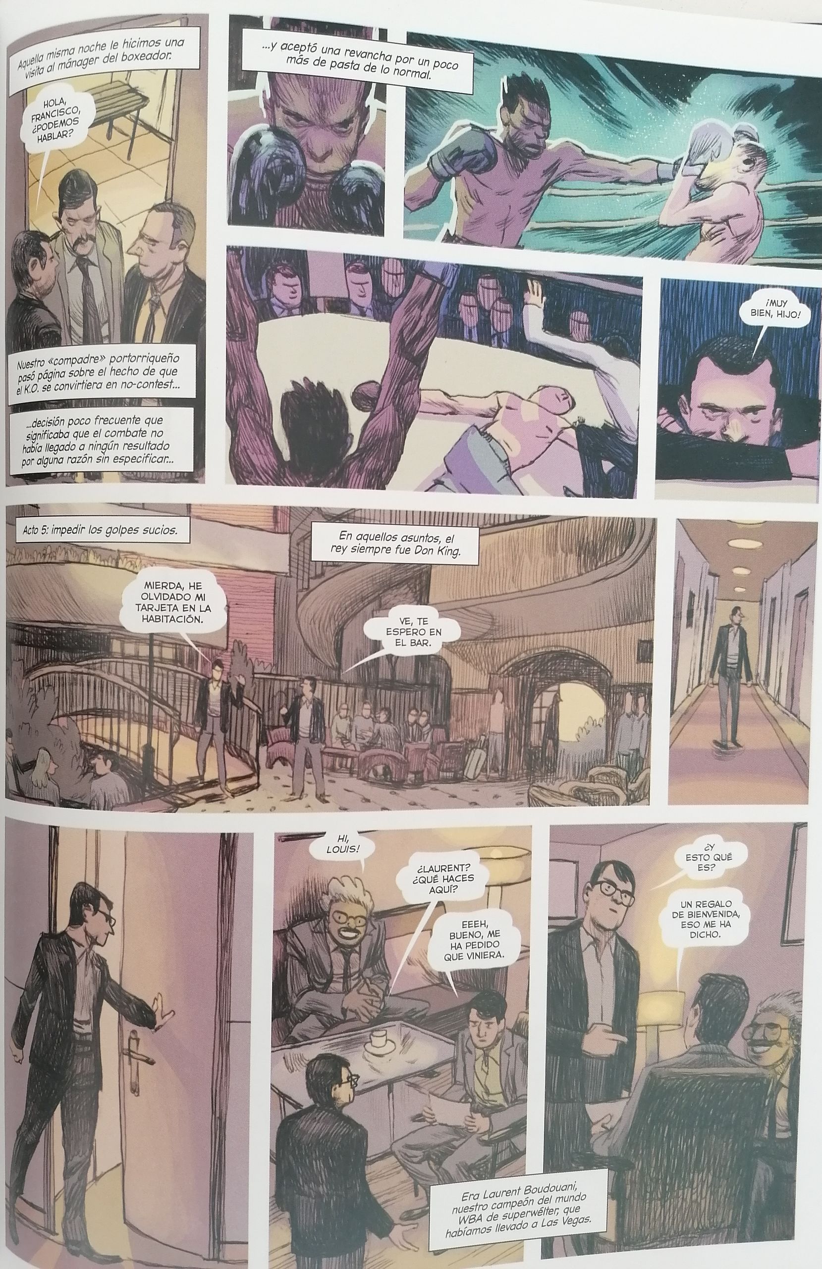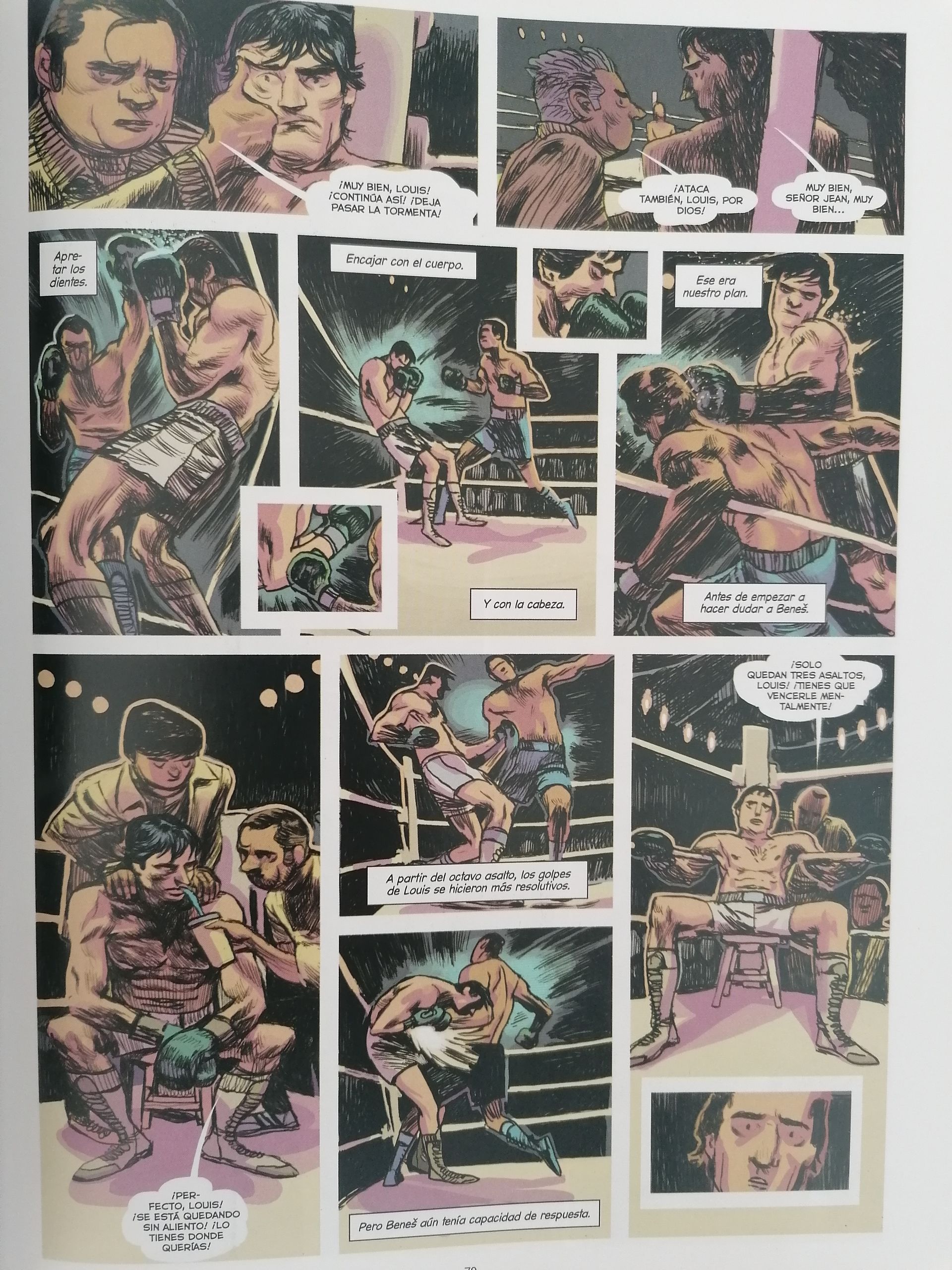 Por otro lado es imposible obviar que el boxeo es el 70% de la historia. Michel hará las funciones de narrador de la historia y será él el que nos cuente las proezas y sinsabores de la carrera de su hermano Louise. Pero no solo eso, ya que el propio Michel, promotor de éxito en su época, nos meterá de lleno en el mundo de la organización y negociación de este tipo de combates. Viajaremos por todo el mundo con ellos. Conoceremos la soledad del boxeador y el oscuro mundo de dinero e intereses que se esconde detrás de cada pelea. Nos sentaremos en la misma mesa que el mítico promotor Don King e incluso nos cruzaremos en el camino de grandes boxeadores como el mexicano Julio César Chávez, Muhammad Ali o Tyson. Este cómic ofrecerá combates, perfectamente reflejados a nivel de dibujo y en escenarios imponentes, como por ejemplo, el Parque de los Príncipes de París. Es, a fin de cuentas, un relato de amor al boxeo que analiza tanto su parte buena como su parte más codiciosa e interesada.