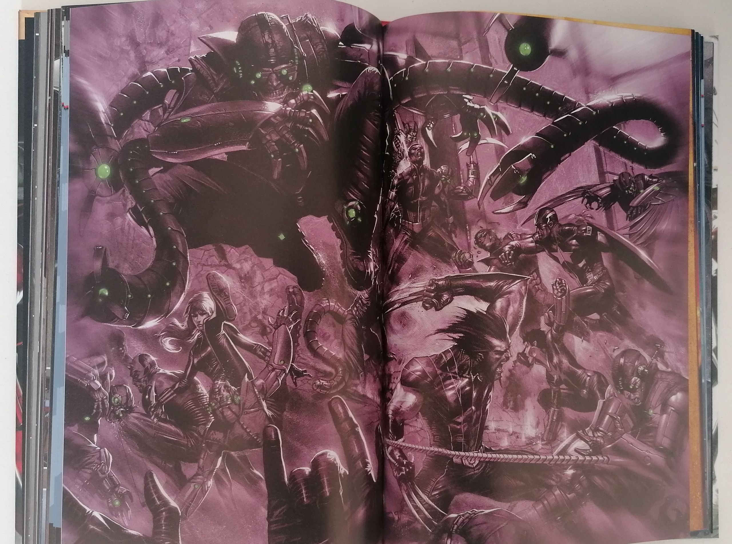 Comentada la sinopsis, han quedado claros en pocas líneas los puntos más importantes de esta historia. La parte superheróica la tenemos garantizada con personajes de un nivel alto de popularidad dentro del universo Marvel y también con otros que, menos mediáticos en principio, son un clásico de este mundo. Lógicamente Lobezno, Capitán América o Spiderman lideran el apartado de actores estrella, pero ni mucho menos hay que dejar de lado la figura de Viuda Negra o Daredevil. De hecho, en opinión de un servidor, la participación de Daredevil aporta muchísimo a esta historia y le otorga un papel principal aunque pueda parecer que está a la sombra de otros. Además Bendis incorporará más personajes a la historia según se vaya acercando el final y ya les puedo garantizar que los amantes de las batallas en formato ‘splash page’ no quedarán defraudados con este cómic.