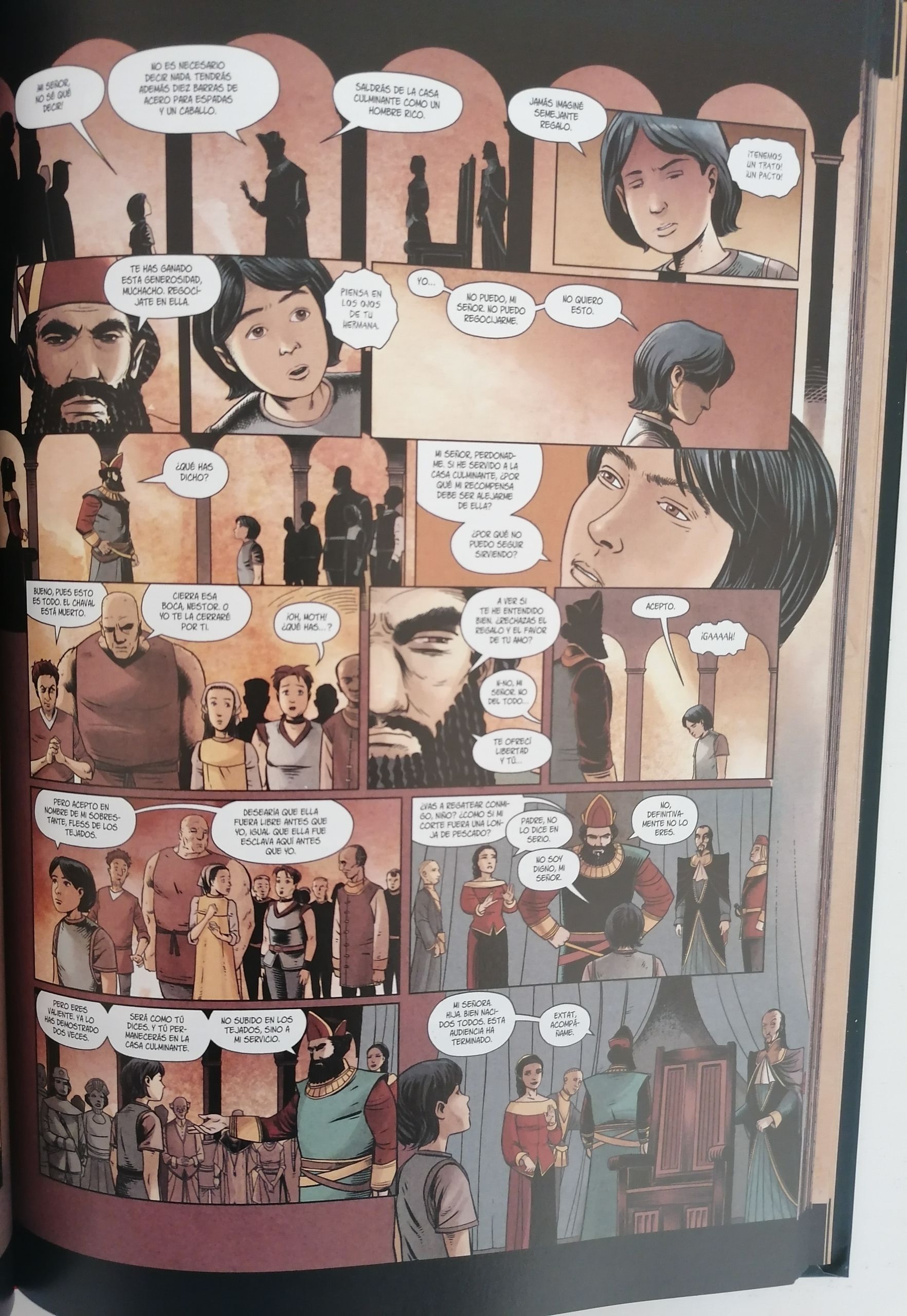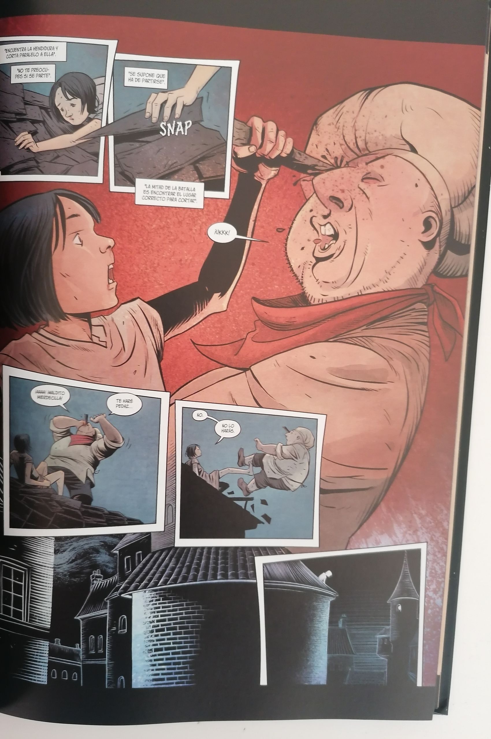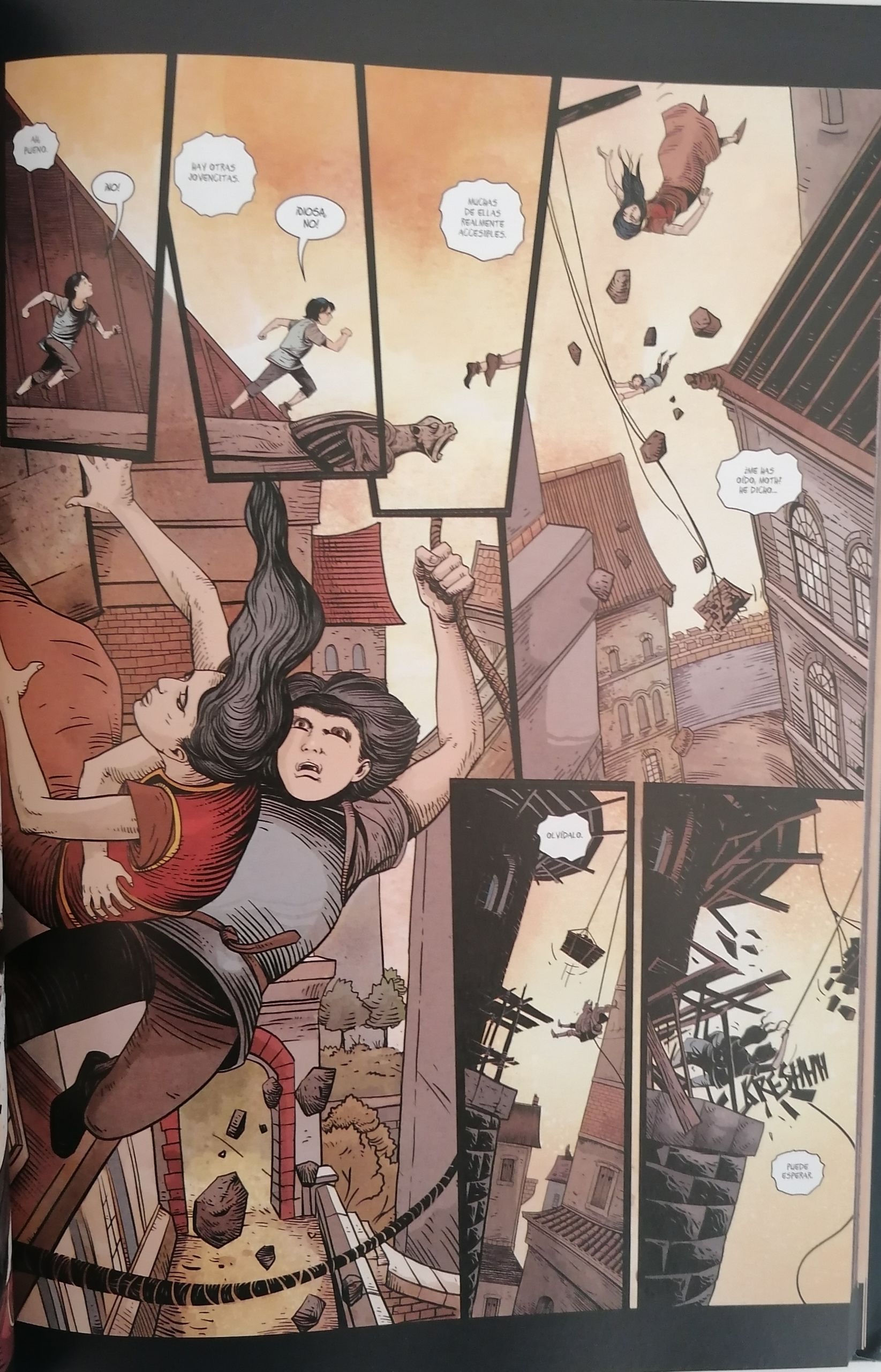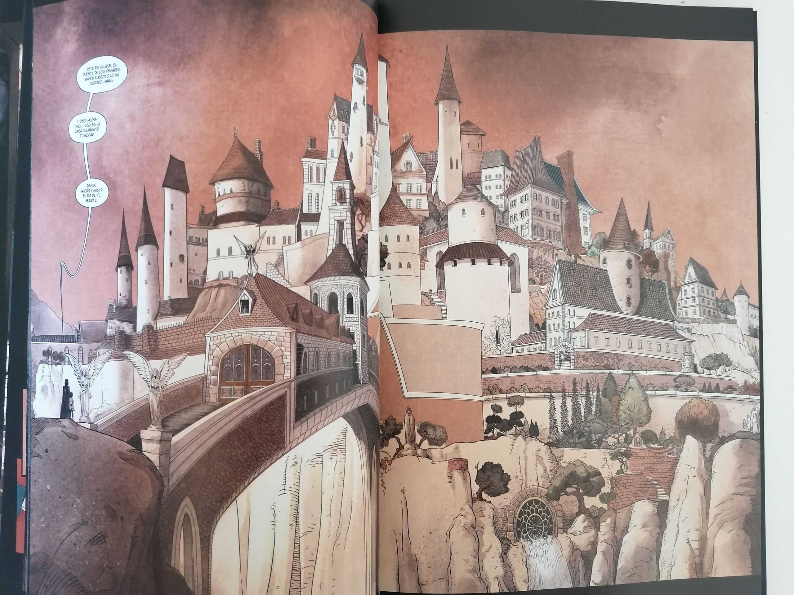 Ahora bien, la historia cumple, el dibujo es más que notable, pero... hay un pero importante y en este caso lo encuentro en el tamaño de la edición. Es un cómic que demanda sí o sí un tamaño mucho más grande y no el que nos encontramos aquí. Tanto por la estética como por la lectura. Por momentos es bastante complicado no dejarse los ojos leyendo los pequeños bocadillos apilados entre tantas viñetas que están pidiendo a gritos más espacio en el que mostrarse. Esa sensación de acumulación puede ‘golpear’ a los lectores más veteranos en edad y experiencia, además de que impide que el gran dibujo de Peter Gross se muestre en plenitud. No es lo mismo tener unas preciosas vistas desde lo alto de los edificios o sentir la grandiosidad y el poder de la Casa Culminante en un tamaño europeo que tener las dimensiones más reducidas de esta edición. No es lo mismo, se lo aseguro, y eso me resta puntos positivos a la experiencia. Es el gran ‘pero’ que le encuentro, porque todo lo demás me ha gustado.