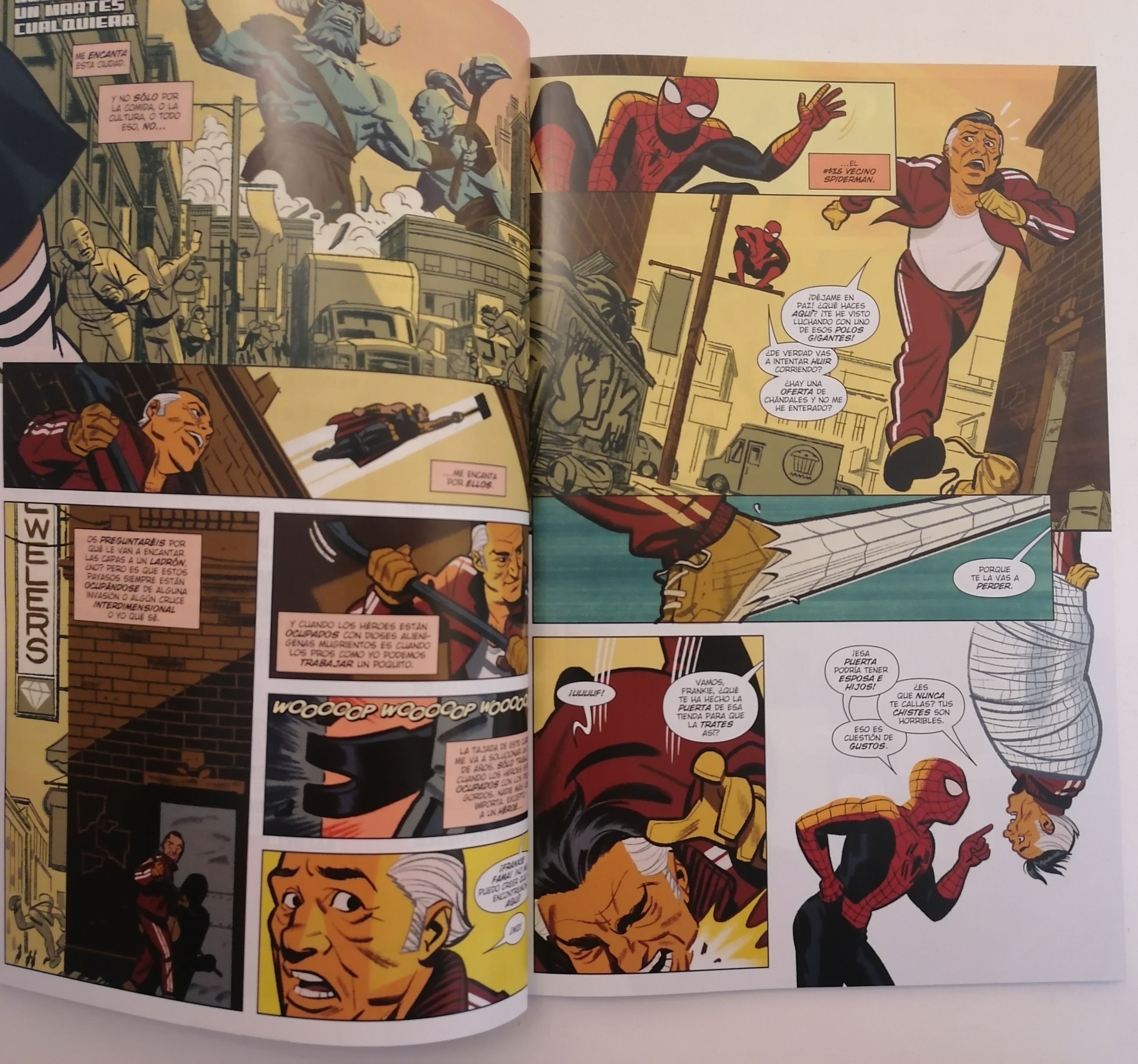 Las ocho historias te podrán gustar más o menos, pero es indudable que todas ellas tienen en guion y dibujo el ADN de la araña que homenajean. La grapa es más larga de lo habitual con 80 páginas, pero su lectura es igual de rápida y amena. Lo que cuentan queda claro y conciso desde el primer momento y van directamente al grano sin enredarse en ninguna telaraña por el camino. Por supuesto hablamos de una obra en la que el dibujo gana importancia al tener tantos artistas involucrados. Para el lector y amante de Spiderman es una buena forma de ver el diferente tratamiento a los lápices que hacen los dibujantes aparte de cómo muestran su ADN los guionistas. Les dejo varios ejemplos de dibujo: