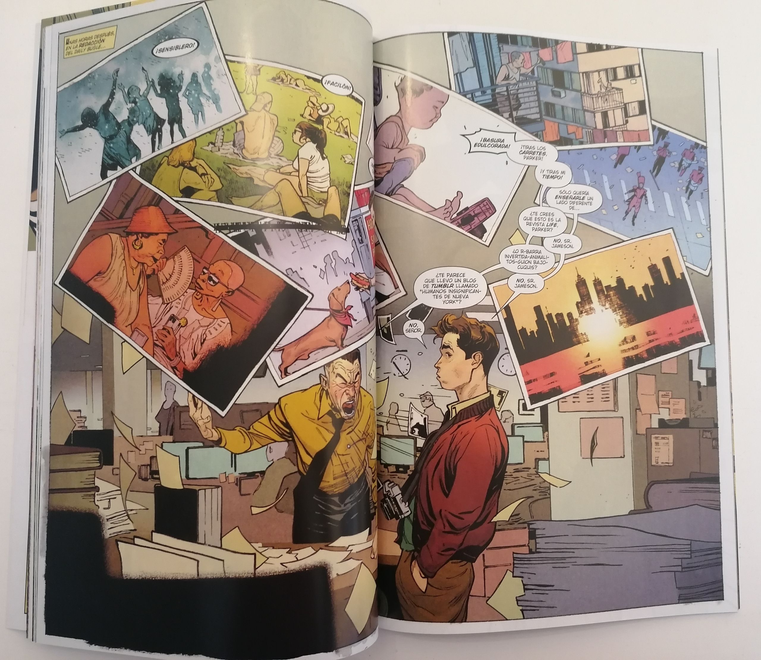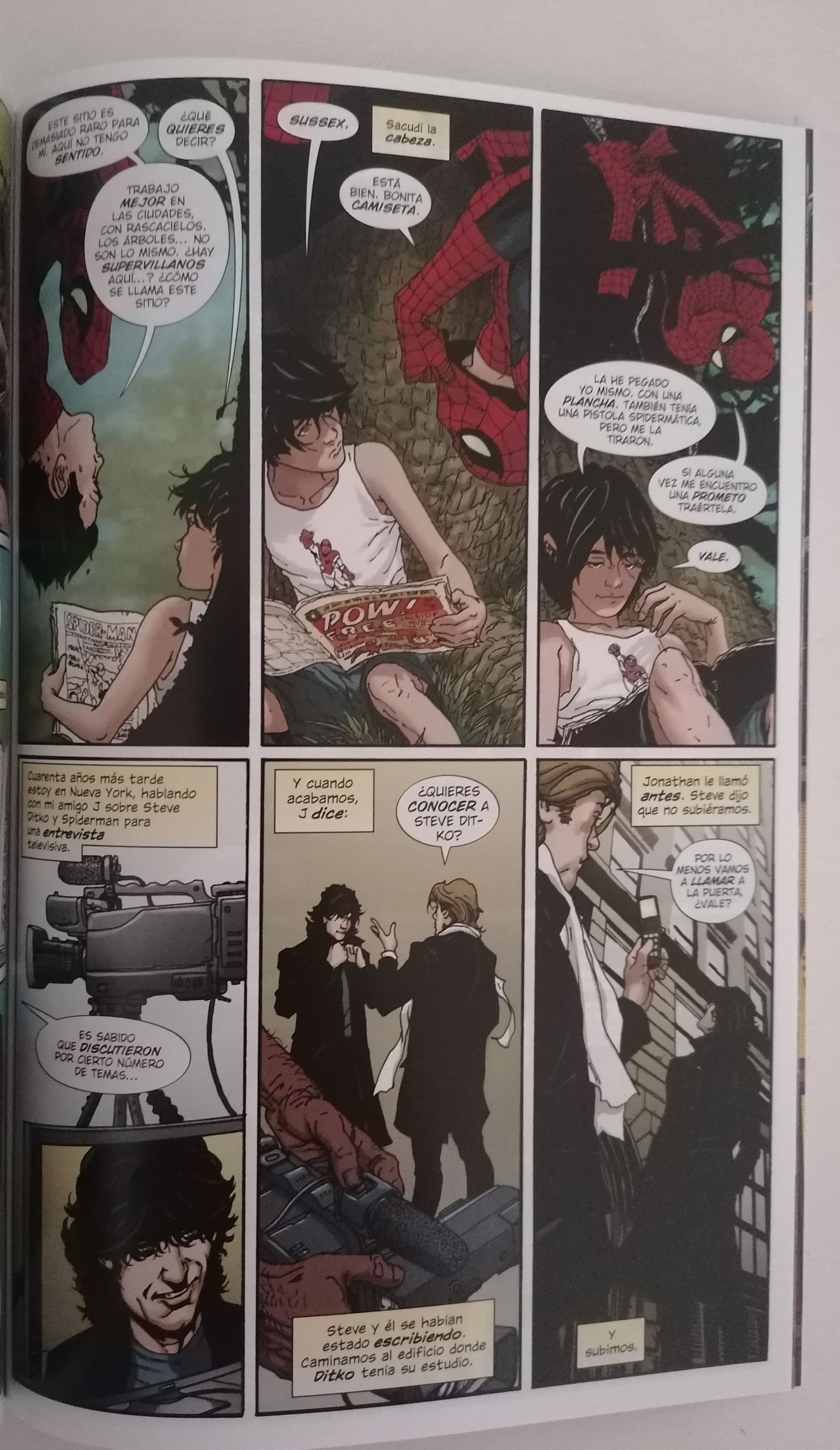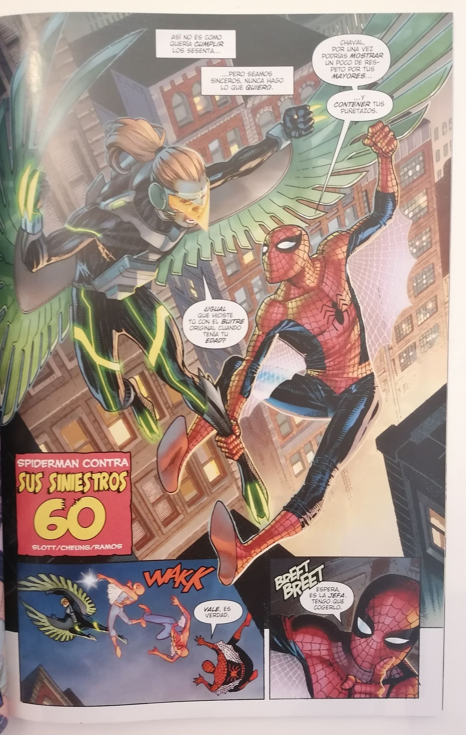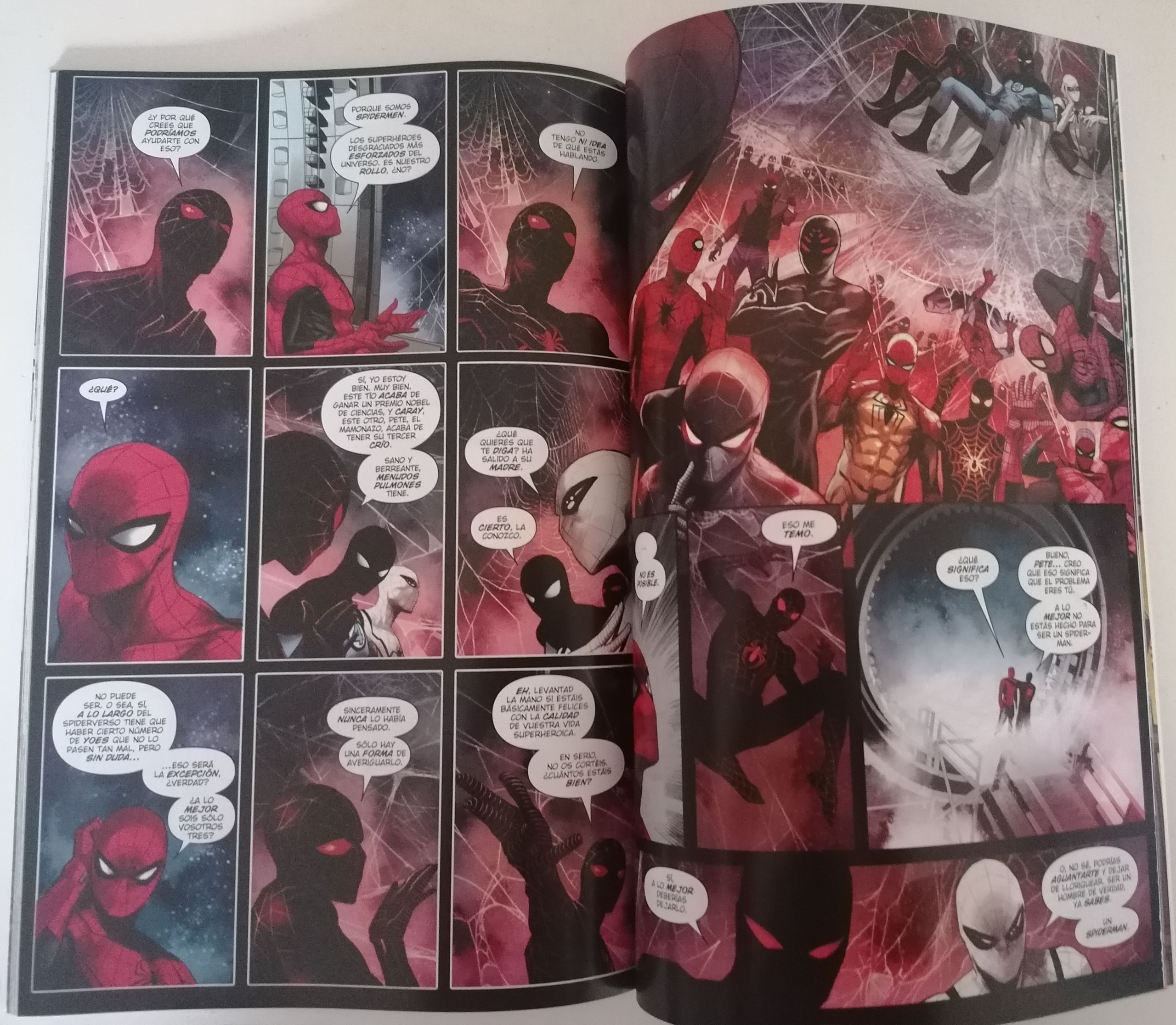 En la segunda historia, "Sus siniestros 60" con el experimentado en terrenos arácnidos Dan Slott y Jim Cheung. Como su propio nombre indica, los seis siniestros están presentes en esta historia y también Mary Jane. Tanto Peter como ella con una edad ya avanzada, pero siempre unidos por el amor que se tienen a pesar del poder y la responsabilidad que Spiderman siempre debe priorizar. En la tercera, Spiderman vs Conspiraton con Iannucci y Ryan Stegman que nos hablarán de manipulación y alucinógenos, mientras que en la cuarta, "Este chico tiene buen ojo" con Rowell y Coipel, ambos nos mostrarán a un Spiderman centrado en el oficio de Peter como fotógrafo. En la quinta, "En la carne", con Che Anderson y Camuncoli, un recuerdo para Gwen Stacy y en la sexta, "...Esclavos de la Reina Bruja", llegará una nueva enemiga a bordo de los mandos de Kurt Busiek y Terry Dodson. En la séptima, "Lo pillas", aparece el que para mí se está convirtiendo en un genio mayúsculo del dibujo, el italiano Marco Checchetto, junto al mítico Jonathan Hickman. El multiverso y los diferentes Spidermans que hay en ellos estarán presentes en esta historia. Y en la octava y última, "Un gran poder..." con el genio de Neil Gaiman junto a Steve McNiven, el propio autor revela con sus viñetas cómo influyó la figura de Spiderman en su propia vida.