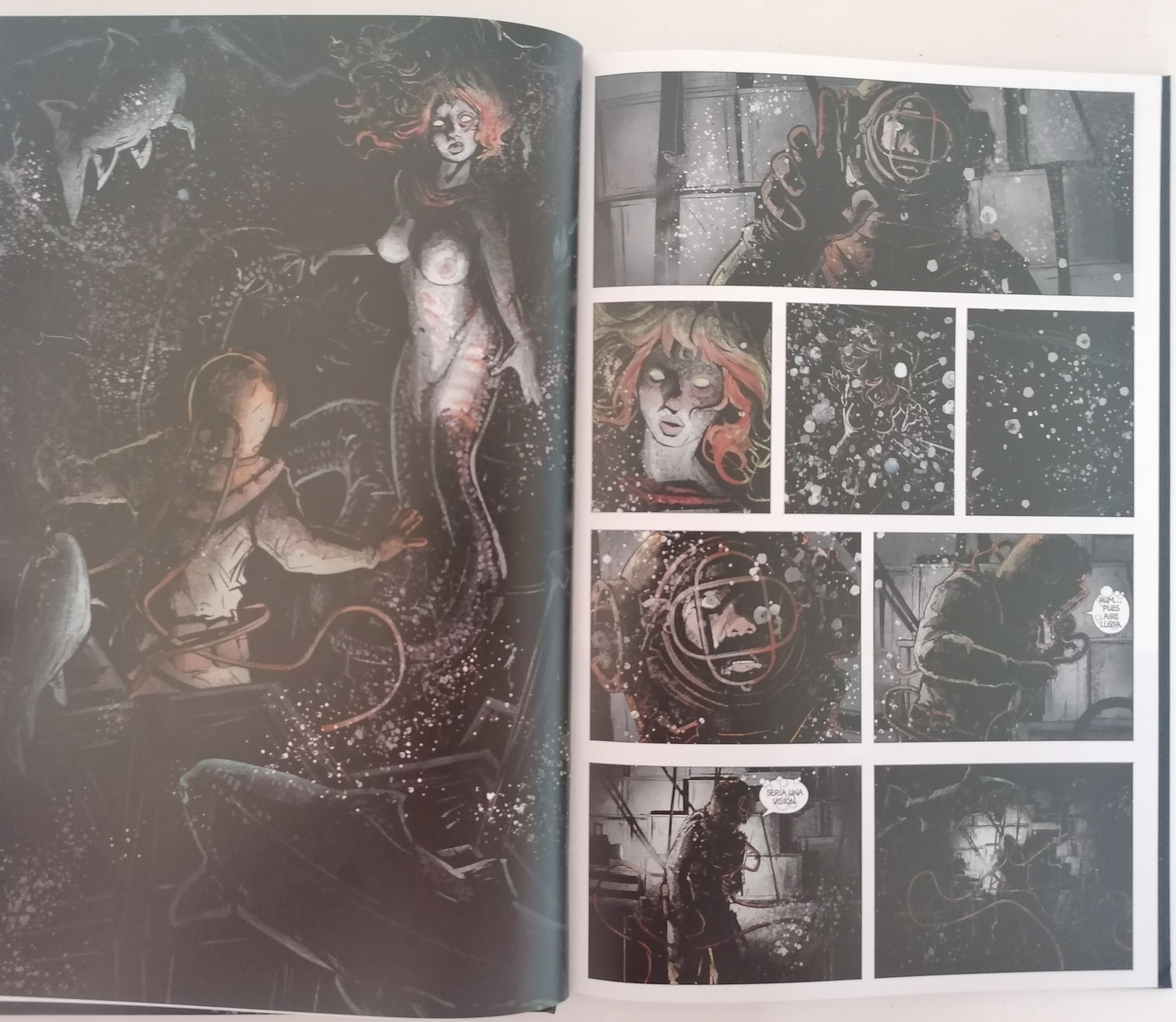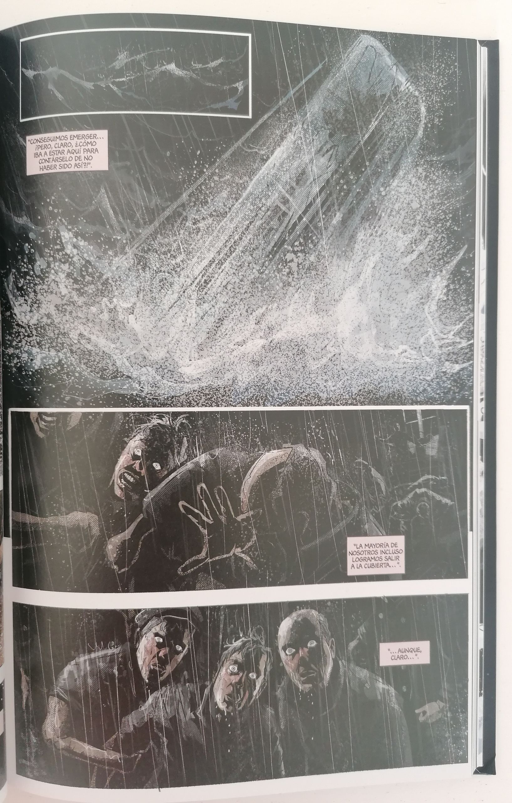 Con ese reparto de personajes, la obra guionizada por Rich Douek se divide en dos partes. La primera de ellas trata sobre lo que ocurre en el terreno humano entre los diferentes miembros de la tripulación y otra se habla de la parte mitológica y terrorífica de la historia con esa extraña mujer de ojos verdes y cuerpo de sirena que canta una extraña melodía y aparece tanto debajo del agua como en cubierta. En ambas partes, el guion no profundiza demasiado ya que hablamos de un cómic corto de 144 páginas, pero tampoco lo necesita porque aquí lo que se prioriza de forma acertada es la ambientación y la atmósfera de no saber qué ocurrirá a continuación en plena oscuridad. Quizá el único personaje tratado con más profundidad, nunca mejor dicho, es Nick, el submarinista, al que vemos en flashbacks sufriendo la crueldad sanguinaria que se vivió en las trincheras de la Gran Guerra.