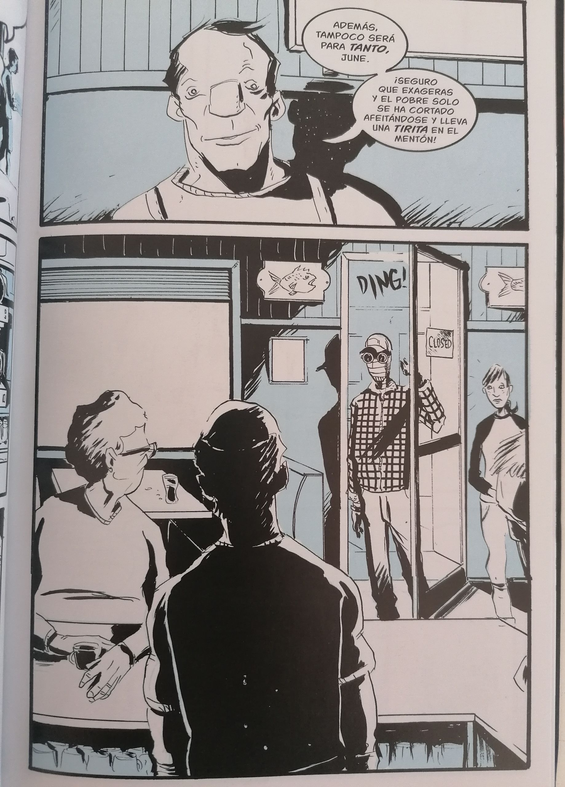 En este pueblo llamado Large Mouth, nuestro hombre invisible vivirá todo esto en primera persona. En un lugar en el que quiere ser Nadie acabará siendo inicialmente el tema de conversación de todos los vecinos. Eso lo retrata a la perfección Lemire con conversaciones entre los habitantes del pueblo, charlas de taberna y la figura de varios personajes secundarios que, desde el principio, pondrán todos sus prejuicios encima de la mesa para mirar mal a este científico que prefiere pasear solo y quedarse en su Motel, que salir e interaccionar con sus vecinos. Además, Lemire introduce al personaje de Vickie, una joven curiosa que lejos de rechazar lo nuevo, tiene curiosidad por conocer y entender a su nuevo amigo, el cual tirará del apoyo de esta joven para sostenerse en sus peores momentos.