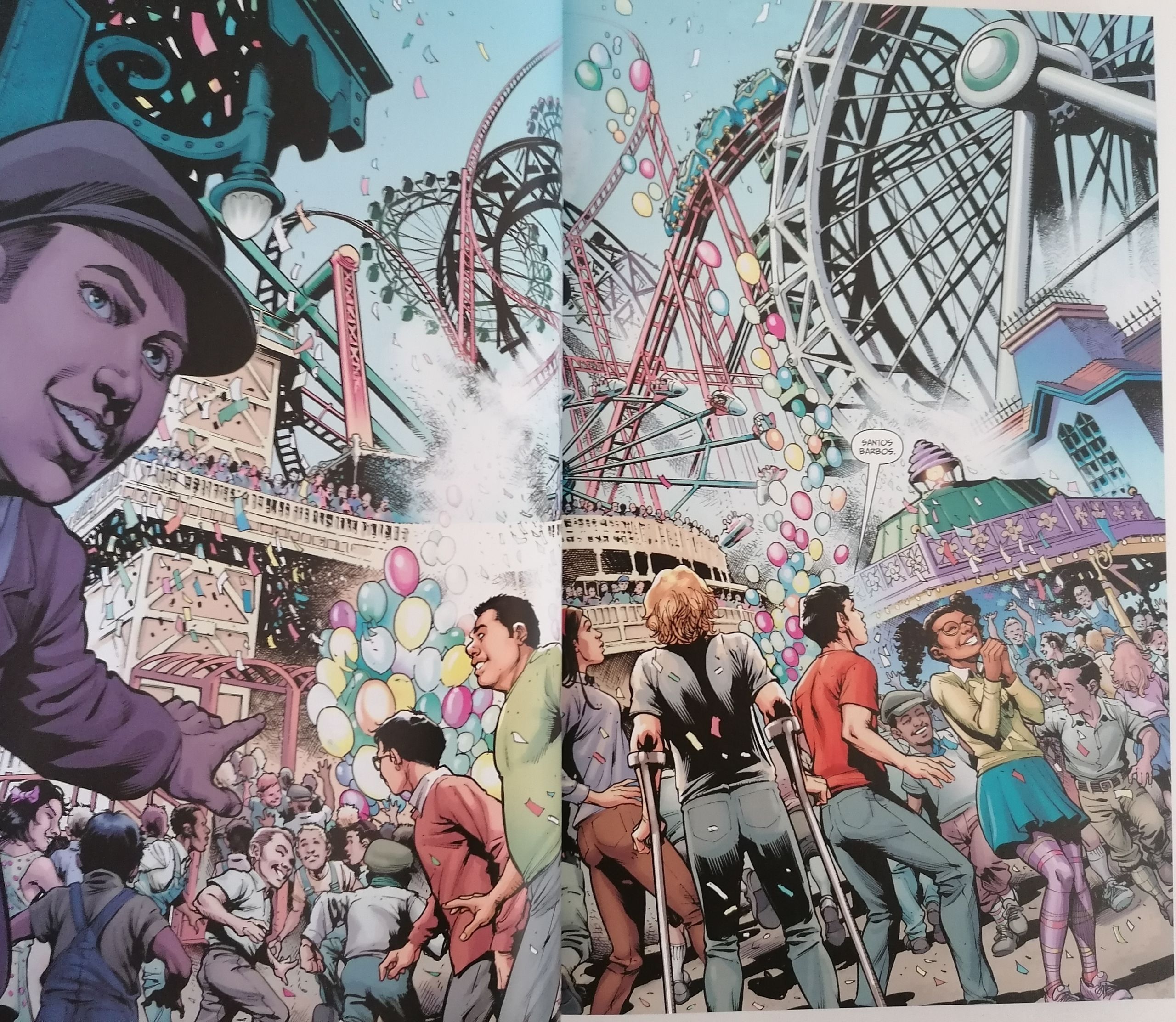 El guion es ‘made in Johns’. Es muy cinematográfico. Muy entretenido y en la mayoría de los casos muy dinámico. Eso sí, este tomo sí se me ha hecho un poco lento en algunos momentos. Le visto lagunas al guion de Geoff porque creo que para demasiado, sobre todo en la primera Tierra que visitamos, la de la Diversión. Ahí creo que podía haber resuelto o descrito ese mundo con más rapidez, como sí hace con el resto. No es exagerado ni mucho menos, pero ahí se me paró un poco la narrativa del cómic. Por lo demás, el guion es divertido, incluye momentos importantes y épicos y tiene un giro final bastante acertado a mi parecer. Eso sí, lo repito, a mí me cuesta más porque estamos ante una historia que, para lo bueno y para lo malo, tiene como protagonistas a niños y a adolescentes. Divertida es, por supuesto, aunque también infantil. Lo dicho, para gustos, los colores o las tierras, mejor dicho.