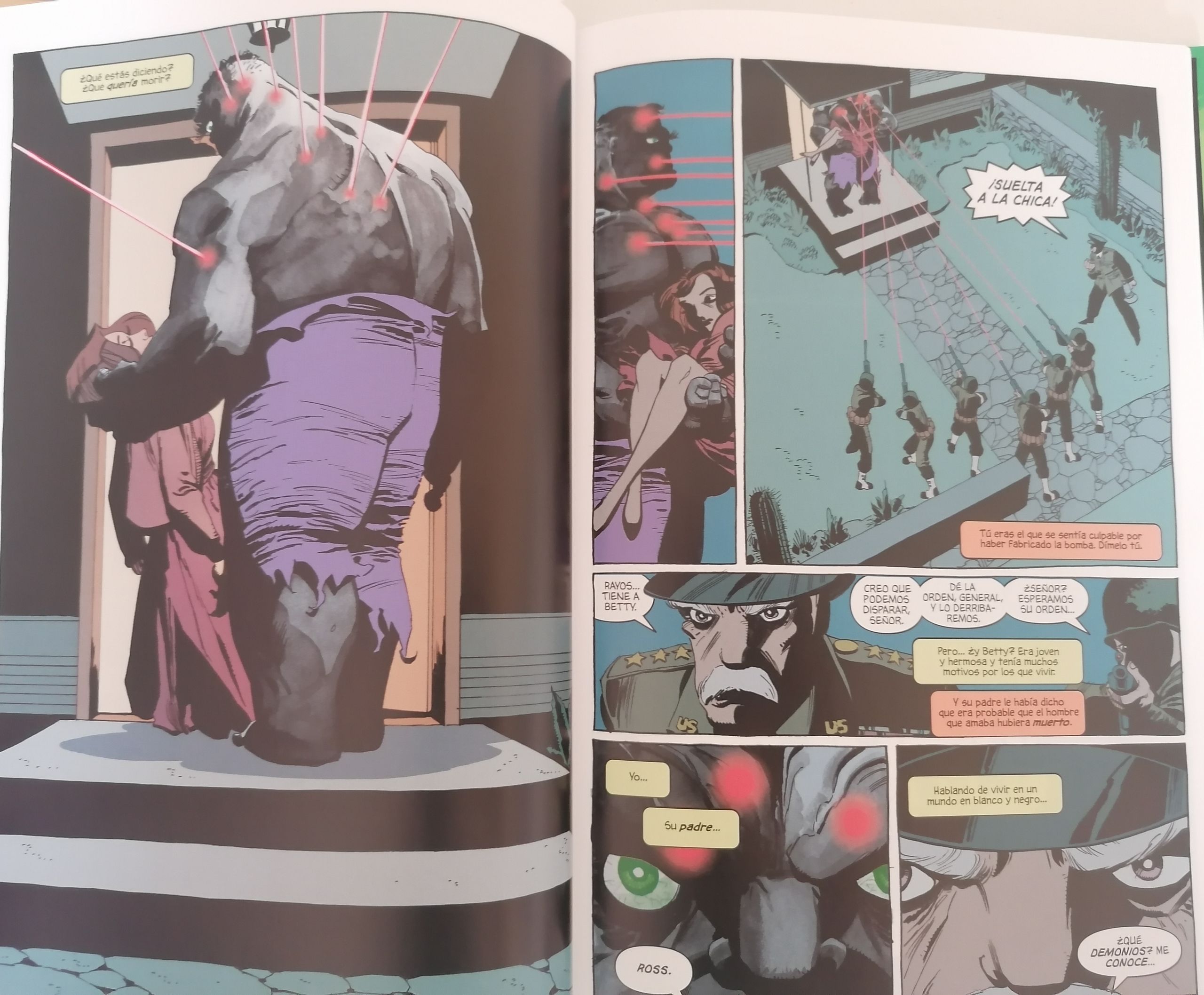 Lo primero que nos vamos a encontrar a nivel de guion en este Hulk es la visita de un prófugo de la justicia, el mismísimo Bruce Banner, a su psiquiatra. Ojo, psiquiatra y amigo. A partir de esa visita nocturna arranca una conversación en la que el propio Bruce irá desvelando, poco a poco, por qué ha visitado al doctor esa noche y qué eventos de su pasado le han llevado hasta el momento actual. Como hemos dicho antes estamos ante una historia de orígenes, la cual nos llevará de la mano de Loeb a la primera noche de Bruce como Hulk. Veremos su transformación tras recibir el impacto de la bomba gamma, conoceremos su odio profundo por el general Ross, su amistad con Rick Jones y su amor por la hija del militar, Betty Ross, pero sobre todo nos vamos a meter de lleno en el terreno más psicológico del personaje. Loeb te va llevando por todos los eventos que suceden esa noche a través del sufrimiento de Bruce y también a través de las dudas de un Hulk que quiere alejarse de la palabra que todo el mundo le llama: "Monstruo".