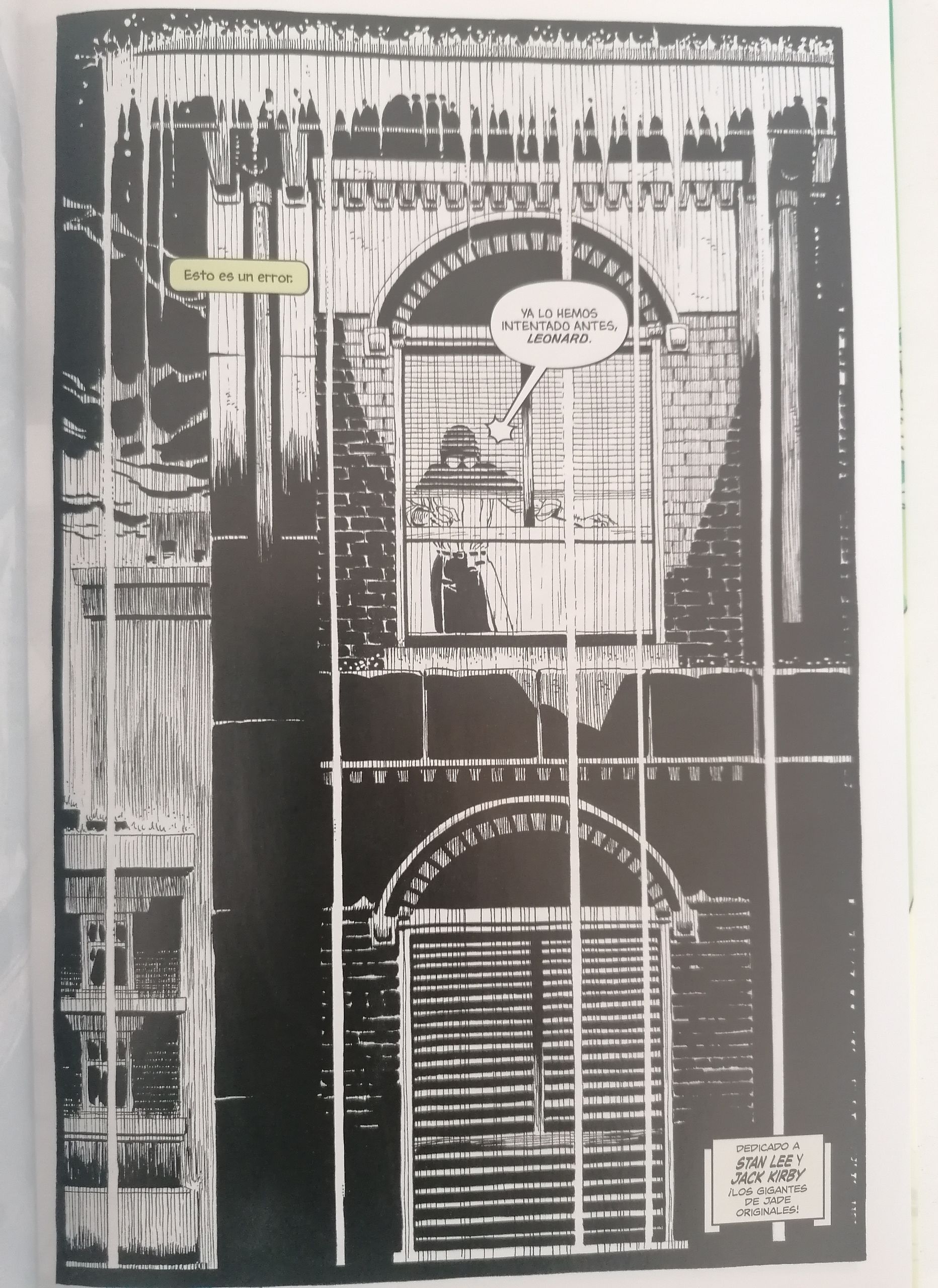 Loeb pone todo en la mesa para el comensal a nivel de guion y es ahí cuando Tim Sale termina de redondearlo todo con una cena de gourmet en el dibujo. En primer lugar su estilo es inconfundible. Precioso en idea y ejecución. Con Splash Page de museo y momentos de grandiosidad de Hulk en los que Tim logró llenar toda la página con la presencia del coloso. ¿Por qué el color gris? Ya contamos en su día lo que pasó con el cambio de color de Hulk, concretamente lo hicimos en la reseña de la Biblioteca Marvel del personaje, y aquí le viene como anillo al dedo ese uso del gris en el cuerpo y el verde en los ojos, tanto de Bruce como del propio Hulk. Eso sin olvidar los momentos de Banner con su psiquiatra, donde se juega ese verde junto al blanco y negro de las escenas. Una genialidad por parte de Tim que os muestro en estos dos ejemplos: