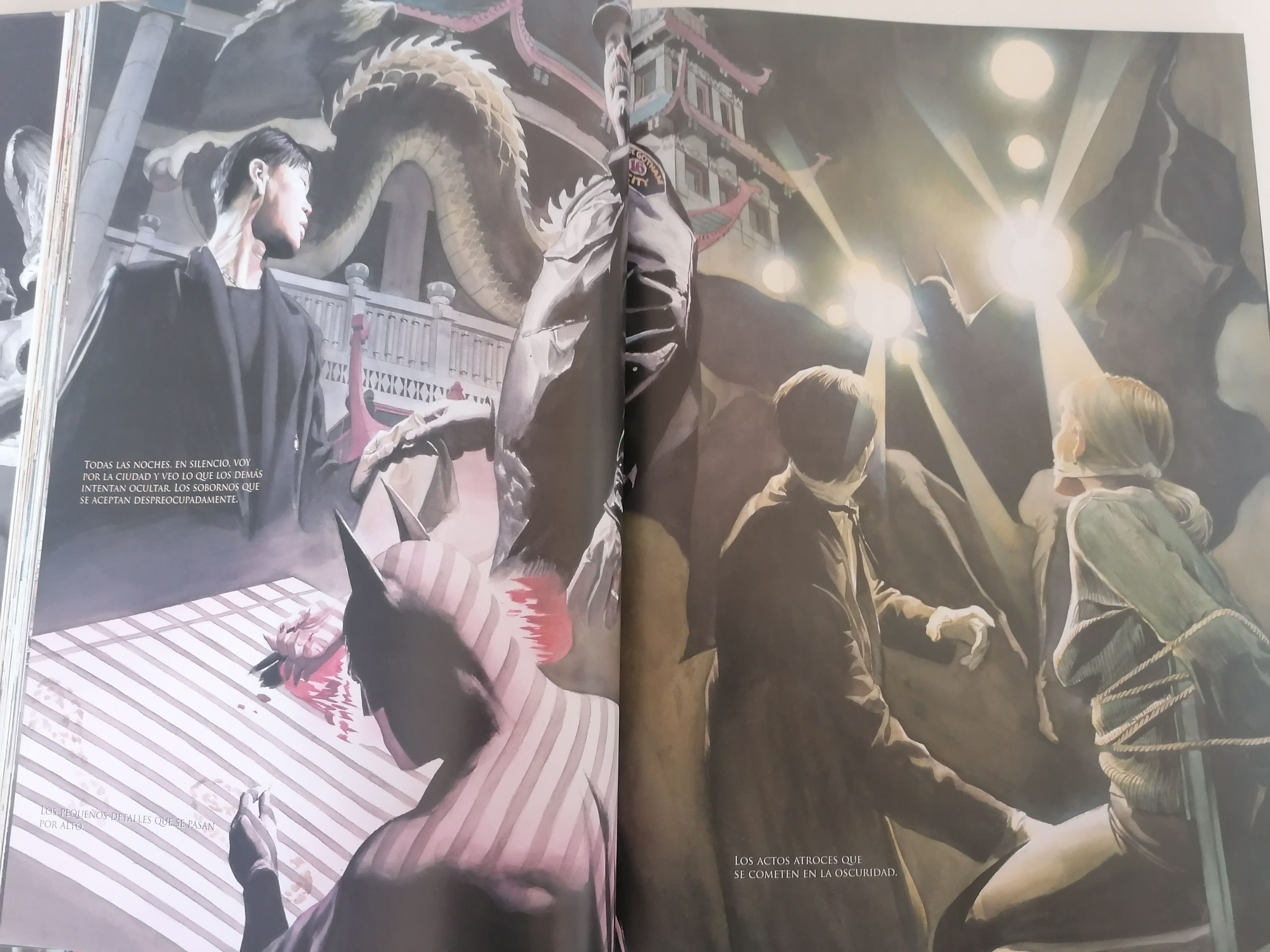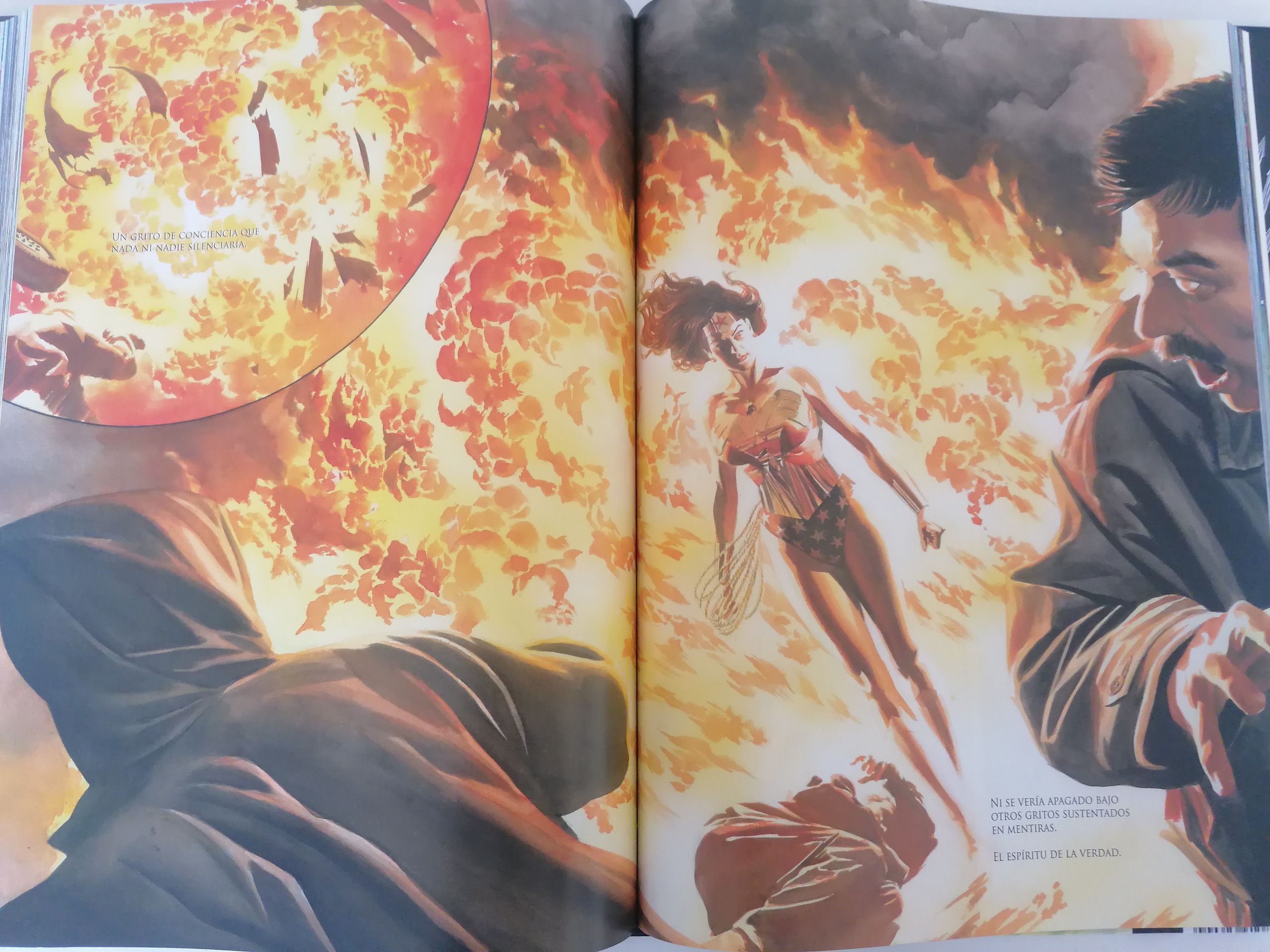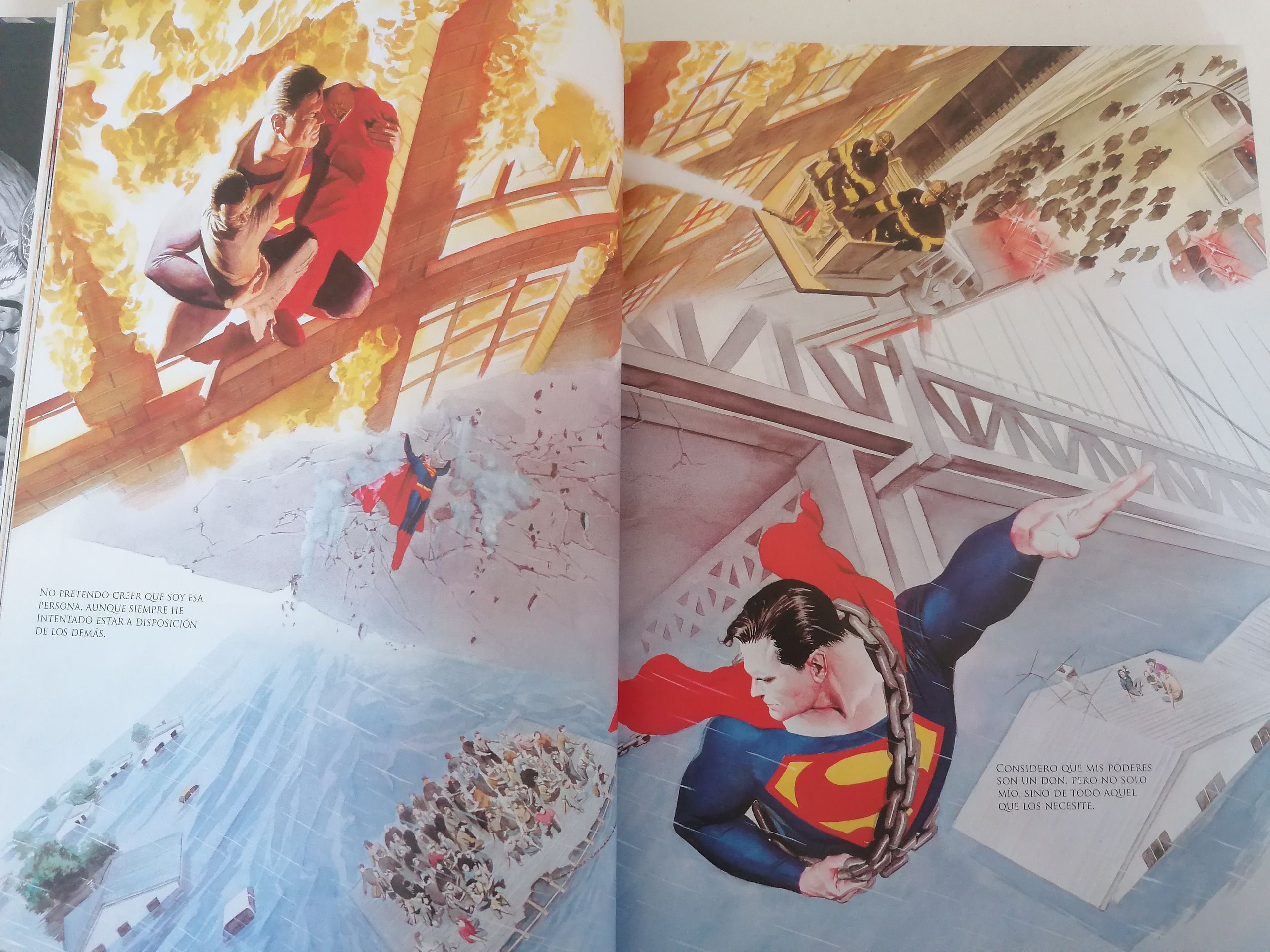 A nivel de dibujo... Alex Ross, señoras y señores. Una imagen vale más que mil palabras y es una delicia ver su estilo acoplado a las características de cada héroe, incluyendo sus ciudades y orígenes. Metrópolis, Gotham, Temiscira... Cada uno con sus tonos y ambientes habituales que les han hecho famosos. Os dejo varios ejemplos: