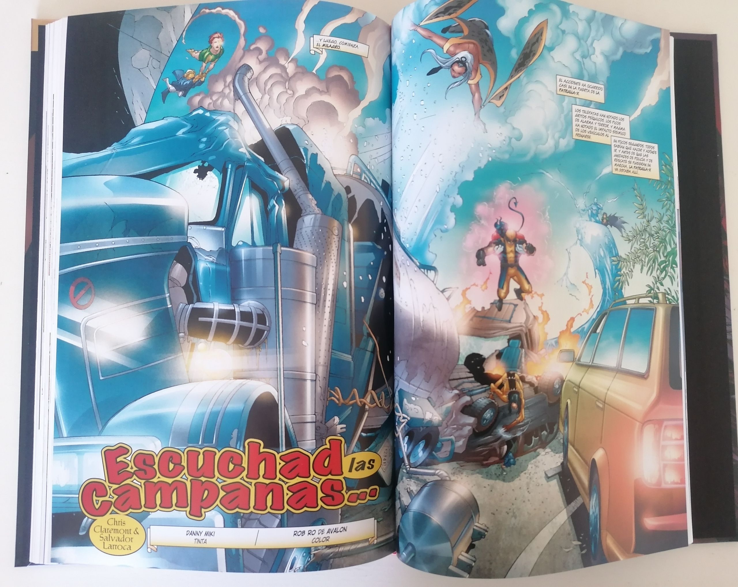 La segunda parte, con el tono de club secreto, élite, conspiración, misterio y enfrentamiento que consolidan entre Claremont y Park, da paso a la conclusión del tomo con una historia corta que aporta el tono familiar al grupo sin dar mucho más contenido a lo visto anteriormente. Eso sí, esta parte la dibuja Salvador Larroca y solo por eso vale la pena echarle un vistazo. El inicio, joya visual del dibujante español. Un ejemplo: