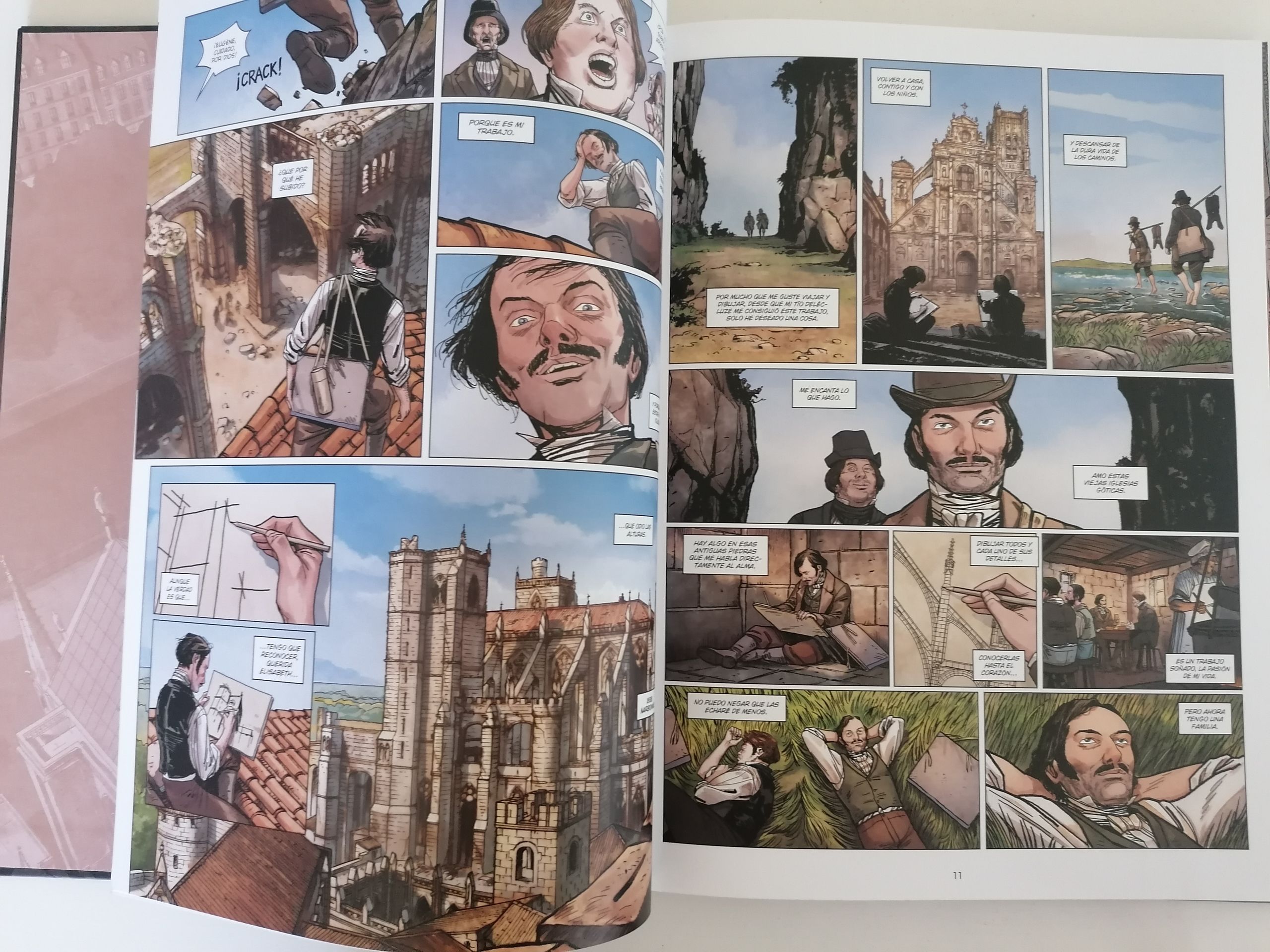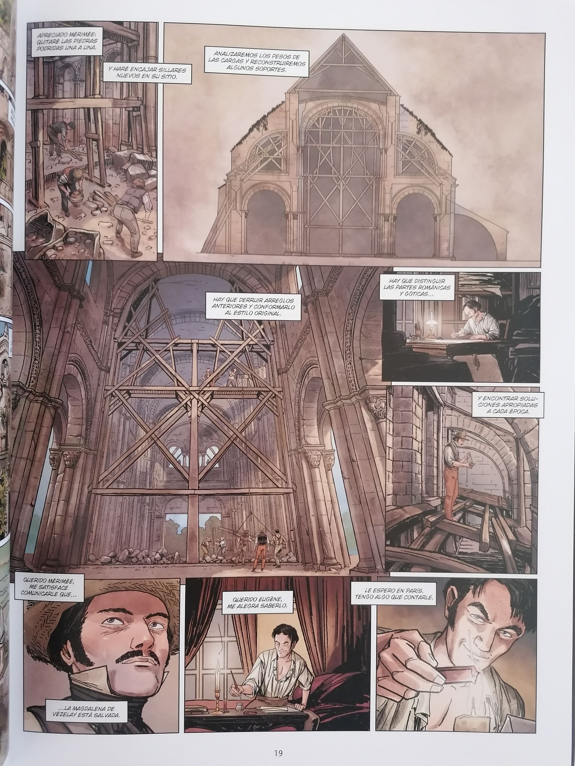 Salva Rubio arrancará la historia con un inicio en el que veremos lo sucedido en 2019, con la caída de la aguja incluida, para poco después llevarnos al momento en el que Eugène Viollet-le-Duc recibe el encargo de su vida. Un encargo, por cierto, que lastrará su núcleo familiar durante más de dos décadas. Eso es algo que Salva añade a la historia y que sirve para dar el toque humano a lo que se cuenta en este guion. No solo veremos a Notre Dame resucitar sino que a la vez veremos a su restaurador perderse en la obsesión por salvar esta y otras construcciones góticas que estaban en peligro en toda Francia. Salva nos llevará el foco a la catedral, aunque no siempre será la protagonista. Esta es una historia muy humana. Una historia en la que empatizaremos con el restaurador, agobiado por todo el trabajo que se le va acumulando mientras se pelean en su cabeza sus ganas de gloria y su amor por la familia. Si crees que estás ocupado en la vida, alucinarás con la cantidad de cosas en las que se metió el bueno de Eugène. Además, Rubio rodeará a su personaje principal de políticos libertinos, aliados, enemigos y familia, logrando estructurar varias capas secundarias dentro de la historia principal. Destaca sobre todo, aparte del tema familiar, la amistad con el inspector general Prosper Mérimée y con el codirector de la restauración, Jean-Baptiste Lassus.