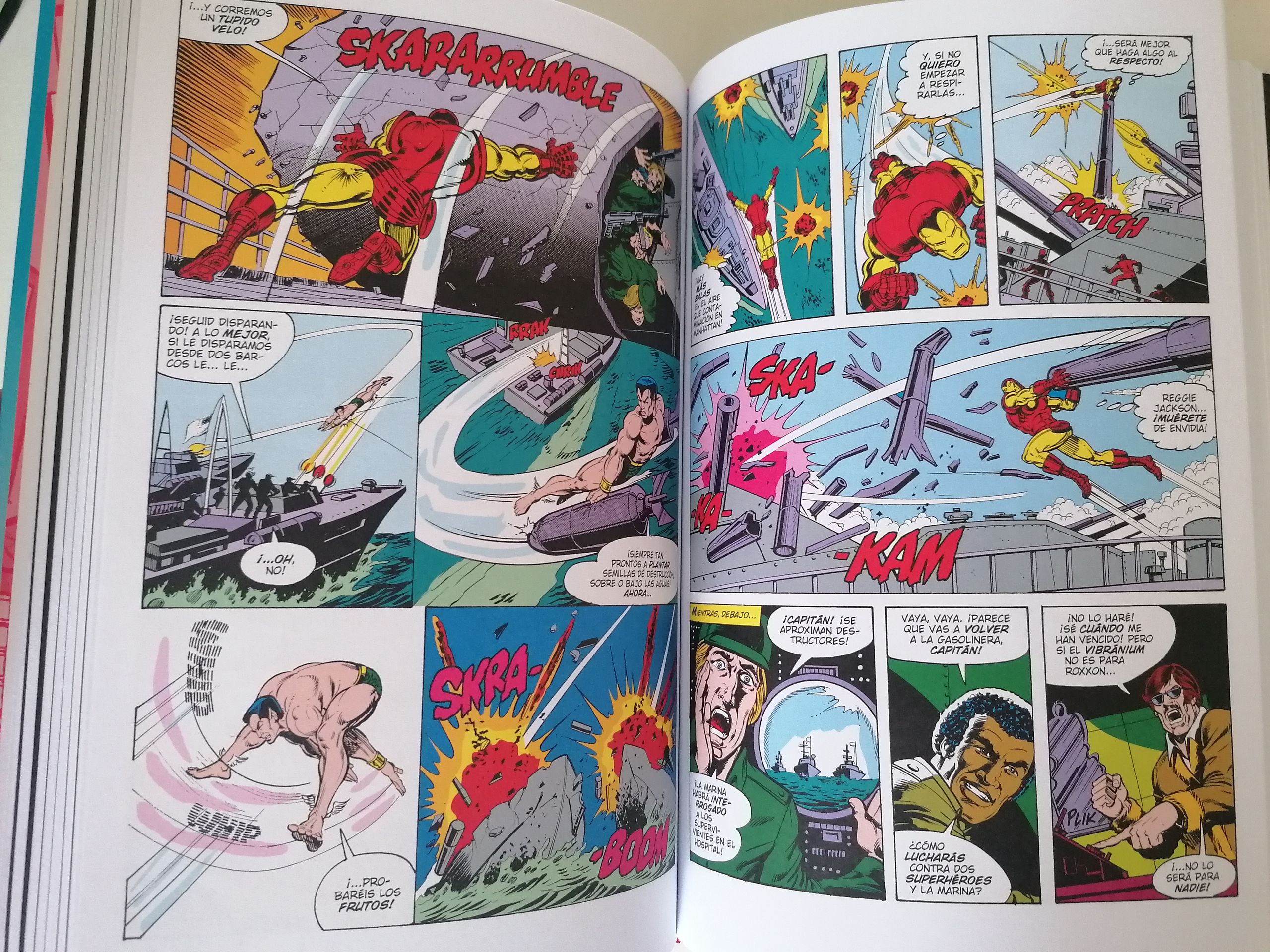Además tenemos a nuestra disposición el dibujo de un genio legendario como John Romita Jr, que se hace con los mandos al poco de empezar el tomo y rápido impone su estilo en todo tipo de composiciones y escenas. Un estilo que, poco a poco, fue depurando y mejorando para pasar de promesa a leyenda. Las grapas en las que Iron Man aparece junto a Namor ya empiezan a dejar un poso de genialidad importante y cuando Romita empieza a dejar volar su talento, los escenarios, los detalles en primer y segundo plano y las escenas de combate o entrenamiento de Iron Man, nos dejan con la boca abierta.