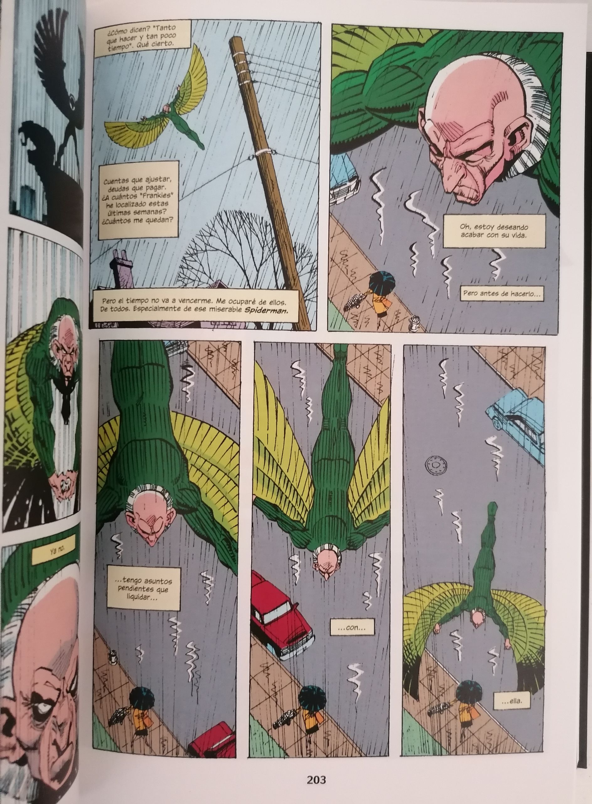Todas las historias tendrán ese trasfondo psicológico y no suavizarán ningún tema importante relacionado con el miedo o los traumas. De hecho, DeMatteis no tiene ningún problema en profundizar en los temores de Spiderman, en los abusos sexuales que sufrió de niño uno de sus villanos o en una enfermedad tan terrible y definitiva como el cáncer. Hay mucho dolor y mucha profundidad en estas historias, sobre todo en aquellas en las que el Duende Verde y Alimaña hacen su aparición, que son la mayor parte. DeMatteis también echará mano de otros enemigos de la araña como Buitre, Rhino o el Puma. La del Buitre, por cierto, con un gran y merecido protagonismo para la Tía May, personaje sin el que es imposible definir la personalidad de Spiderman.