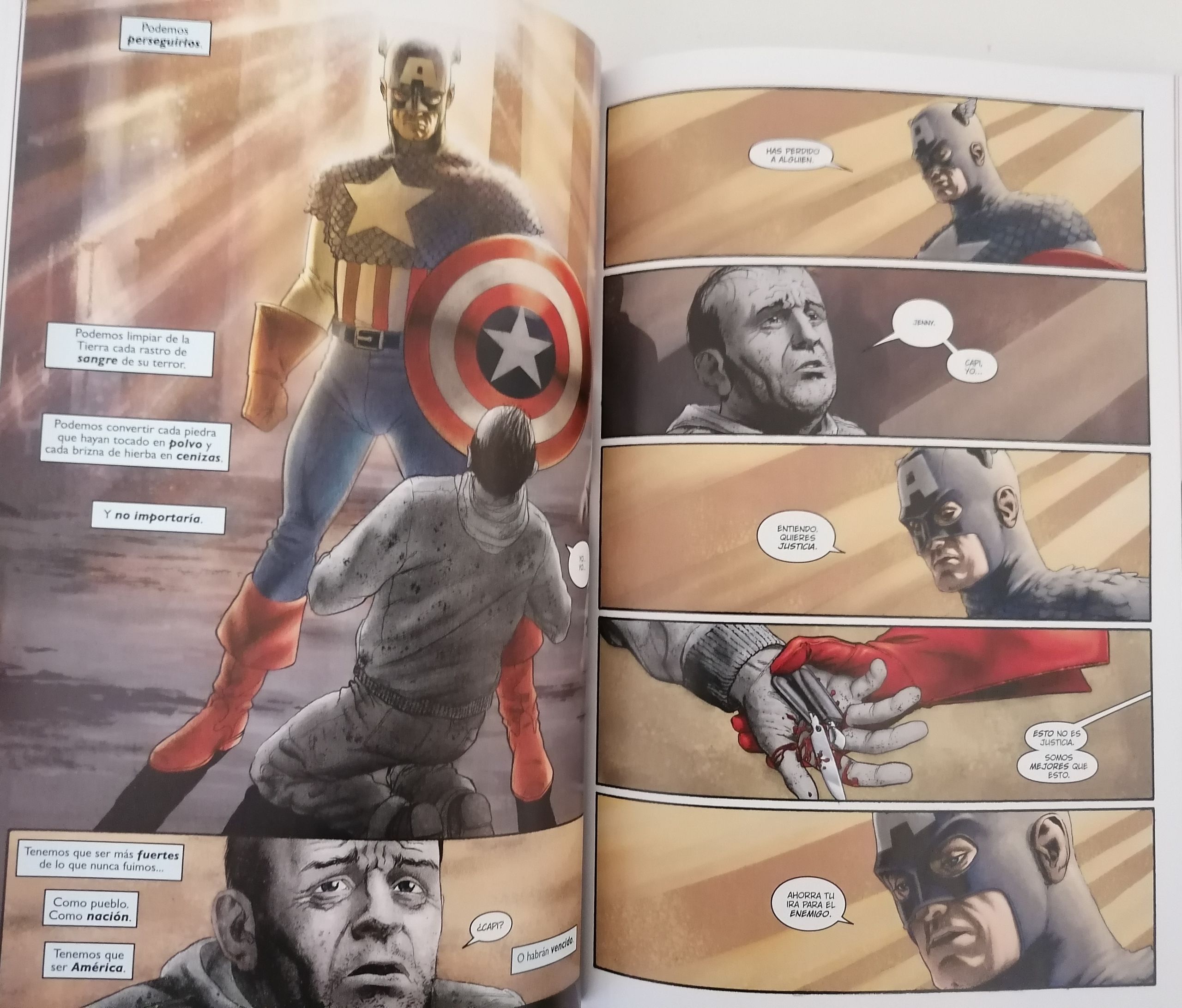 Mi consejo para aquellas personas que se acerquen a esta obra es que no le busquen tres pies al gato y disfruten de esta historia, porque la misma no esconde que, detrás de todo ese furor estadounidense, existen muchísimos fallos que les han llevado a repercusiones y consecuencias terribles para su propia existencia. Aquí no se edulcora el ADN bélico de Estados Unidos sino que se van sucediendo una serie de dardos lanzados por el Capitán que sirven para que nadie piense que se puede jugar en el mercado de la guerra sin que después los que un día fueron tus amigos puedan convertirse de repente en todo lo contrario. Eso es lo que también me ha gustado de este cómic y lo que hace que el discurso del Capi tenga más verdad en su fondo y en su forma.