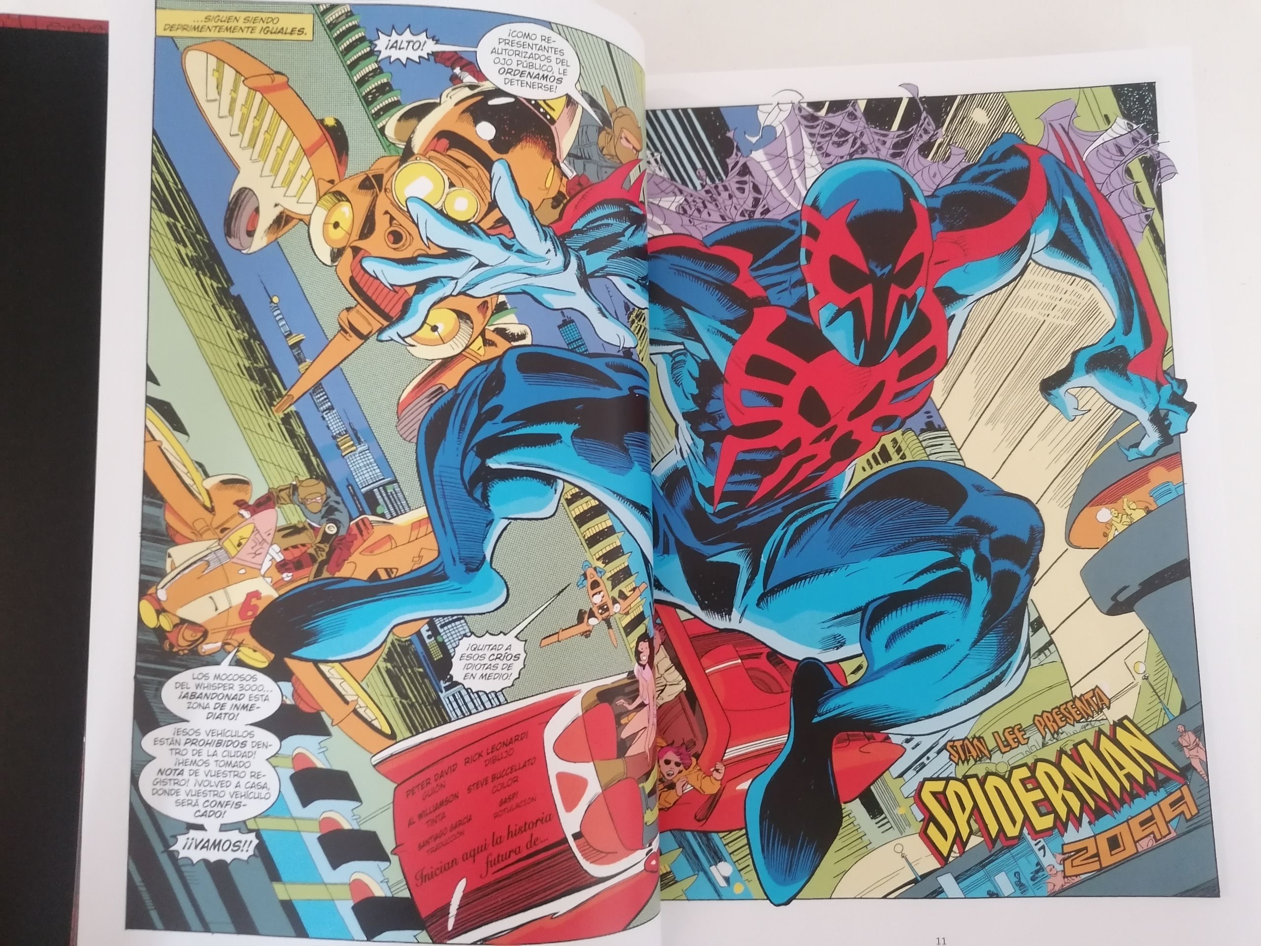 Antes de entrar en materia y explicaros de dónde salió y quién es este Spiderman 2099, vamos con el apartado técnico del cómic: guion de Peter David e Ian Edginton, dibujo de Malcolm Davis, Ron Lim, Kelley Jones, Jimmy Palmiotti, Chris Ivy, Rick Leonardi, Tom Grindberg, contiene Spider-Man 2099 1-14, Annual 1 y material de 2099 Unlimited 1-3, editorial Panini, cartoné tapa dura, 464 páginas y un precio de 47 euros.