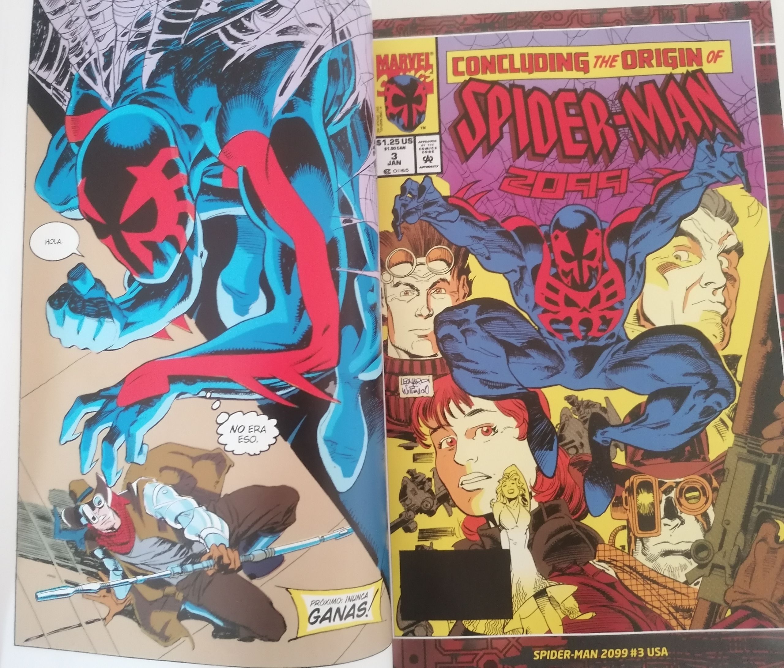 Marvel y Panini, que de esto saben bastante, han aprovechado la ocasión para traer por primera vez a España la recopilación de ese Spiderman 2099 que tiene como protagonista a Miguel y que es muy diferente a lo que vimos en la película. No en estética, por supuesto, pero si en fondo y forma. Si hacemos caso al 1 que viene delante del anuncio de este tomo, Panini no dejará la cosa simplemente en una entrega y seguirá recopilando las historias de O´Hara en, como mínimo, un segundo integral.