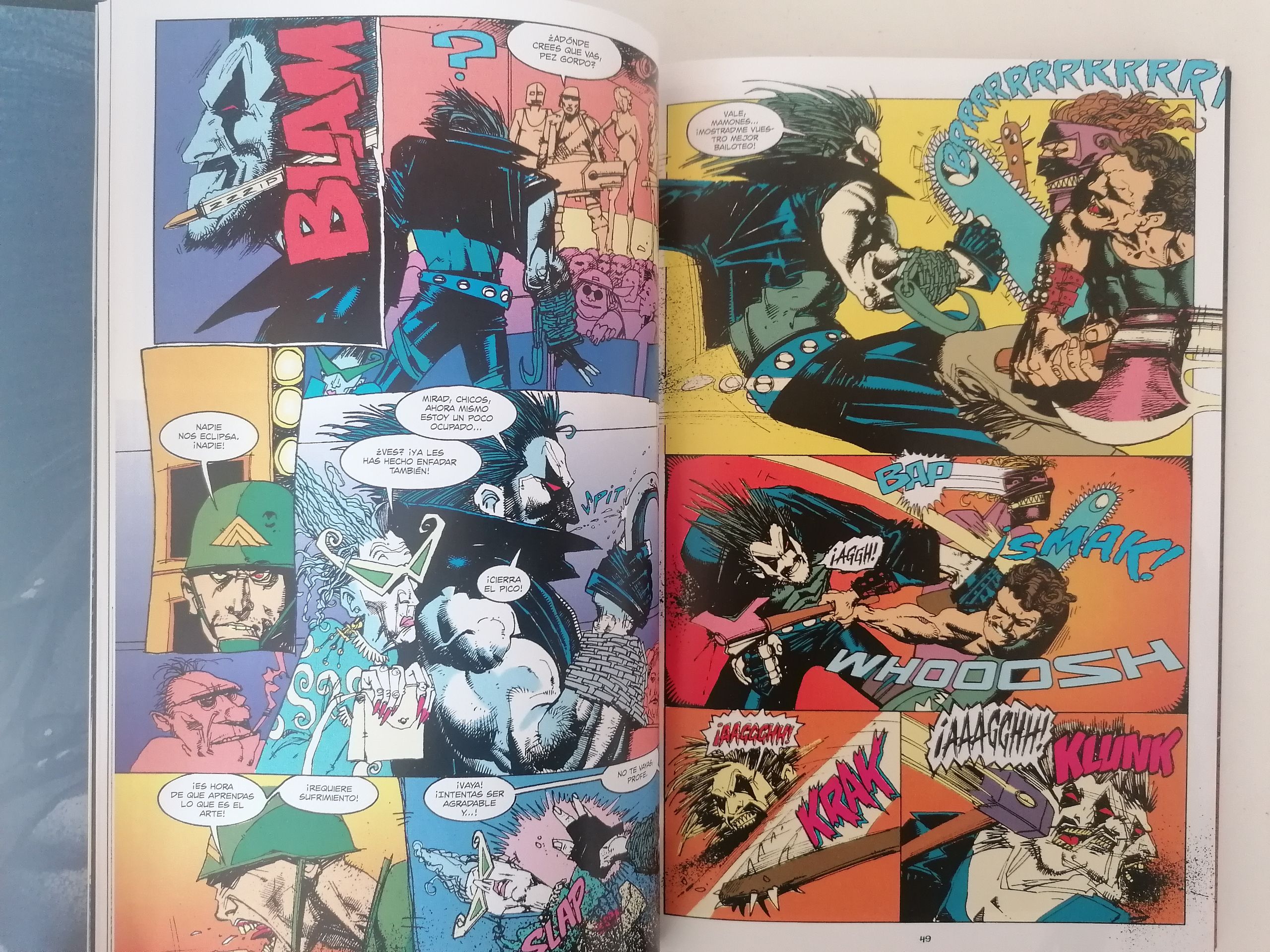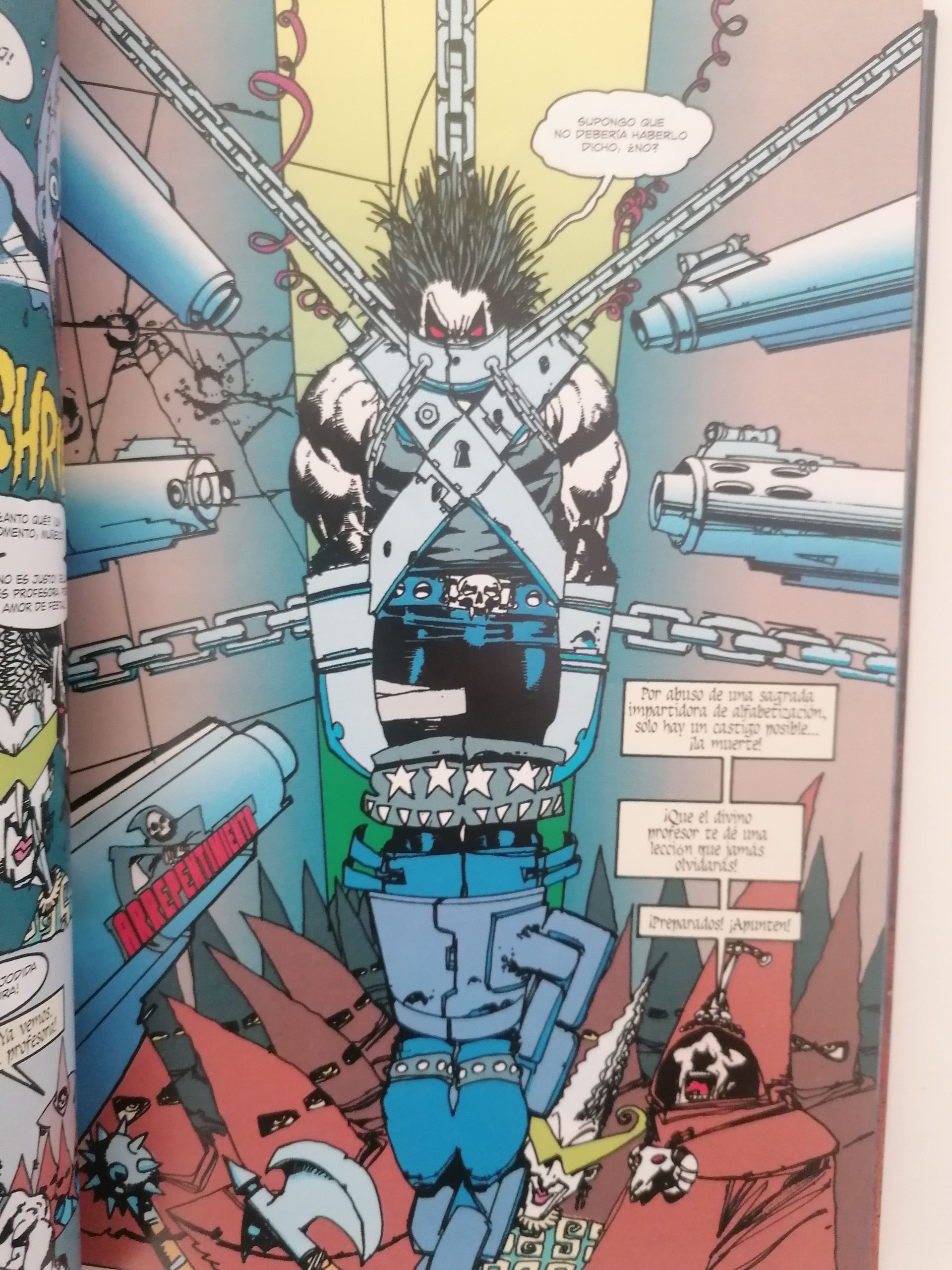 A mí en particular, siendo sincero, Lobo no me apasiona. No soy de ese estilo metalero que he dicho anteriormente, pero sé separar gustos personales de verdades absolutas. Lobo no es un héroe. Casi no es ni un antihéroe. Es un chalado macarra lleno de músculos, colmillos, cadenas y estética heavy que llegó a exterminar a toda su raza porque le parecía que no llegaban ni a un ápice de su propia grandeza. ‘Ahora’, como mercenario, se dedica a cumplir encargos en los que puede dar rienda suelta a toda su maldad con una estética motera, brutal y macarra que marca toda la obra.