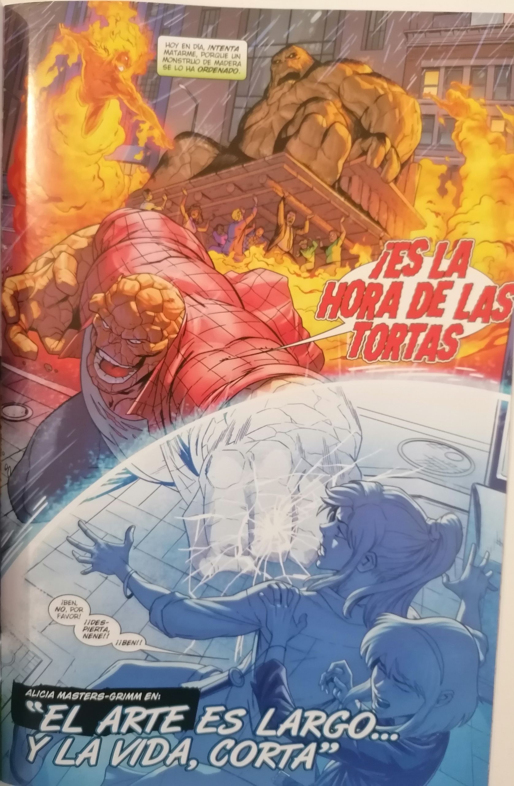 Esta grapa que hoy os traemos aquí es la segunda parte de una pequeña historia autoconclusiva que se puede leer en el octavo y noveno número de esta cabecera. ¿Por qué la traigo ahora si no he dicho nada de la primera? Porque esta segunda parte tiene una curiosidad y es que está narrada desde el punto de vista de una persona invidente. Para ello se usa al personaje de Alicia, la mujer de La Cosa, que será el epicentro de esta pequeña aventura. El argumento, por otro lado, es un ejemplo más de esta reformulación de los clásico. Hay un monstruo, una posesión de un pueblo entero y tanto La Cosa como Reed Richards acabarán en manos de esta poderosa entidad que les hará enfrentarse al resto de su familia.