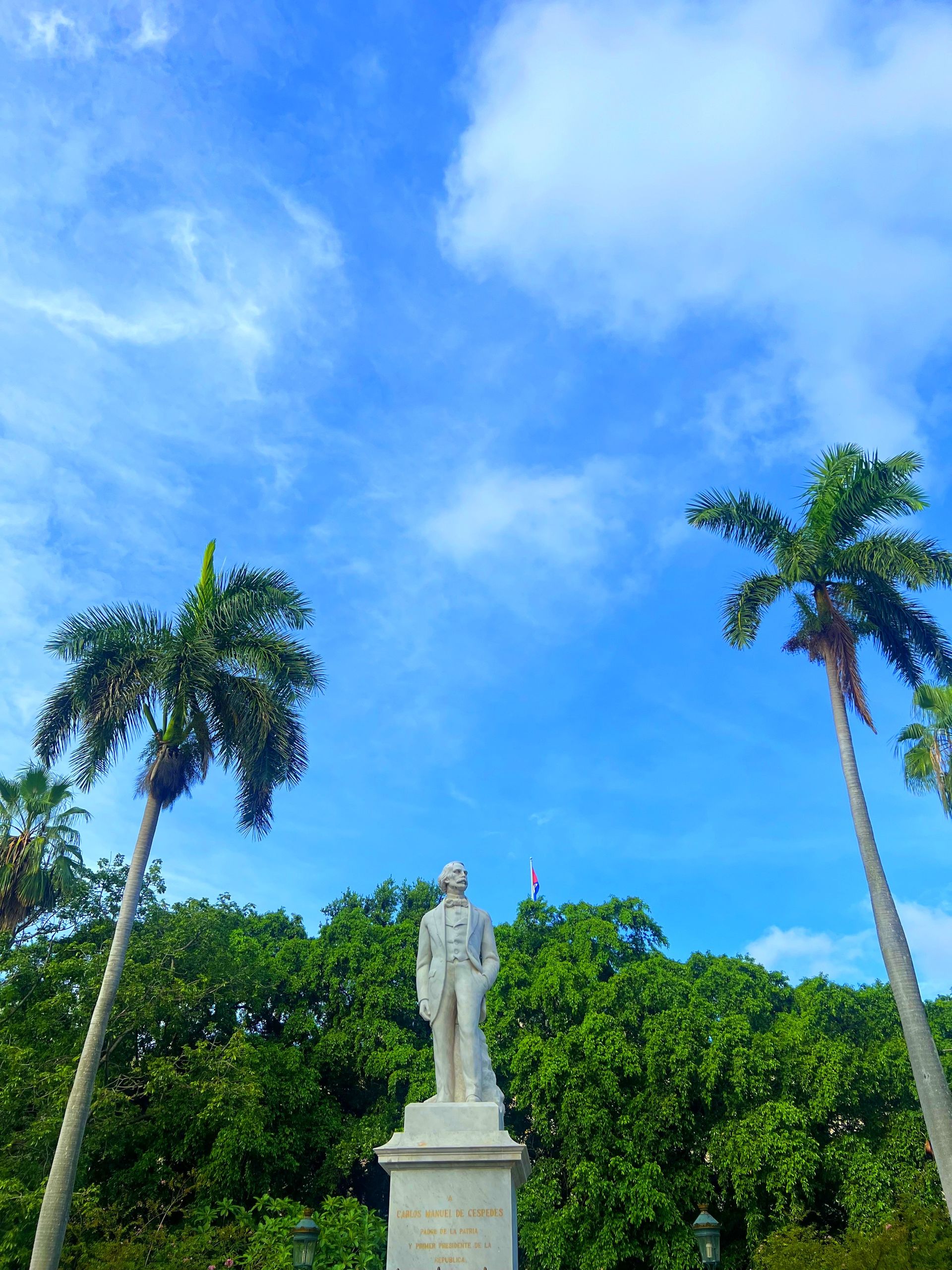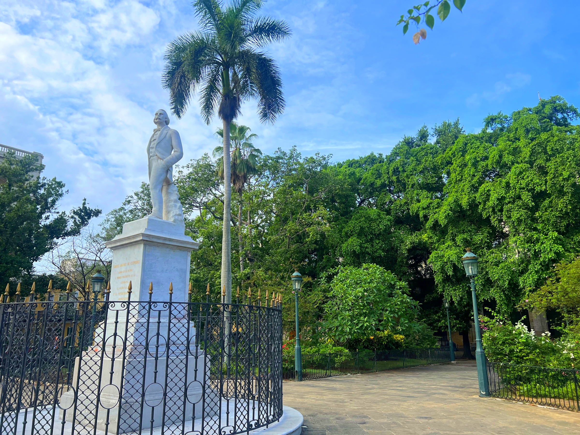 Por esta plaza han pasado estatuas de personajes españoles, como Isabel II, pero desde 1956, la ocupa Carlos Manuel Céspedes, líder secesionista cubano. Su rostro también aparece en un billete cubano. esta plaza estaba presidida por la imagen de Isabel II. A pesar de que con el triunfo de la revolución no hubo "descabezamientos" de estatuas, sí que hubo algunas sustituciones.