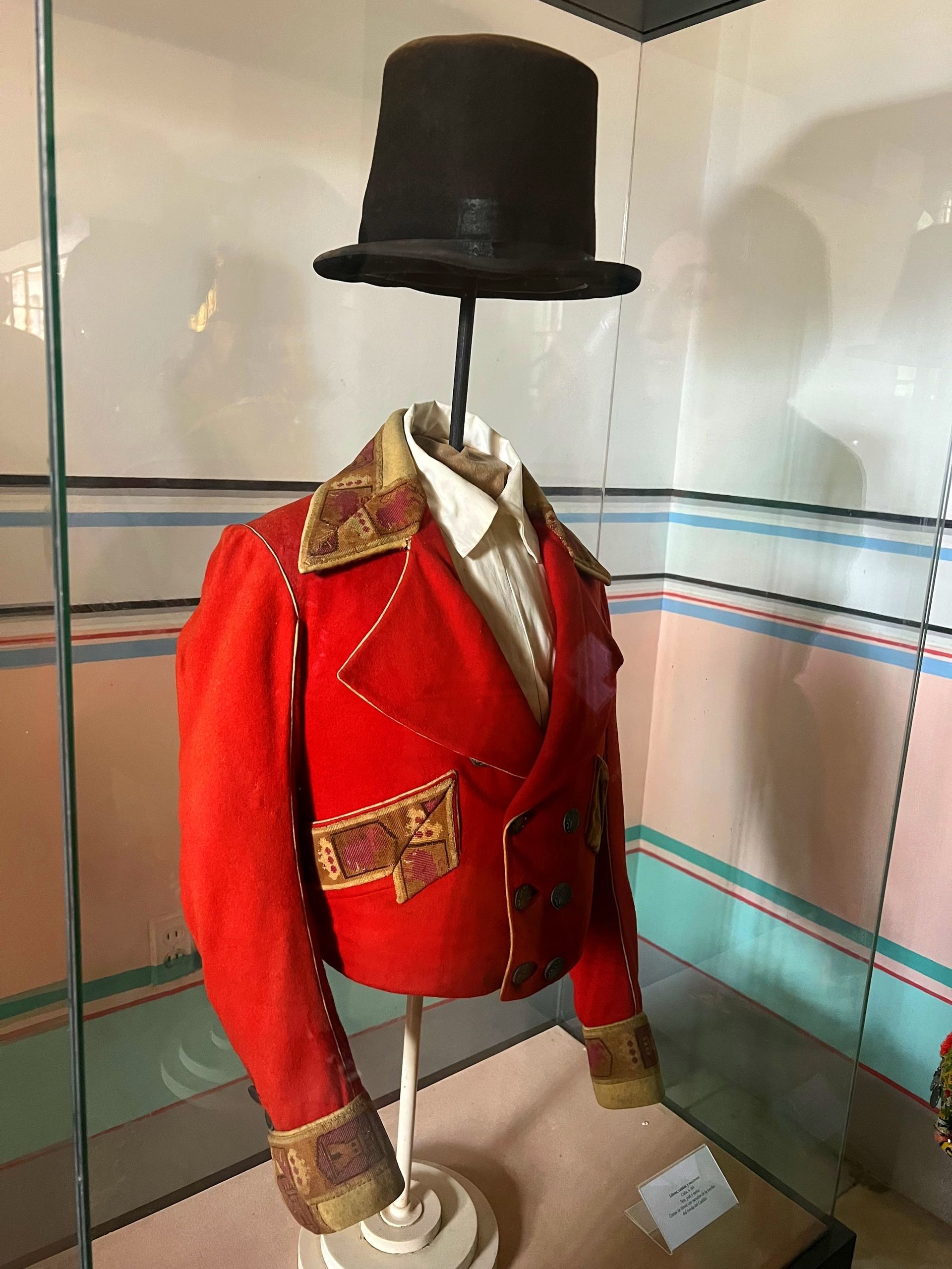 Aquí vemos la librea, camisa y sombrero de un conductor de quitrín del siglo XIX. Llevaban a los señores a los teatros, cafés y reuniones más importantes, por lo que vestían de forma muy elegante. Además, sus uniformes portaban los escudos de la familia. En concreto, en este caso, los de la familia del conde del Castillo.