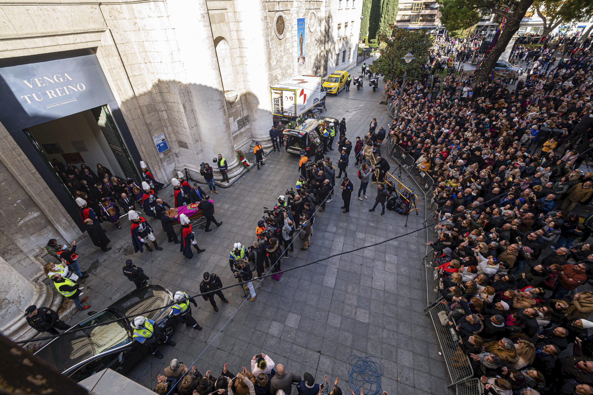 A las 12:09 horas cuando el coche fúnebre con los restos mortales de Concha Velasco ha llegado hasta la seo vallisoletana entre aplausos de quienes han acudido a despedirla y que no han podido acceder al templo, parte de ellos aguardando en la céntrica Plaza de la Universidad desde primeras horas de la mañana.