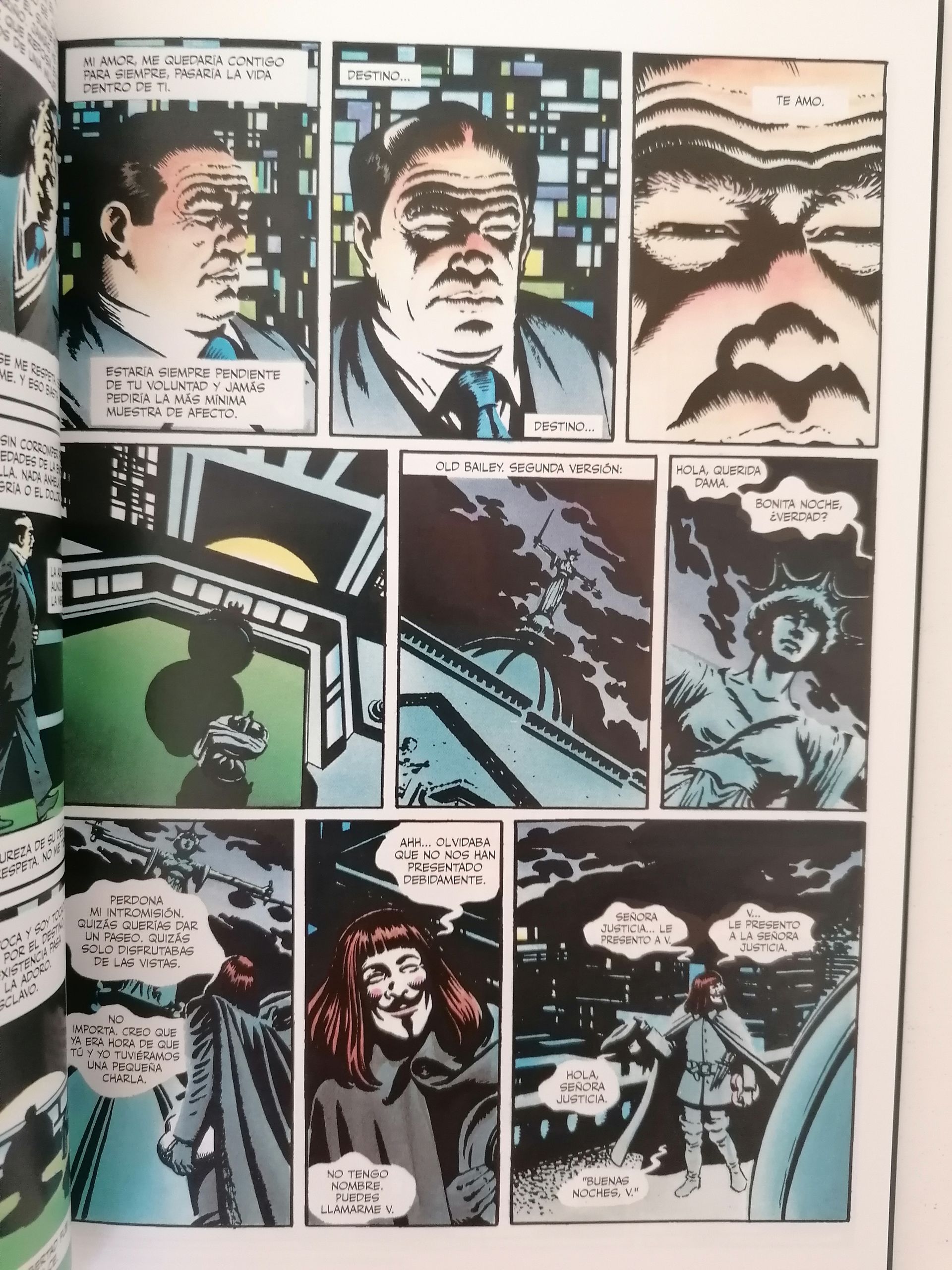 Es muy complicado hablar de V de Vendetta en apenas 1000 palabras. Muy complicado. Es un cómic tan complejo que se necesitarían horas para repasar casi todos los elementos que en su día Alan Moore fue repartiendo en píldoras a través de sus más de 250 páginas. Lo primero que hay que decir es que esta obra de mediados de los 80 que fue finalizada en los 90 se ha reeditado infinidad de veces y es lógico que se haya hecho porque es, sin duda, uno de los cómics más famosos y de mayor calidad de la historia. Ojo, eso no quiere decir que tenga que gustar a todo el mundo. De hecho, sigo manteniendo que es un cómic que necesita llegar a tu vida en un momento concreto. En un momento en el que su lectura se haga desde una madurez más desarrollada y con tus ideas y valores visiblemente marcados ya. ¿Eso hace que un adolescente no puede leerlo? No, pero es posible que le resulte más denso de lo normal si está acostumbrado a otro tipo de lectura.