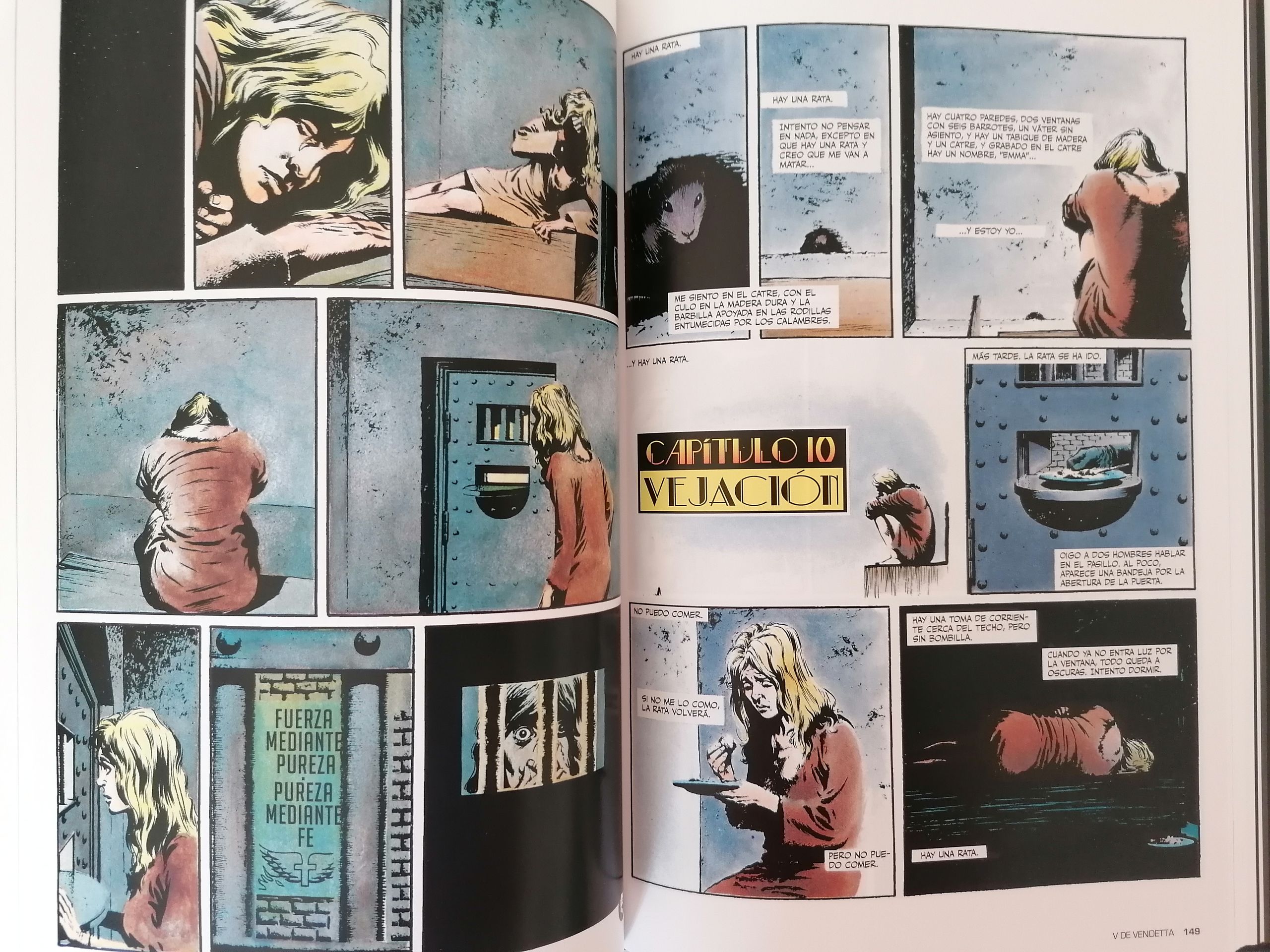 Contado el contexto y avanzado el papel de uno de los personajes importantes, el líder, vamos por supuesto con el amo y señor de la Vendetta, llamado V, y con Evey, la protagonista femenina de esta historia que, a mi parecer, llega a ser igual o más importante que el propio vengador. Vengador y terrorista, ojo, porque una cosa no quita la otra. De hecho en este cómic V es aún más puesto en la lupa que en la película y se le muestra como la parte contraria a lo que lucha, parte despreciable, pero desde una forma parecida, es decir, el extremismo. Usa extremos contra extremos, a fin de cuentas. En el cómic, V es aún más frío que en la película, aunque lógicamente eso es parte del increíble magnetismo y encanto de este vengador con máscara propenso a la teatralidad y al espectáculo. Será él el que salve a Evey de unos seres despreciables del gobierno que quieren violarla. Será él el que acoja a este joven chica que en el cómic ni trabaja en televisión ni tiene 20 años, como así reflejaba la película. Alan Moore diseño un personaje aún más frágil y la colocó como una niña de 15 años que se vio abocada a la prostitución por la desesperación que había instalada en su vida. Como pueden ver, las diferencias con la película son importantes aunque momentos estelares como el secuestro de Evey son clavados. Este es sin duda, uno de los mejores momentos del cómic, cuando la ausencia del miedo a morir le da a la protagonista su auténtica libertad. Son viñetas y momentos tan potentes que someten al lector a una reflexión obligada ante lo que acaba de ver. Eso convierte a este cómic en una obra de arte atemporal.