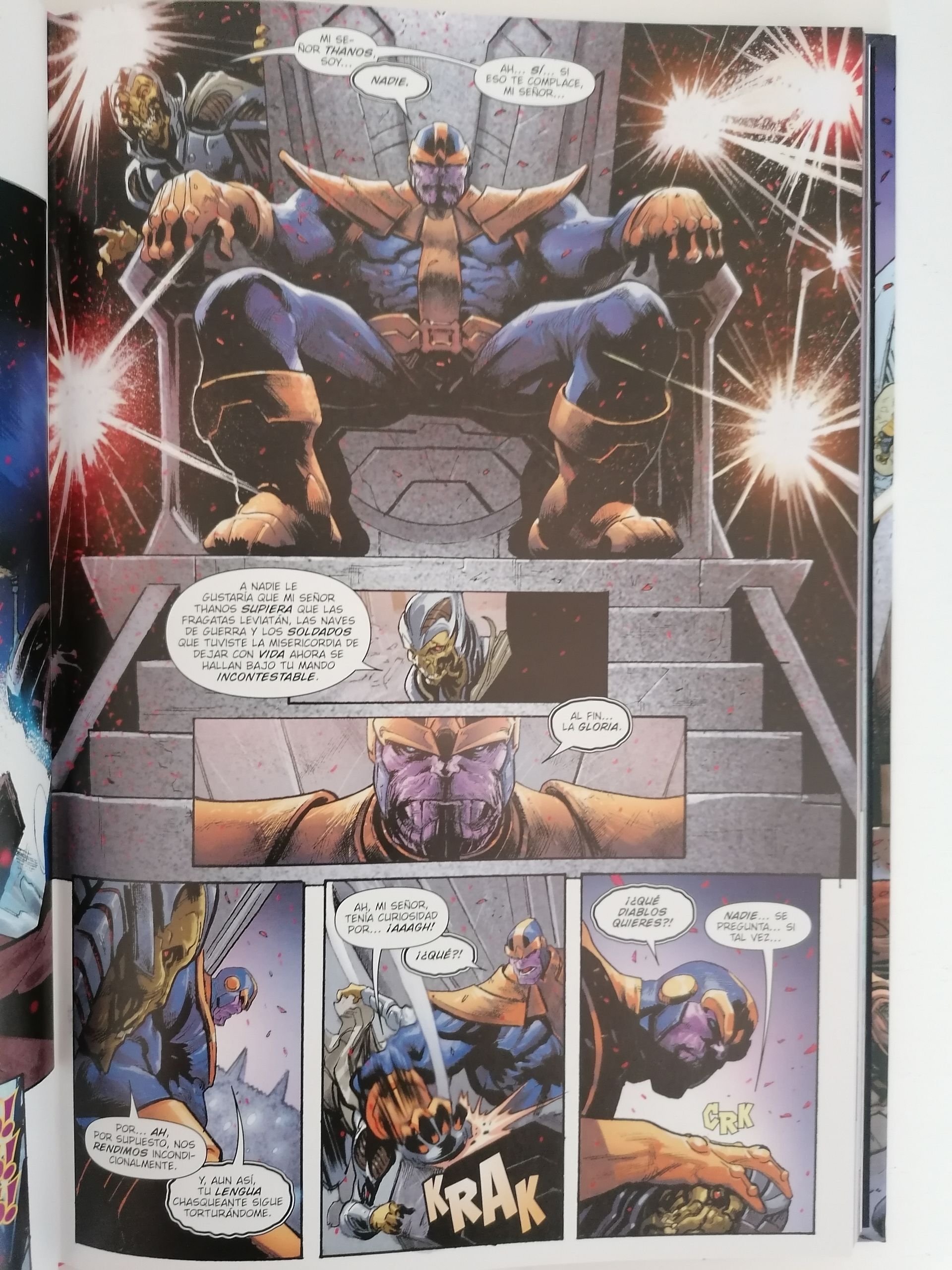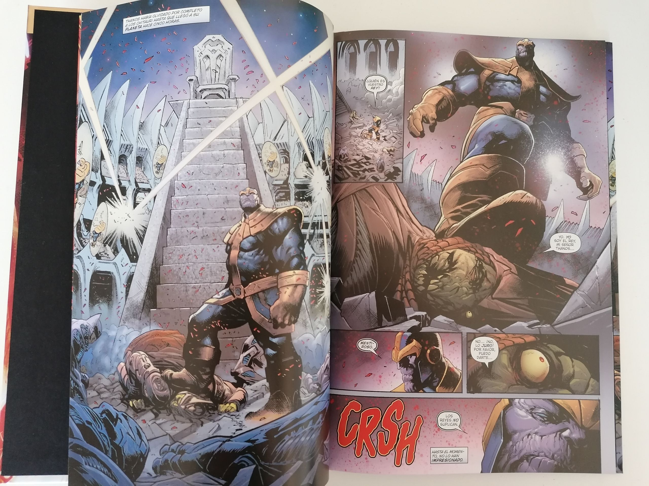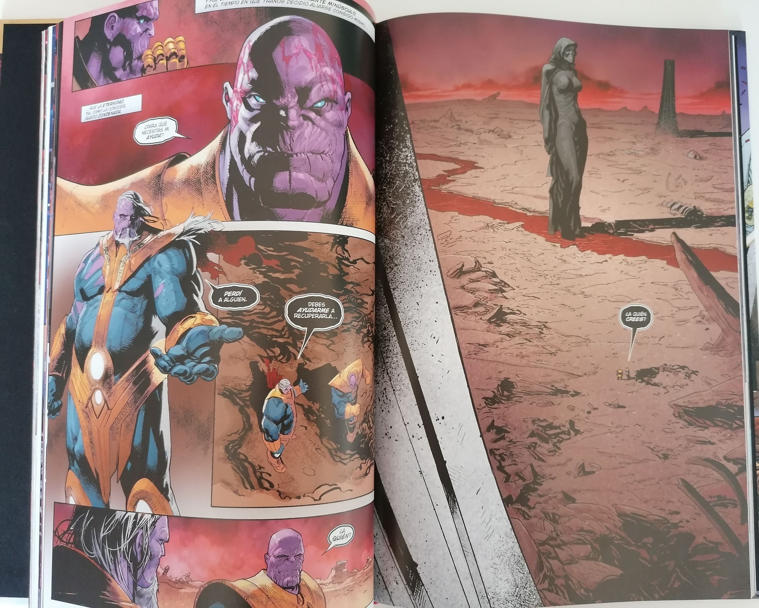 Los dos Thanos, cabezones y orgullosos como ellos solos, tendrán que unir fuerzas a regañadientes para superar el último obstáculo que separa a uno de ellos de la victoria definitiva. El triunfo que, según él, le llevará a que la muerte se enamore definitivamente de él. Sí, la muerta es una mujer. Al menos en este universo Marvel. Y Thanos está enamorado de ella. De hecho, en el cómic original de las gemas del infinito y el guantelete, Thanos quiere conquistar a la muerte más que equilibrar la galaxia matando a la mitad de la misma, como se contó en el cine. Pues bien, esta versión veterana y canosa de Thanos roza el éxito final y para rematarlo contará con su versión más joven y con un aliado inesperado y espectacular.