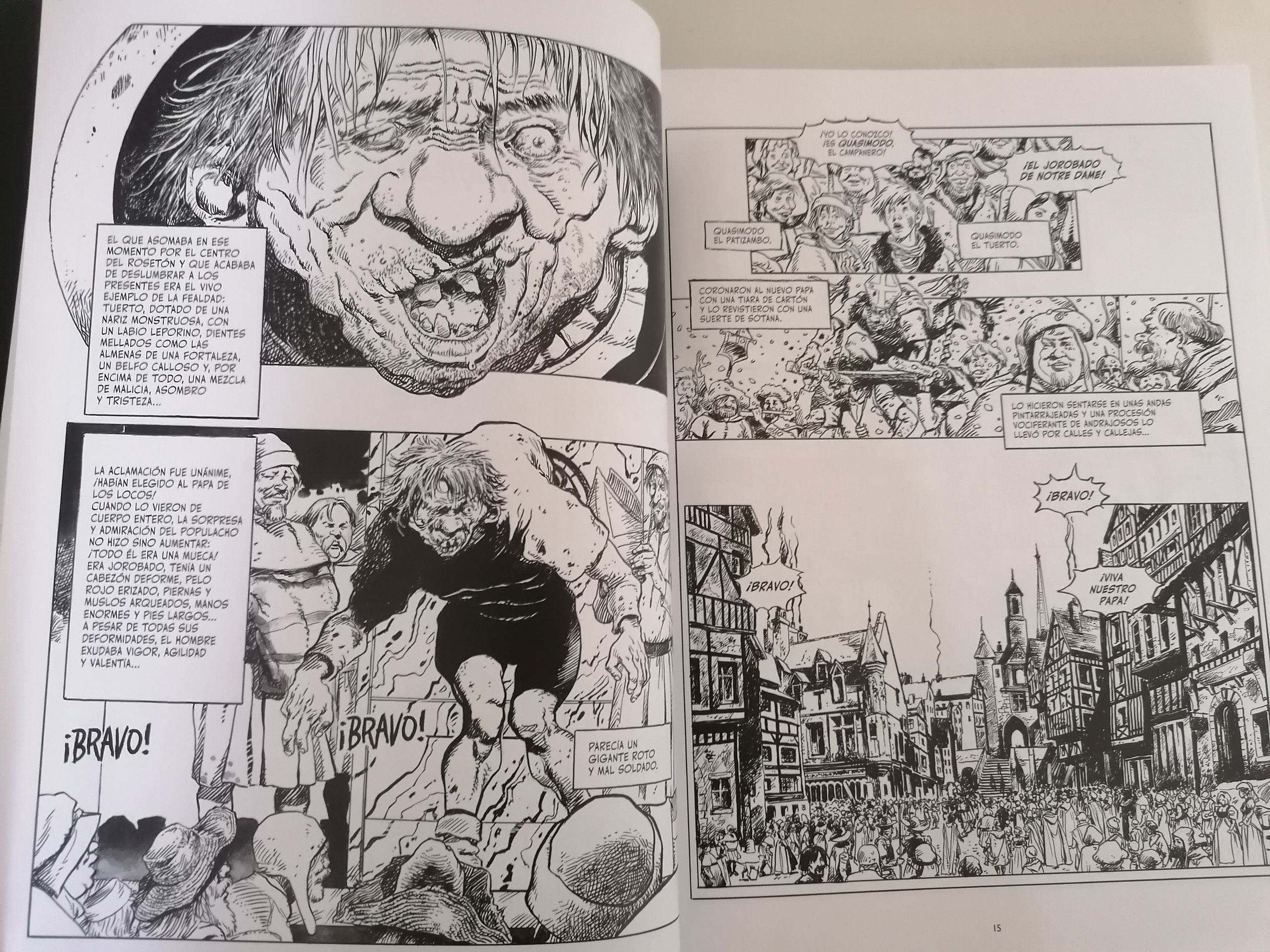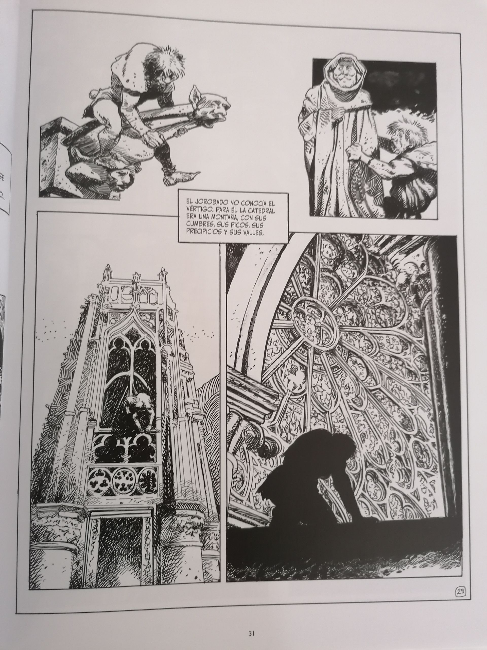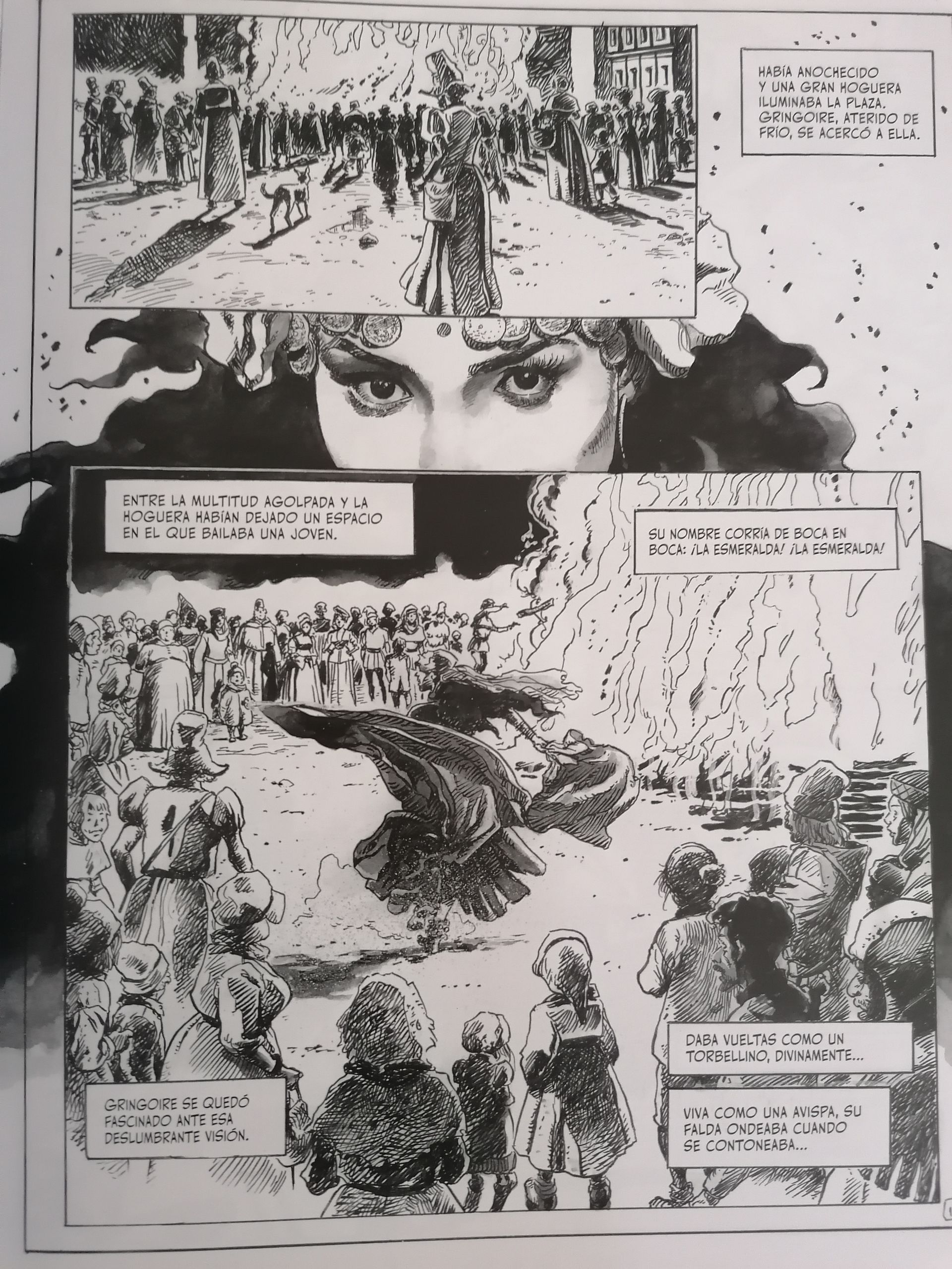 En estas imágenes que os acabo de dejar aquí se puede ver no solo un dibujo sobresaliente sino un entintado a mano de una maestría titánica. Igual que la capacidad del autor de reflejar la belleza de Esmeralda a través de una simple mirada, la vulnerabilidad y tragedia de la fealdad de Quasimodo o la ira y maldad del religioso Frollo. Brutales todos ellos.