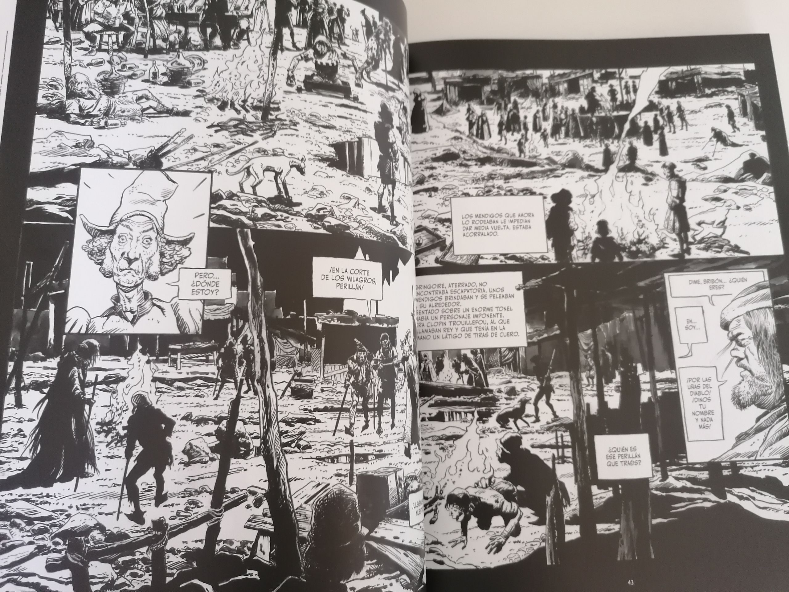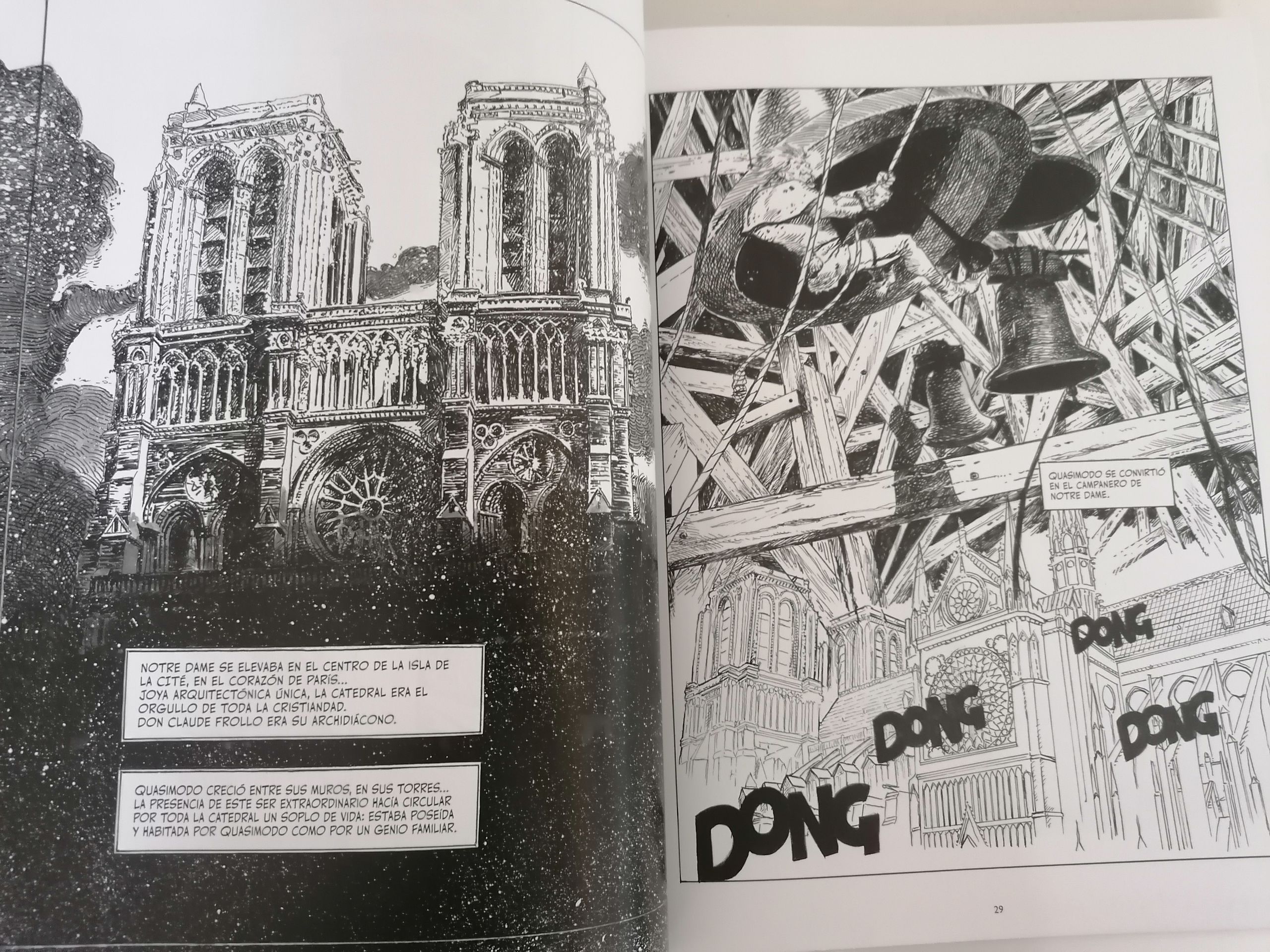 Bess adapta la obra de Victor Hugo con la contundencia y belleza que merece. Belleza y fealdad, ojo, porque aunque el dibujo de Bess sea colosal lo que refleja en muchas ocasiones es horrible, decadente y extremadamente cruel. A través de capítulos, ligeramente cortos, Bess avanza a través de la obra de Victor Hugo con una narrativa cuidada, pero muy ligera. Usando muchos planos generales para mostrar esa París del Siglo XV que maravillaba y apestaba a partes iguales. El dibujo es tan espectacular que el ritmo de lectura se ve condicionado por él o, como mínimo, te obliga a pausas más largas de lo normal para apreciar todos los detalles que se muestran en las viñetas y en las splash pages que nos ofrece.