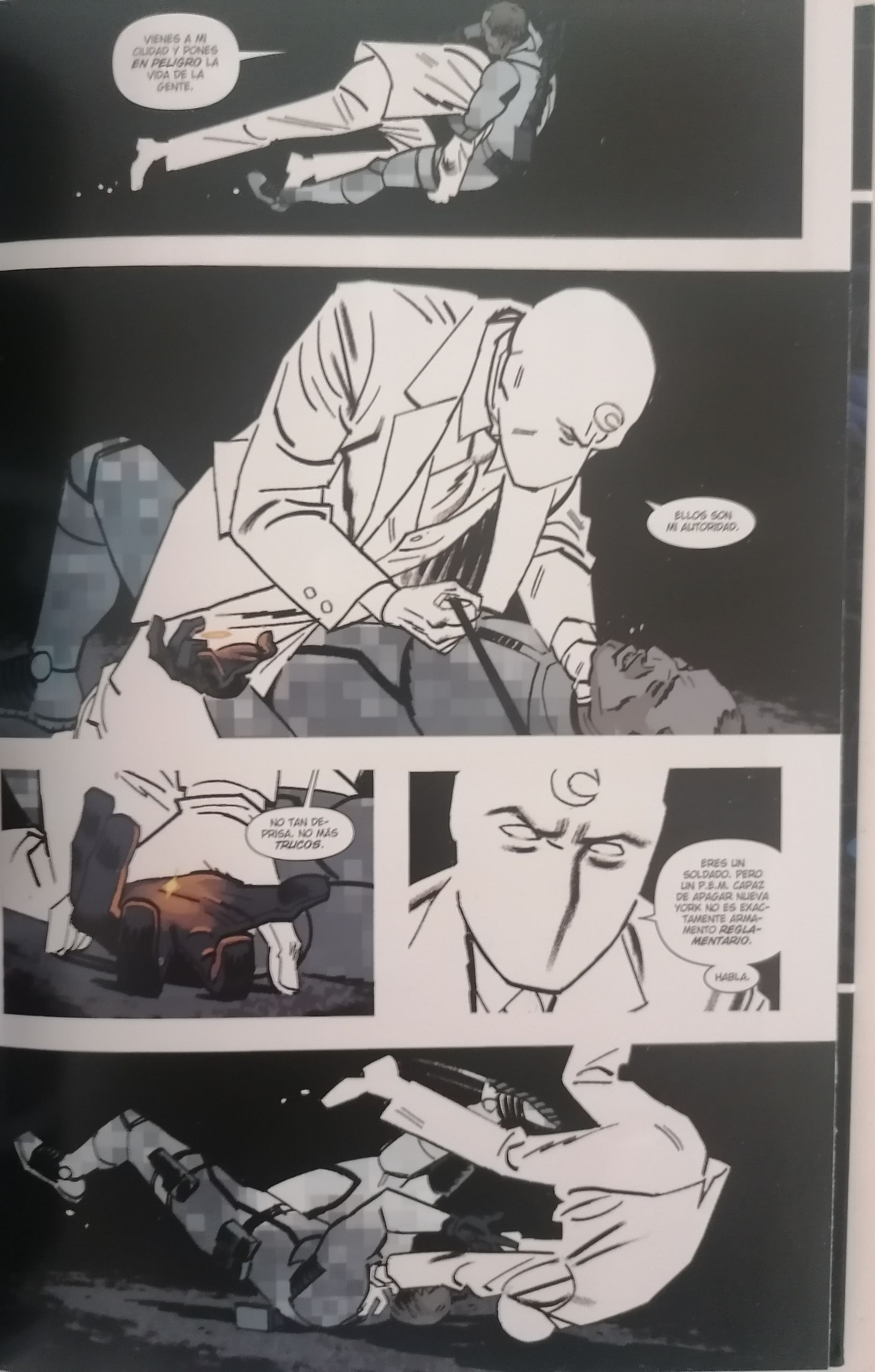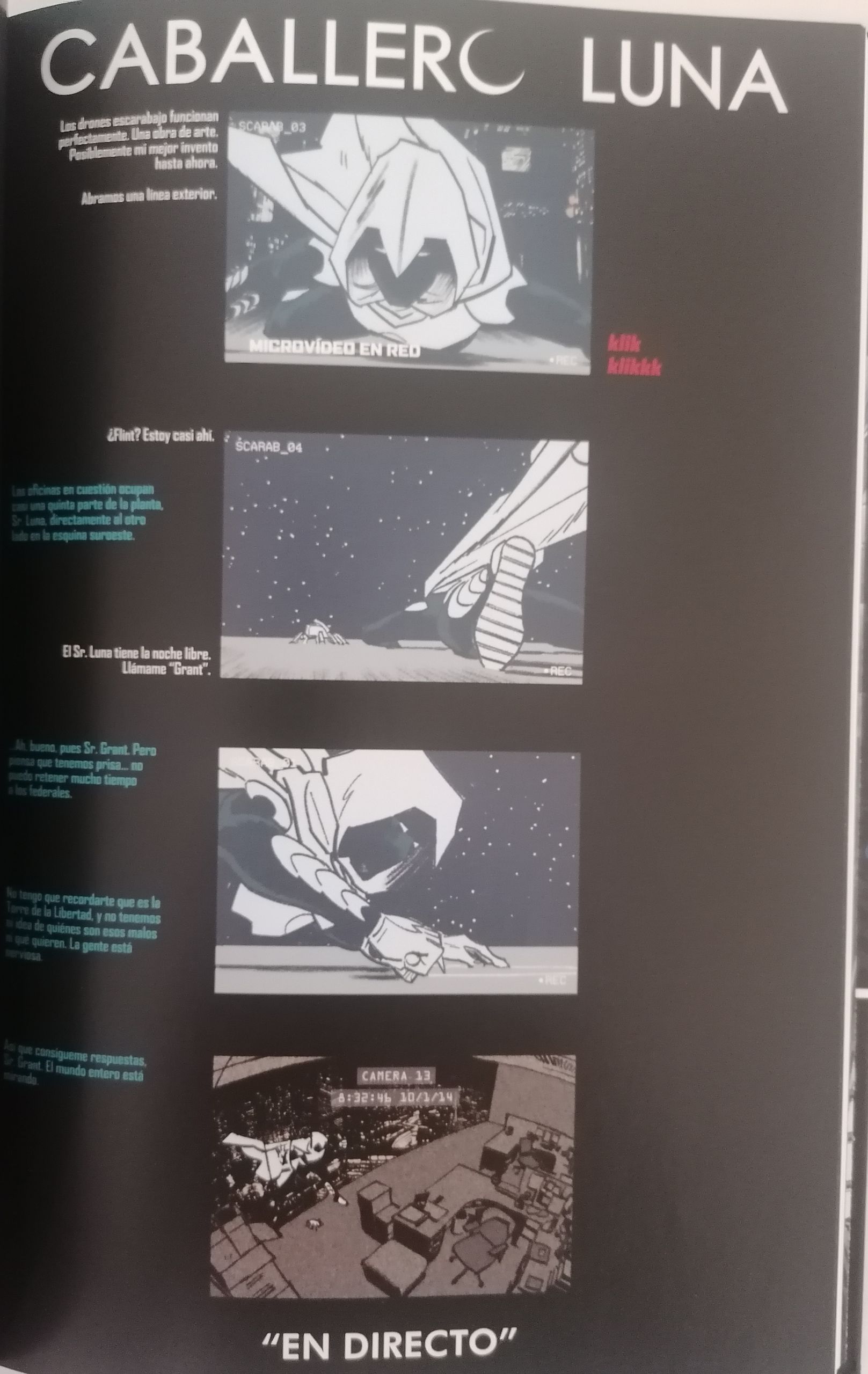 He elogiado tanto a Smallwood, pero tengo pruebas que sirven para confirmar lo que digo. Y las tenemos todas aquí en este tomo, porque Greg, que recoge un notable guion de Brian Wood en el que el Caballero Luna será traicionado y casi a lo Jason Bourne deberá recuperarse de ello, realiza un impresionante trabajo de narración visual con recursos de todo tipo. Entre sus armas, Smallwood nos dará una grapa entera en la que veremos todo lo que sucede a través de cámaras de vídeo o de seguridad en pleno edificio de la Libertad en Nueva York. Solo por ese episodio vale la pena esta cómic. Es espectacular y demuestra la calidad del que lo cuenta y del que lo dibuja.