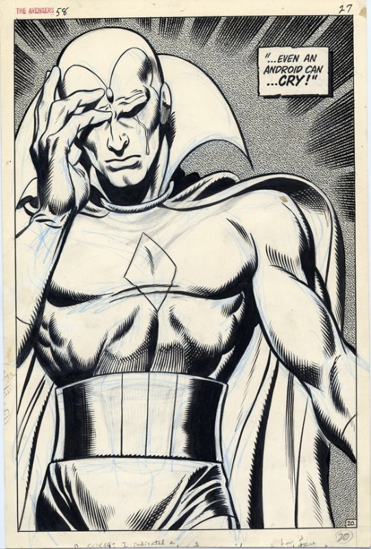 Avengers #58, página 20. John Buscema & Tom Palmer, 1968. Página final de la segunda aparición de Visión. Esta icónica pieza de John Buscema se ha convertido desde entonces en la imagen individual más famosa del héroe androide de Marvel.