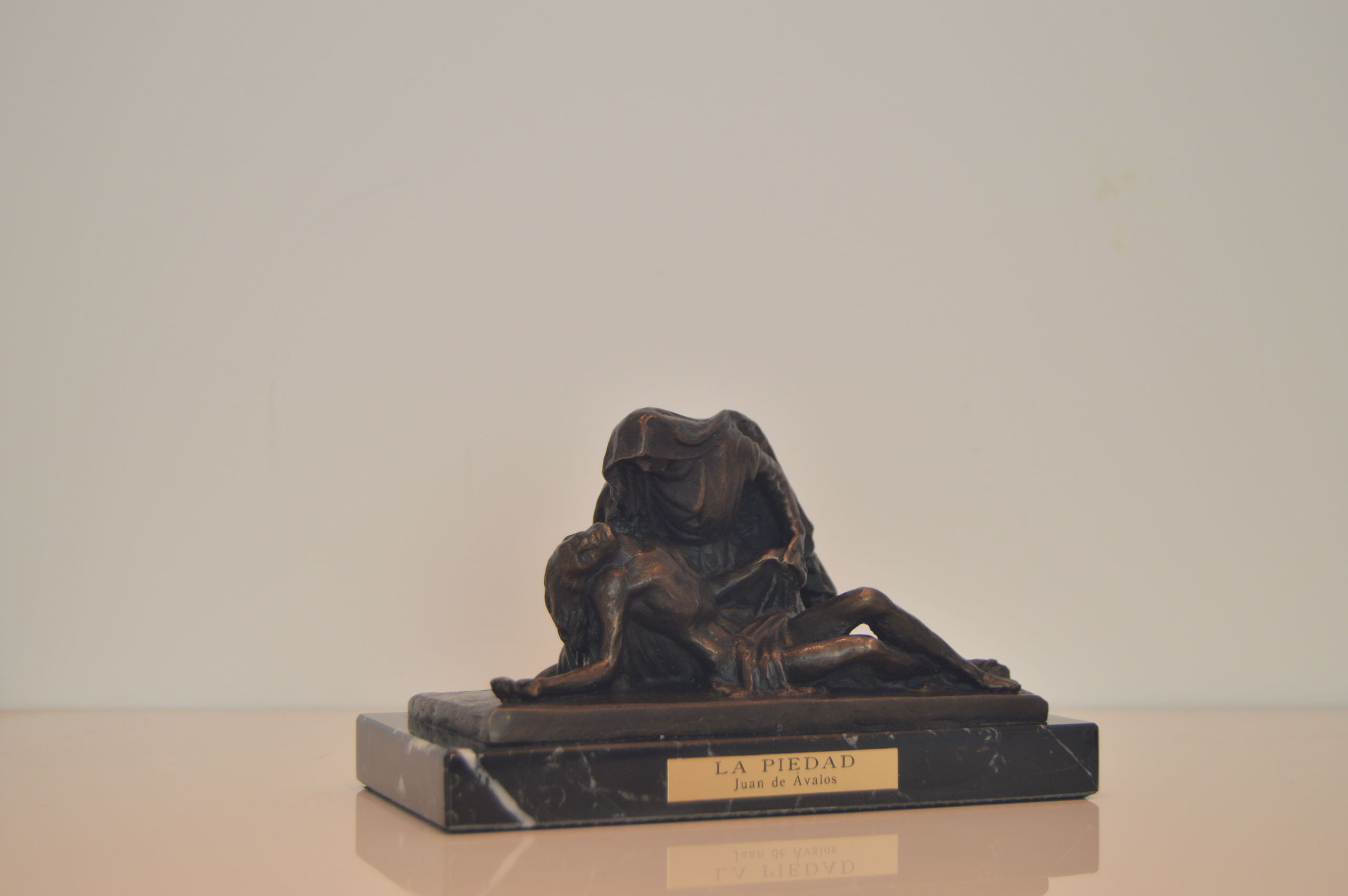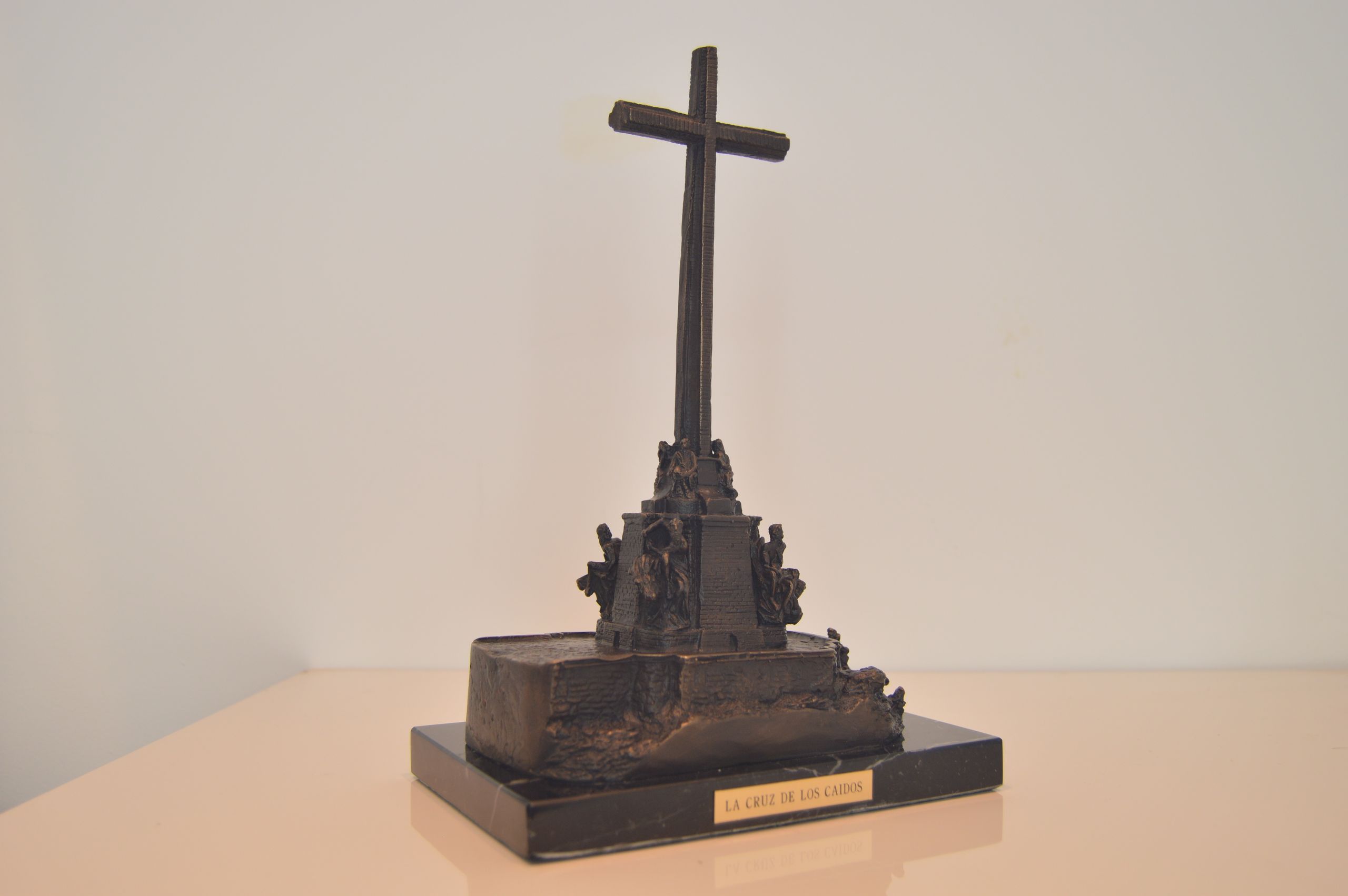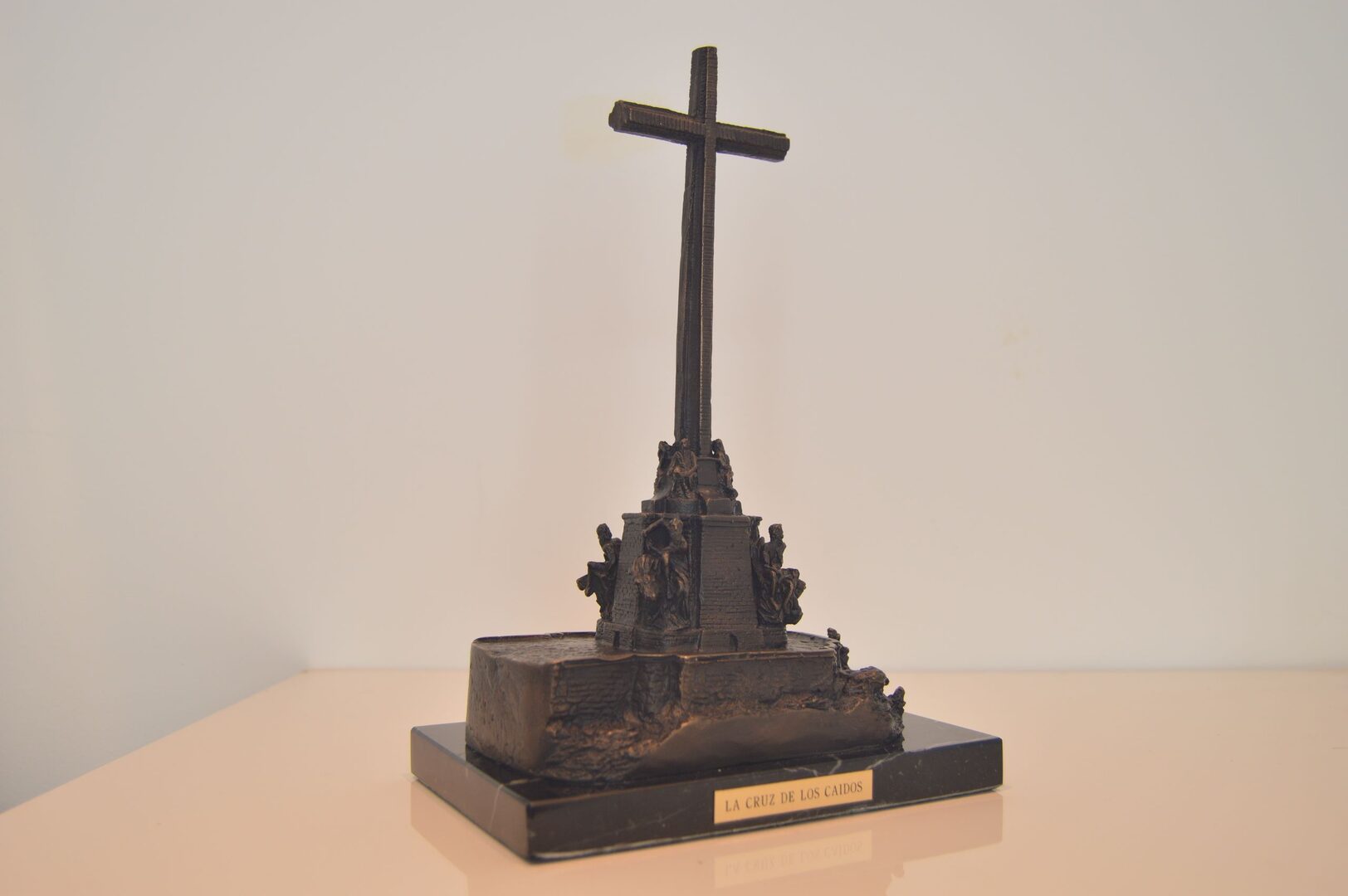 En un tamaño sumamente atractivo y, como es costumbre, con una exquisita realización de sus esculturas en bronce, ofrece en esta ocasión la representación de La cruz y de La Piedad del valle de Cuelgamuros.