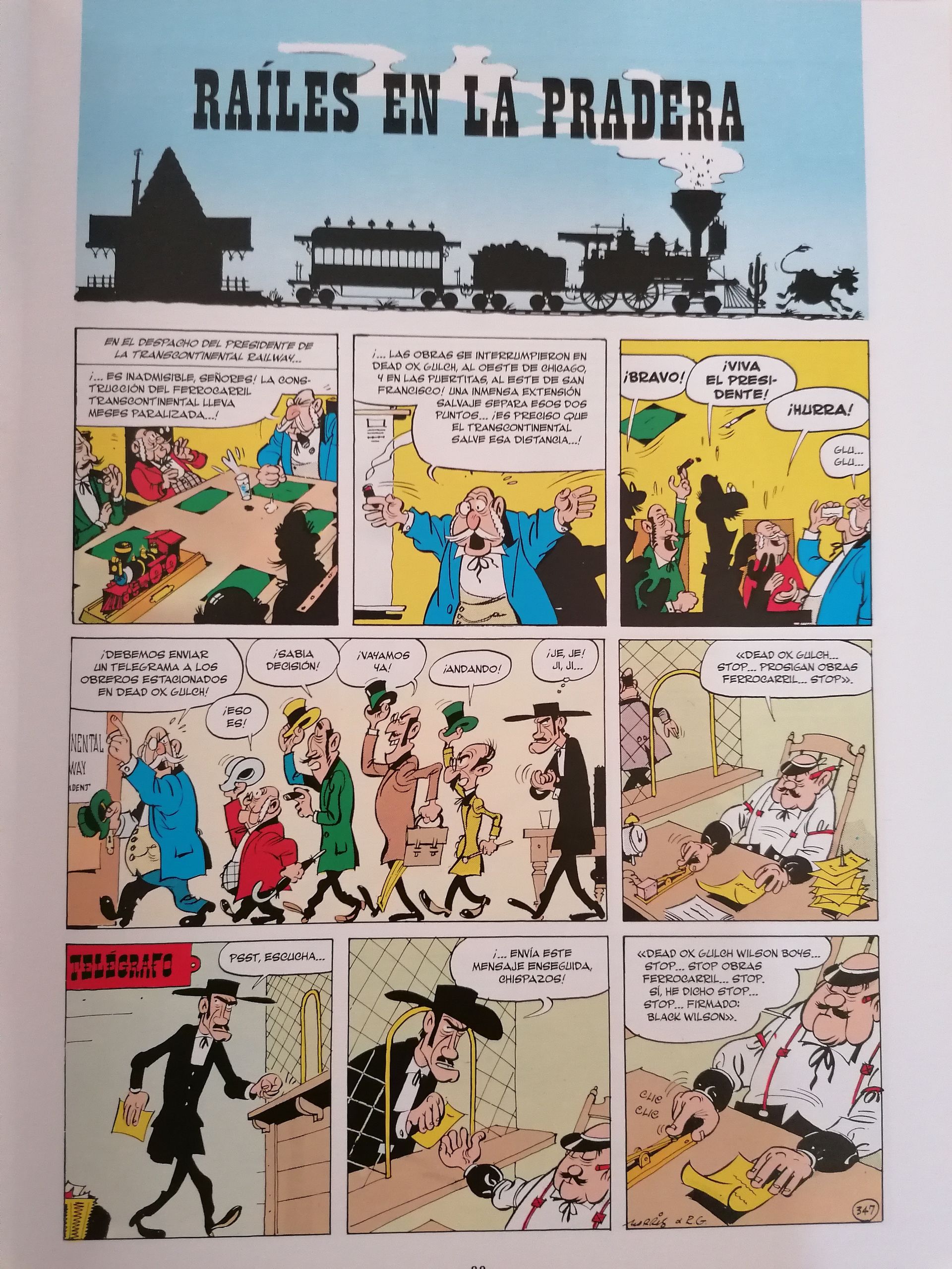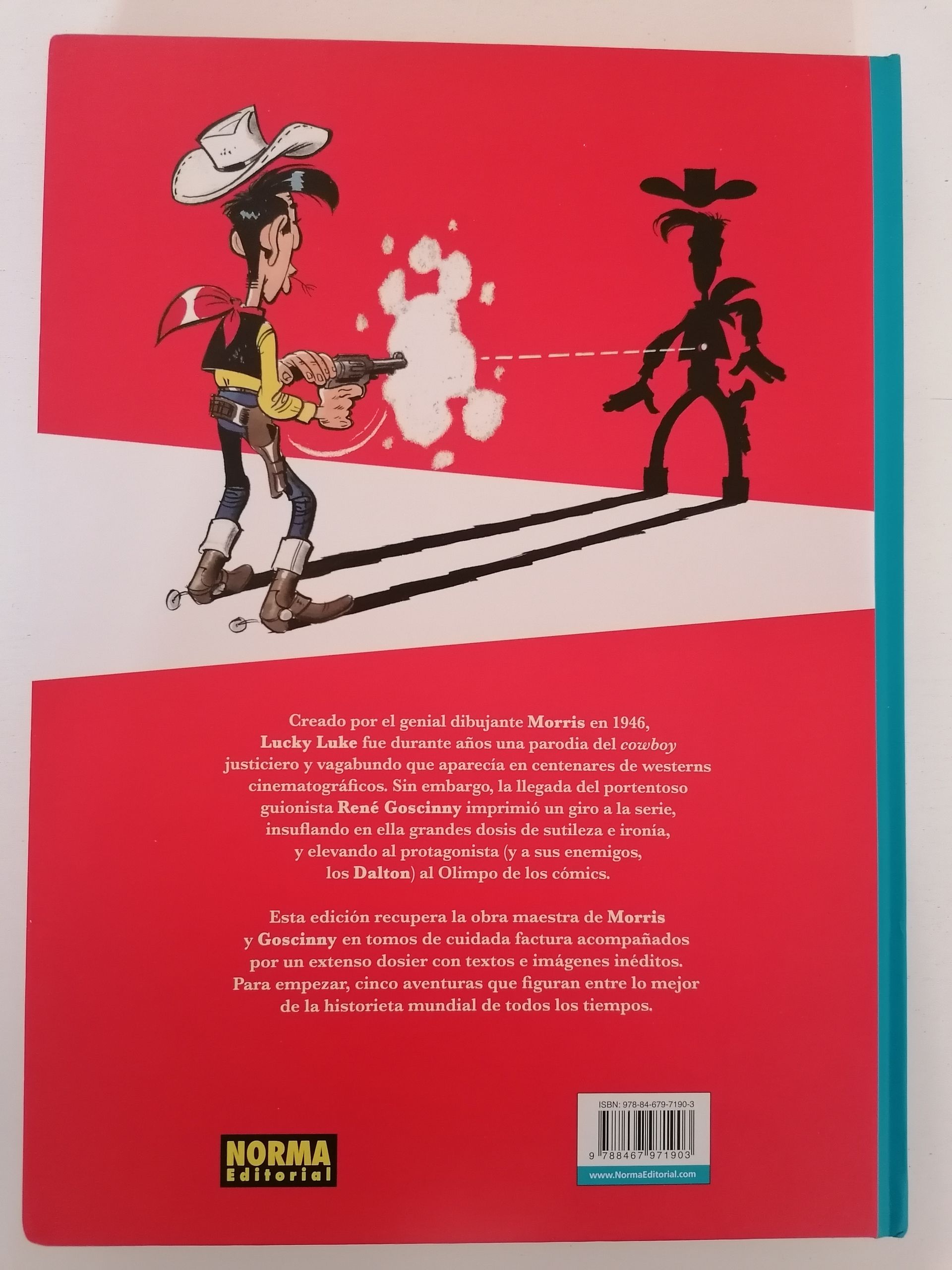 Por lo demás y por si alguien aún no sabe de qué van las historia de Lucky Luke, lo resumo fácilmente: todo lo que se pueden imaginar del western, lo tienen aquí con un tono de humor que ha marcado a generaciones de lectores. Lucky es un vaquero chuleta y buena gente que hará justicia en todo tipo de situaciones y ante forajidos de diversa índole. Los hermanos Dalton son los más conocidos, pero hay muchos más enemigos que intentarán imponer su ley o la ausencia de la misma en la construcción de ferrocarriles y demás clichés del género que por mucho que se repitan siempre son entretenidos. El sentido del humor es una de las señas de identidad de estos cómics y su influencia a lo largo de los años en otros tebeos, en el cine o en la literatura se sigue estudiando debido a su importancia.