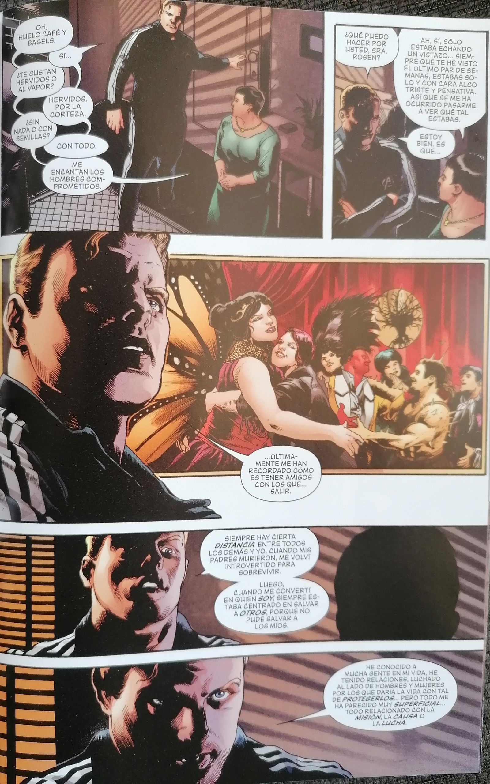 La verdad es que estoy confuso con esta cabecera. Me encantó el primer tercio de la misma con una historia dividida entre pasado y presente que tenía la juventud de Steve Rogers, los nazis y los demonios como principales protagonistas. En el segundo, el del cabaret, no he salido enfadado, pero sí un poco decepcionado y ahora en esta transición me queda el regusto de no saber a dónde quiere llevar Straczynski esta etapa del centinela de la libertad. De hecho no sé muy bien si el propio Straczynski lo tiene claro o se ha quedado a medias durante el proceso por decisiones editoriales. Tiene algún que otro momento interesante de acción, pero no termino de verle la espectacularidad al conjunto.