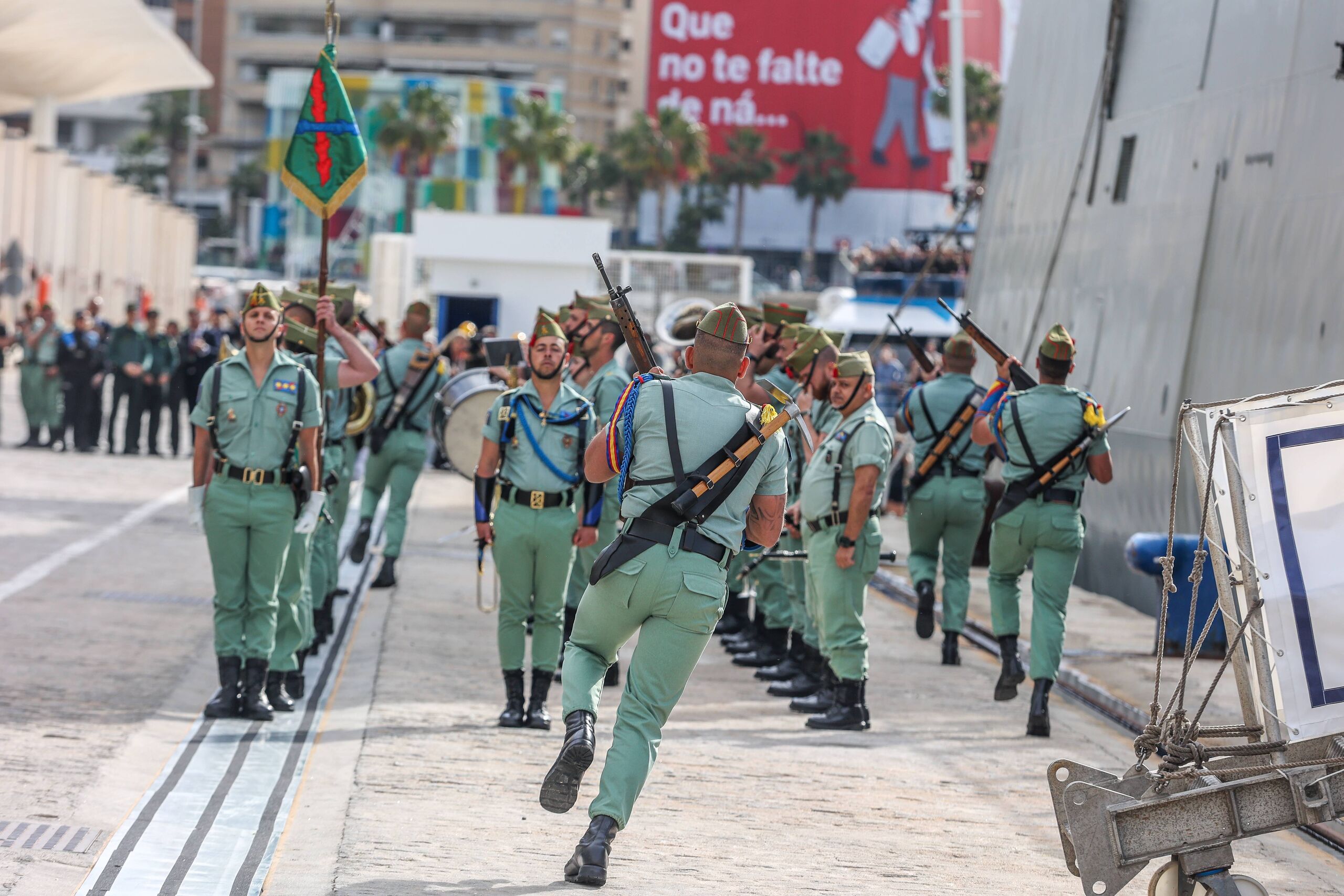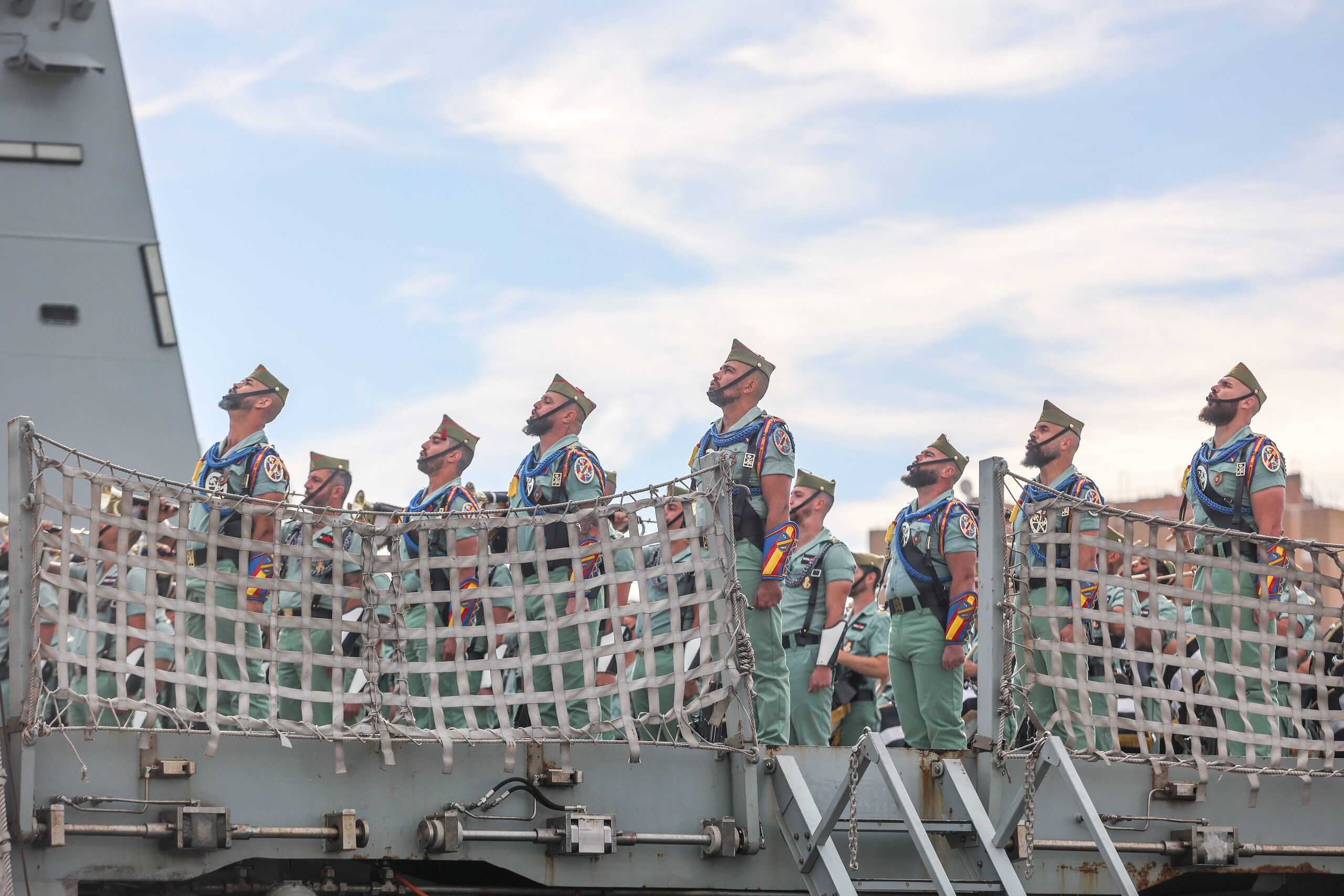 A las 10:08 el Furor quedaba atracado y comenzaba el despliegue de la pasarela. En el muelle esperaban las autoridades. A las 10:30 descendía el último legionario y se completaba la formación. El público estallaba en aplausos y vítores al grito de “¡Viva la Legión!”.