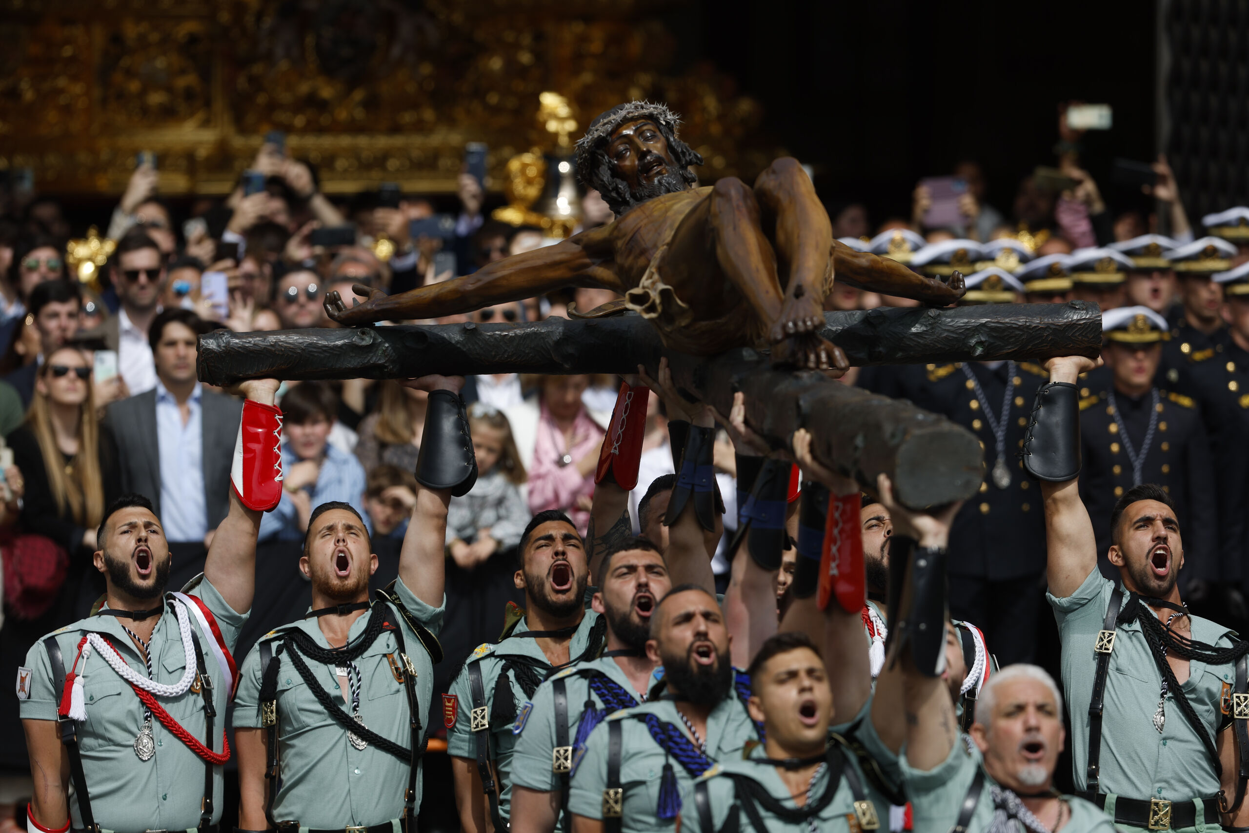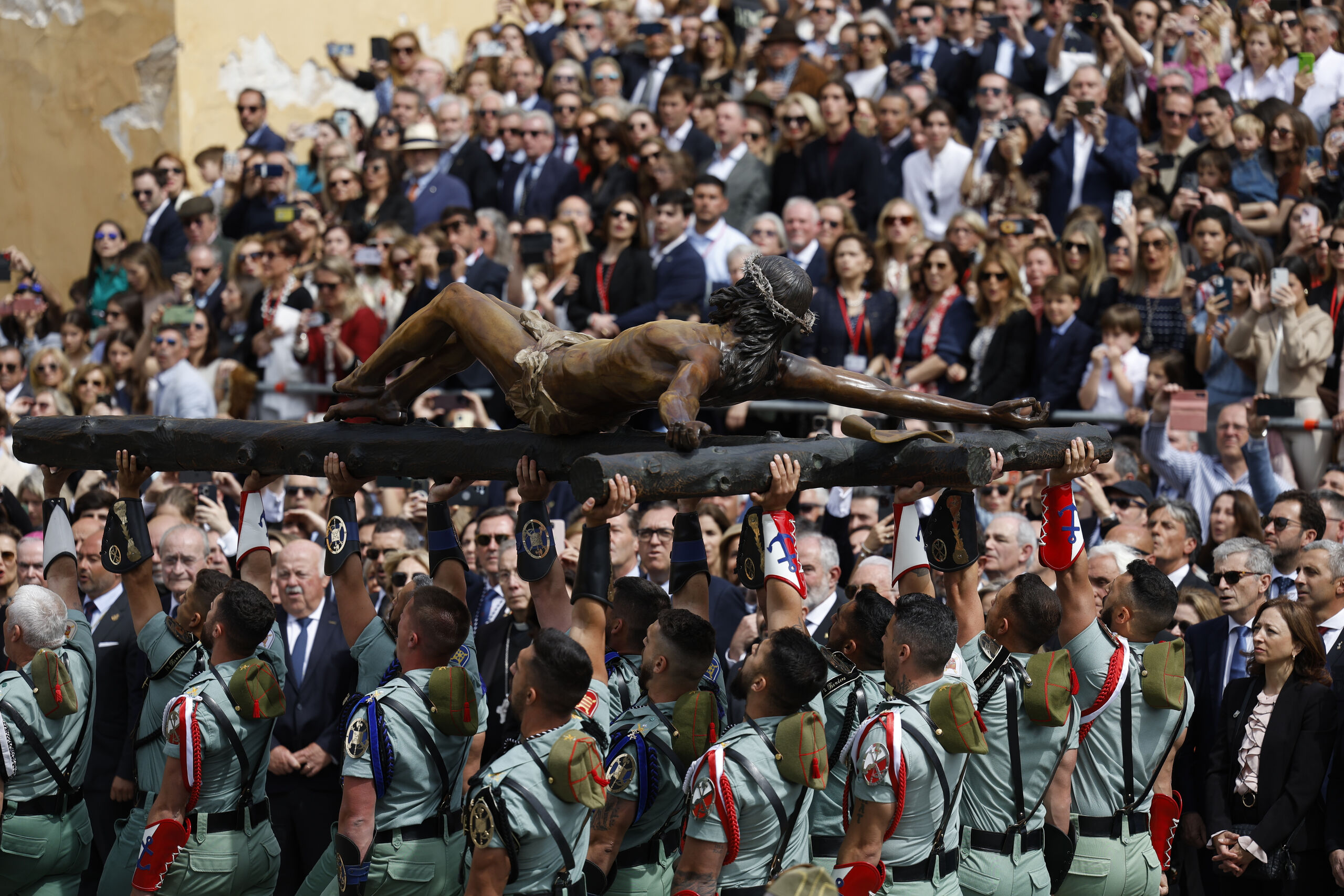 El desembarco de la Legión en el Puerto de Málaga marca el inicio del traslado del Cristo de Mena, que desfila por las calles de la ciudad andaluza en uno de los momentos más emotivos de la Semana Santa.