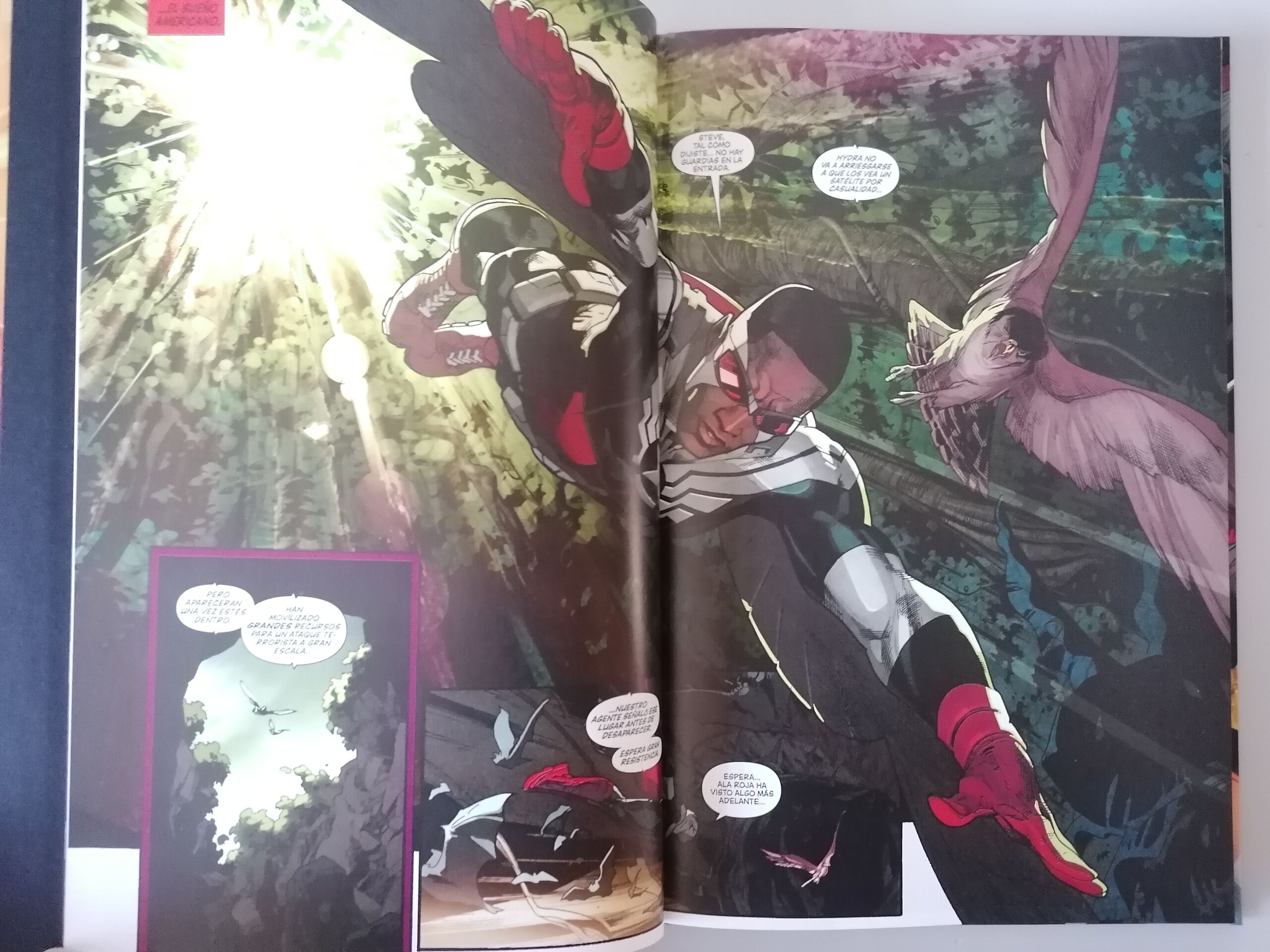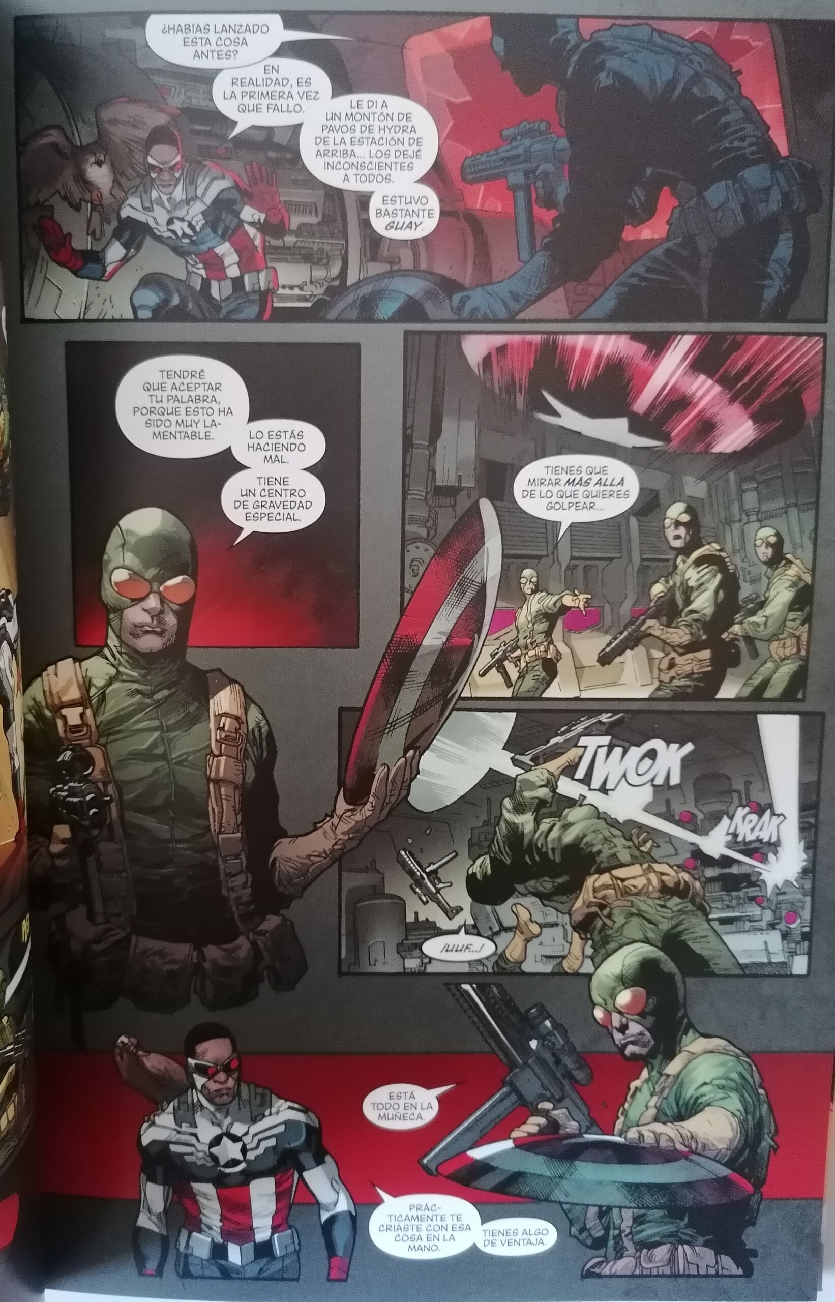 A nivel argumental estamos sobre todo ante un blockbuster de muchísima acción muy bien llevado por el dibujo de Immonen, pero hay algo más. Remender sabe combinar muy bien grandes escenas de acción aérea y terrestre sin olvidarse de darle capas a nuestro protagonista por el camino. A base de pinceladas y momentos de diálogo entre héroe y villanos, Remender consigue que el lector entienda y empatice con Sam y ahí sube la nota media del cómic. Es una historia tremendamente divertida a base de acción aunque no se queda solo en eso y ofrece algo más alrededor de las motivaciones y miedos de nuestro nuevo Capitán.