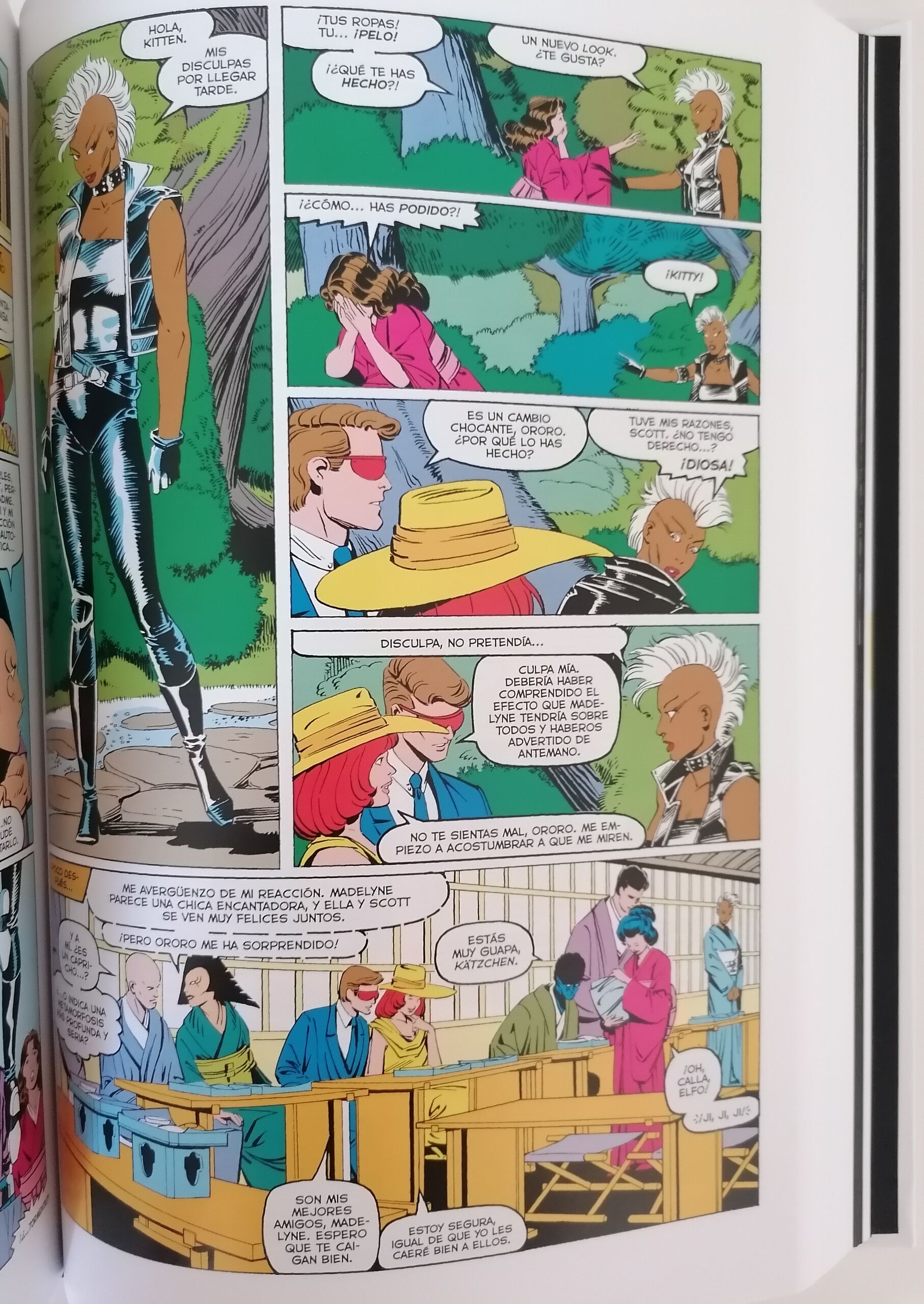 Como conté en las anteriores reseñas de estos omibuses, lo mejor de esta era aparte de la calidad en el dibujo, el entretenimiento y los hitos históricos que marcó Claremont es que el guionista estadounidense logró tejer una tela de araña, mitad familia, mitad culebrón, que desarrolló muchísimo el sino de cada personaje. Todos tienen su espacio y con más o menos detalles, Claremont supo darles a todos un espacio importante. Un ejemplo mejor, pero que se volvió histórico: aquí veremos a Tormenta pasar de su pelo largo y al viento a su toque más punk y macarra. Puede parecer una tontería, pero es simple cambio desarrolla aún más al personaje y además se vuelve simbólico y referencial a nivel de diseño.
