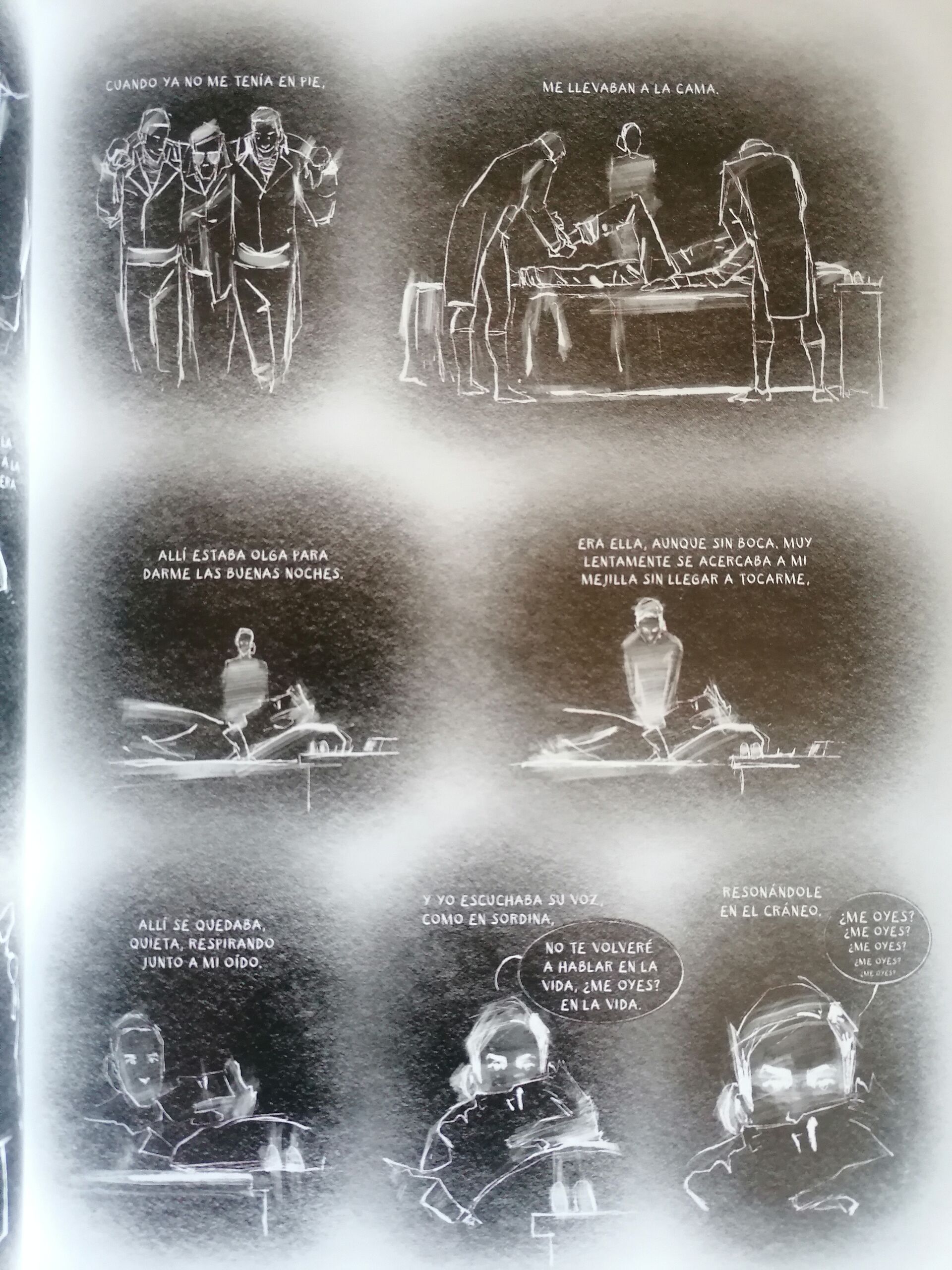 A nivel artístico, la cantidad de virguerías narrativas es tremenda con el uso de esquemas, planos, esbozos en blanco y negro para los momentos oníricos etc etc etc. Y el color. Un gran uso de los colores cálidos y fríos para reflejar, a veces sin palabras, lo que se quiere transmitir. Enhorabuena a Juan por su excelente trabajo ya que logra tener diferentes estilos de cómic en uno solo sin perder nunca de vista el tono reflexivo y oscuro del mismo. Se puede ir a extremos muy diferentes a nivel de composición, color o estilo de dibujo, pero siempre con el objetivo claro de lo que se está contando. Nunca es fácil hacer funambulismo de esta forma y tanto Javier como Juan se mantienen firmes sobre la cuerda en todo momento.