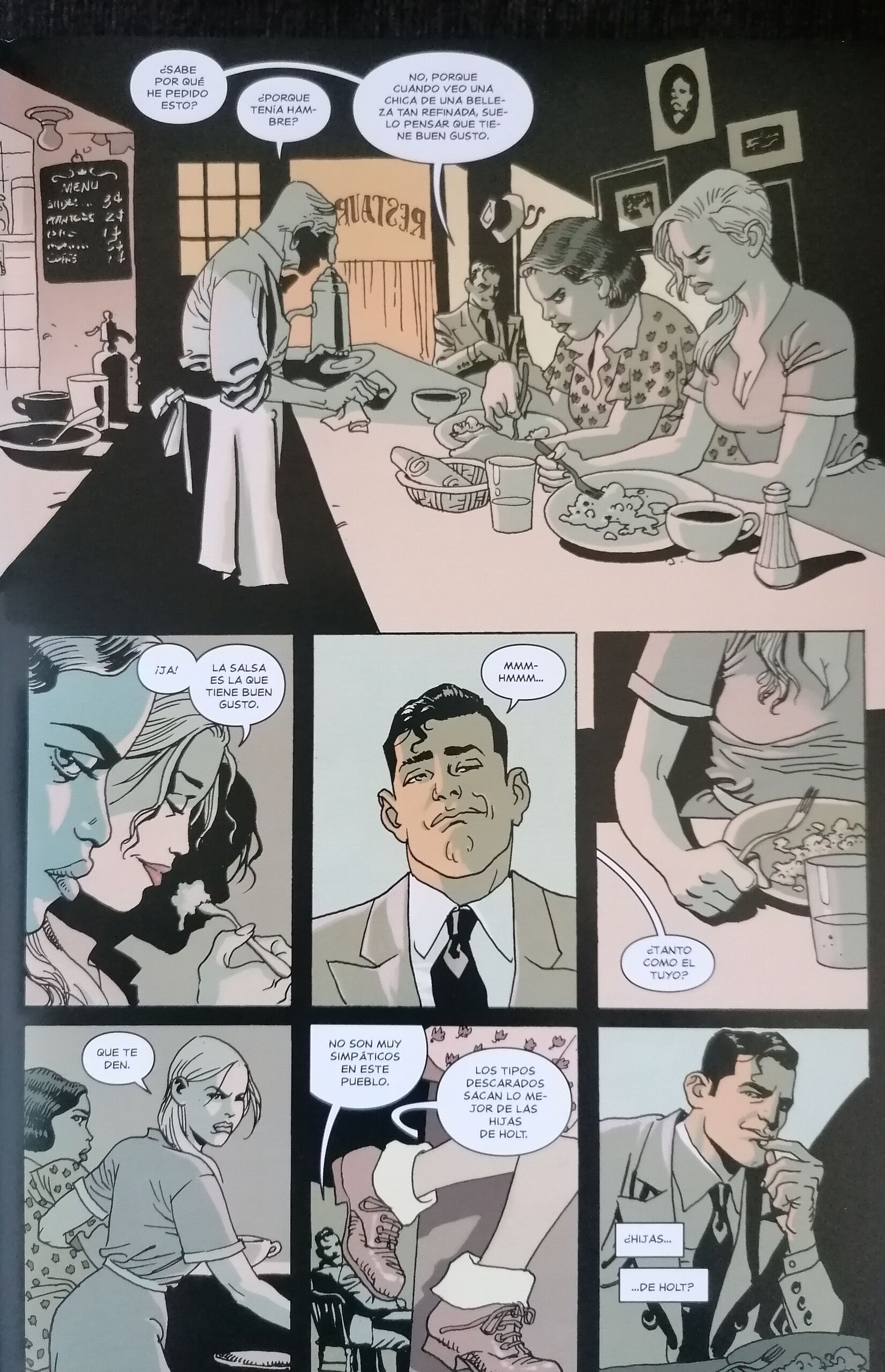 Sin duda lo mejor del cómic más allá de la trama principal son los personajes. A Lou Pirlo le coges rápidamente cariño cuando ves la cantidad de palizas que se lleva el pobre por no saber dónde narices se está metiendo. Es el típico personaje clásico de película de mafiosos. Joven, rebelde, canalla, inocente en ocasiones y capaz de perderse en el infierno por el cuerpo de una mujer. Además tenemos a la familia de pueblerinos en la que cada uno de ellos tiene lo suyo. Vaya panda de personajes. Desde el padre a la madre, pasando por los hermanos grandes y pequeños y por supuesto llegando a la femme fatale de esta historia. Además, hay una niña pequeña en el pueblo que al principio parece dulce y luego saca a relucir todo el racismo que había en esa época en contextos como ese. Azzarello crea una telaraña de personajes espectacular con la que consigue transmitir todas y cada una de las actitudes que se tenían en aquella época.