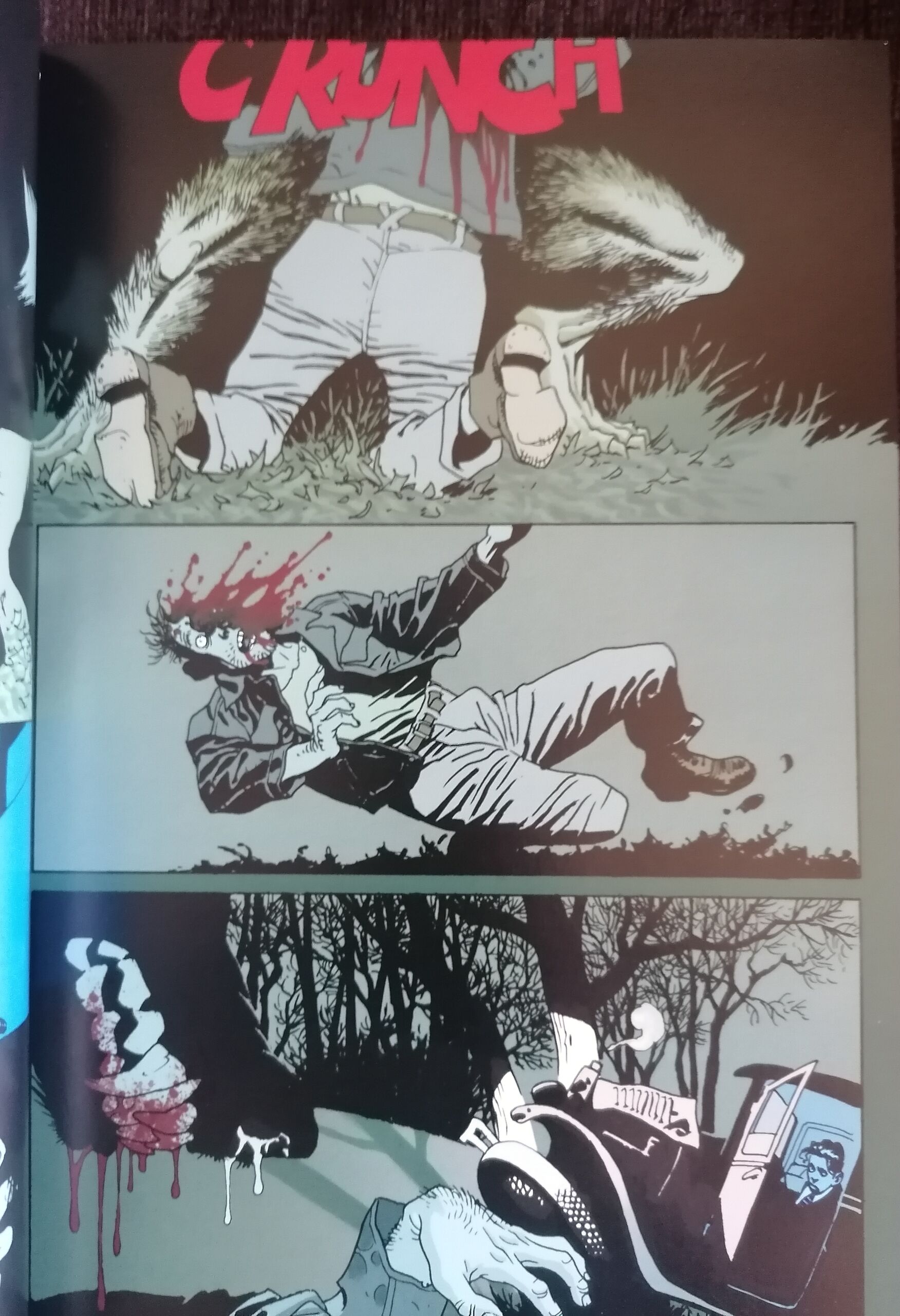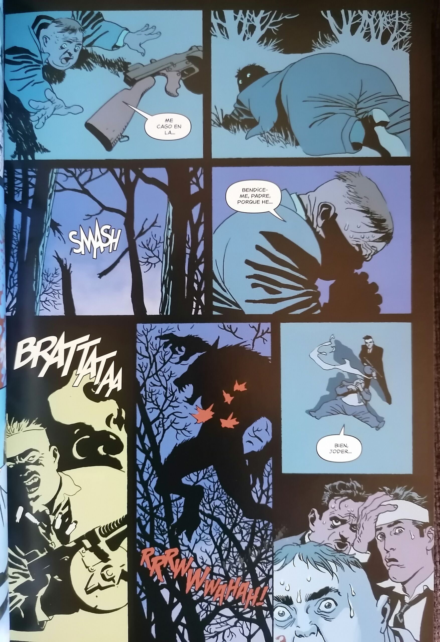 Volviendo al guion, fluido y con mucho ritmo, no puedo calificar este cómic como una historia de terror. Sobrenatural quizá. Porque los hombres lobo son solo una forma de dar cuerpo a la oscuridad que mueven los intereses personales de cada individuo. Azzarello los usa desde un aspecto metafórico aunque es innegable que le dan a la historia un toque sangriento espectacular. Si ya de por sí con la mafia siempre tenemos grandes momentos de tiroteos, ajustes de cuenta o persecuciones en coche, Moonshine incorpora ese elemento sobrenatural que sube aún más la apuesta de la violencia que ya de por sí se intuye en un argumento así.